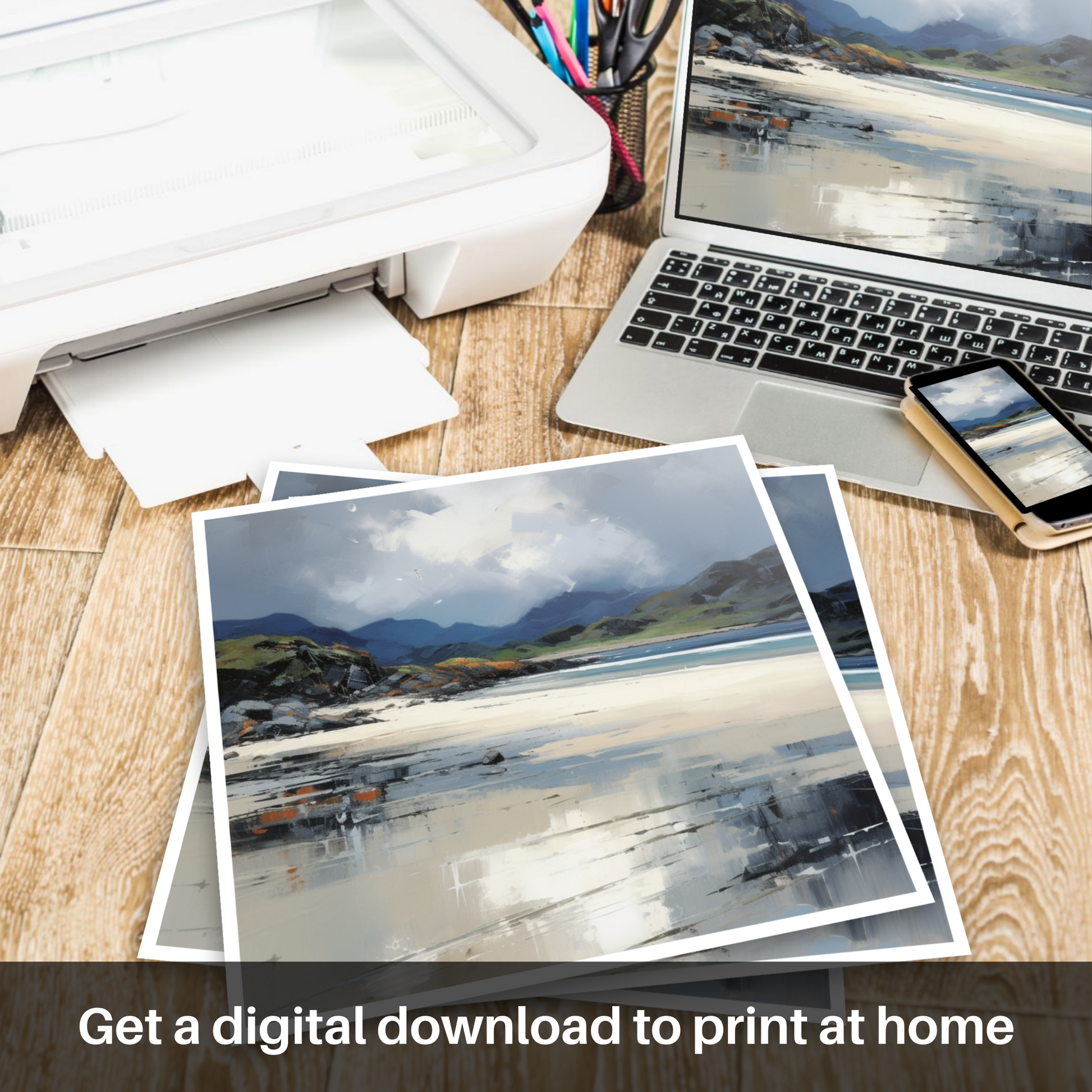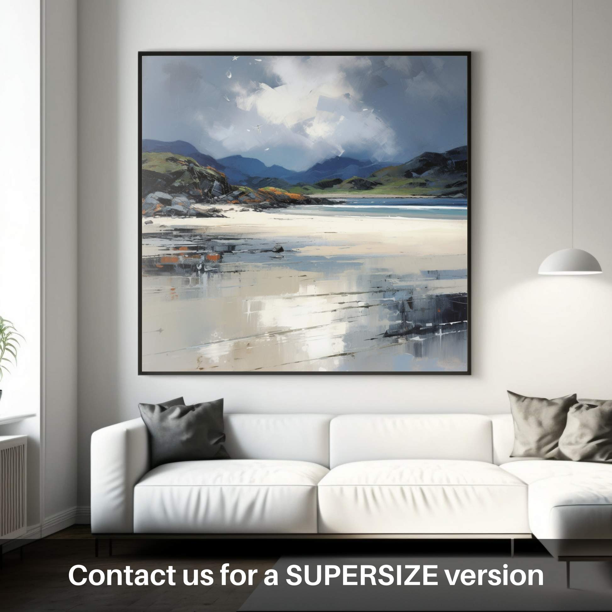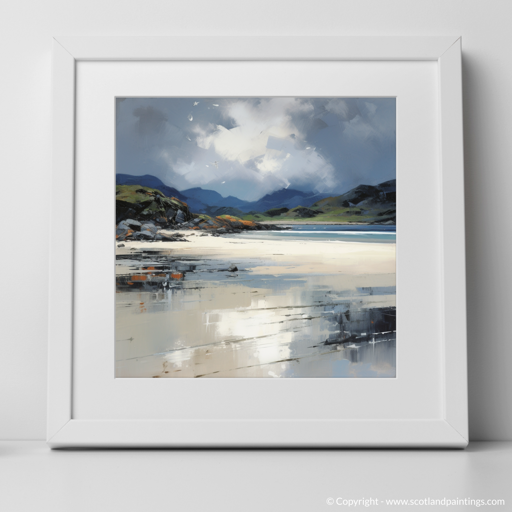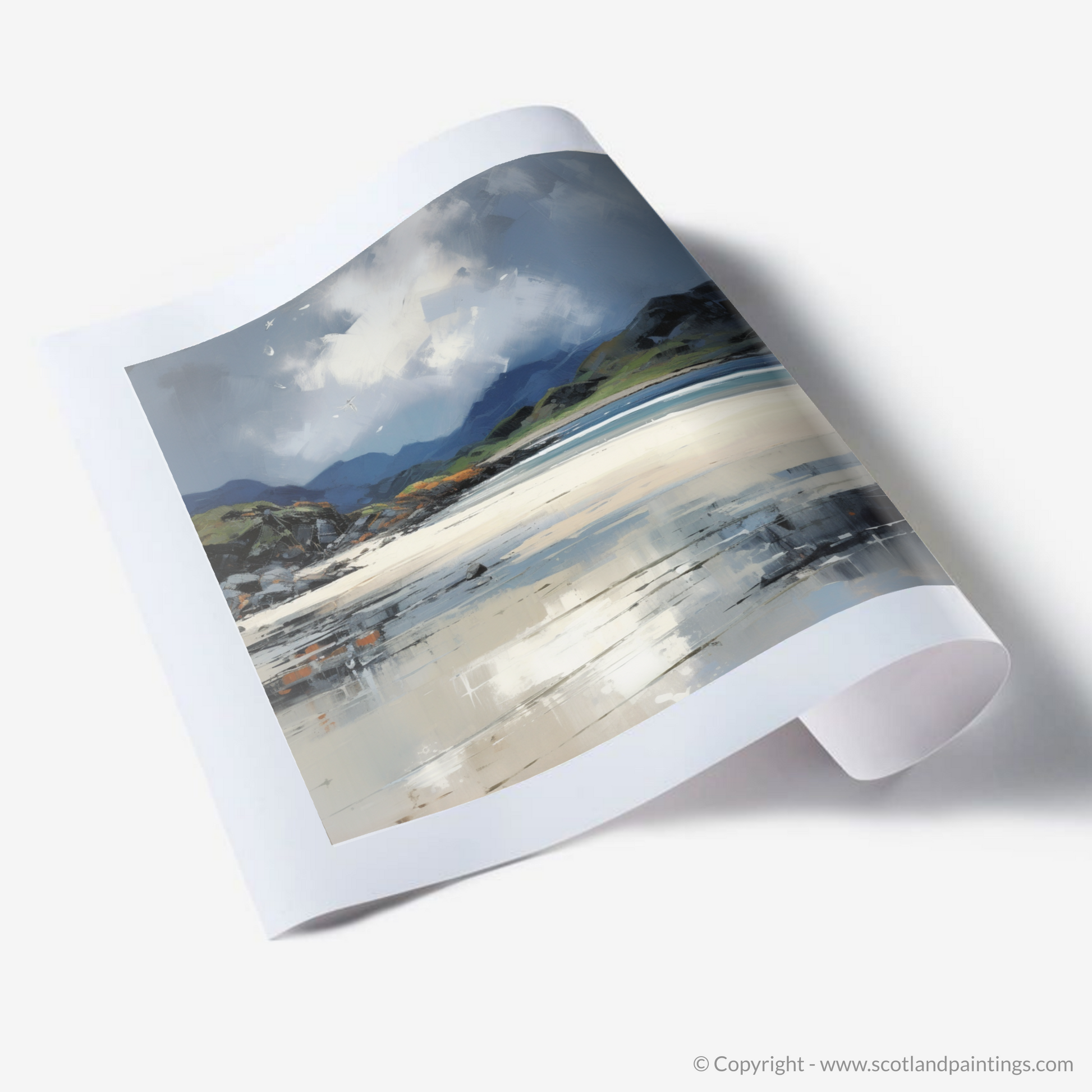 Immerse yourself in the turbulent beauty of the Scottish coastline with this evocative art print, capturing the essence of the Silver Sands of Morar beneath a brooding stormy sky. Reminiscent of the Color Field movement, this piece offers a stunning blend of vast, subtly graded expanses of colour that infuse the canvas with a profound sense of mood and atmosphere.