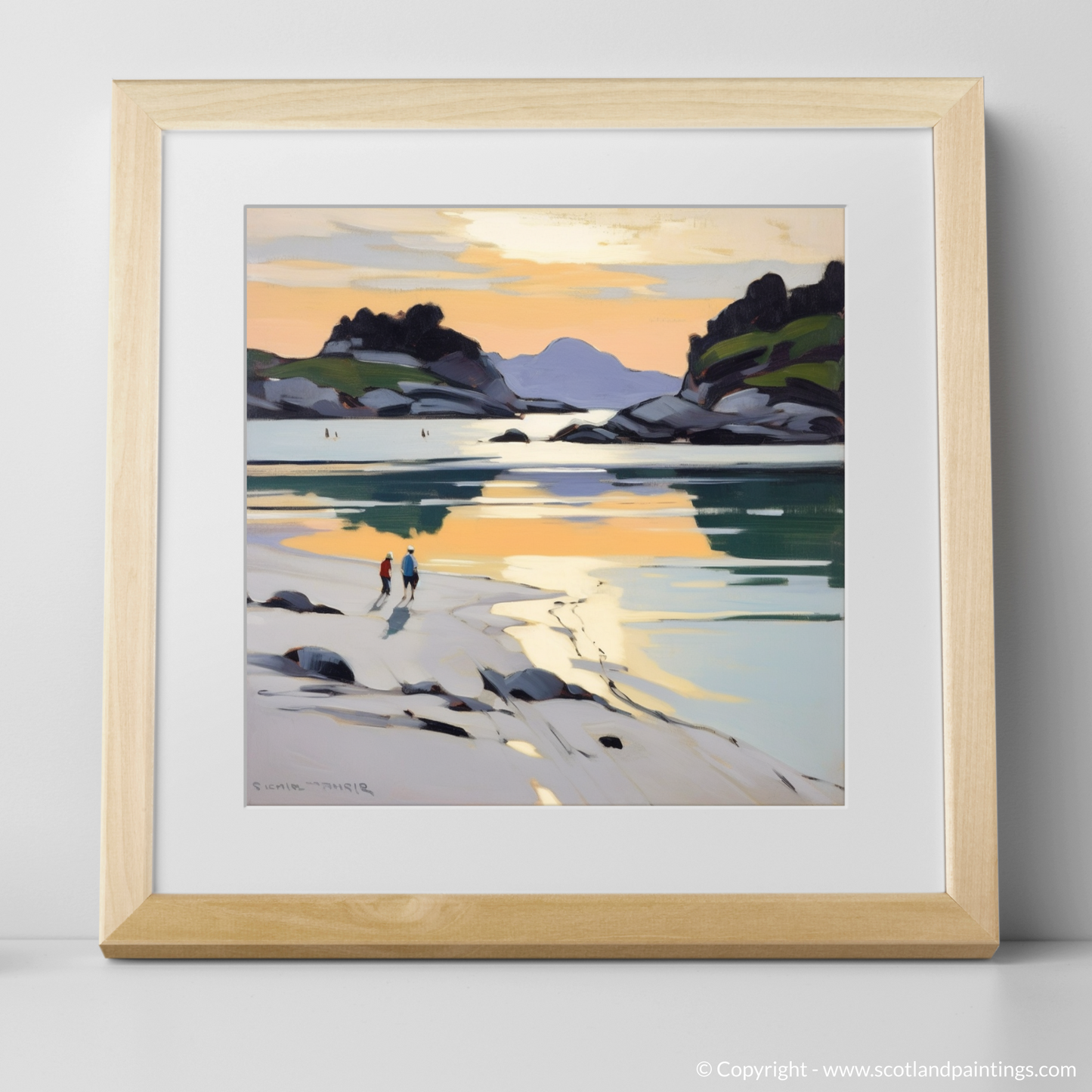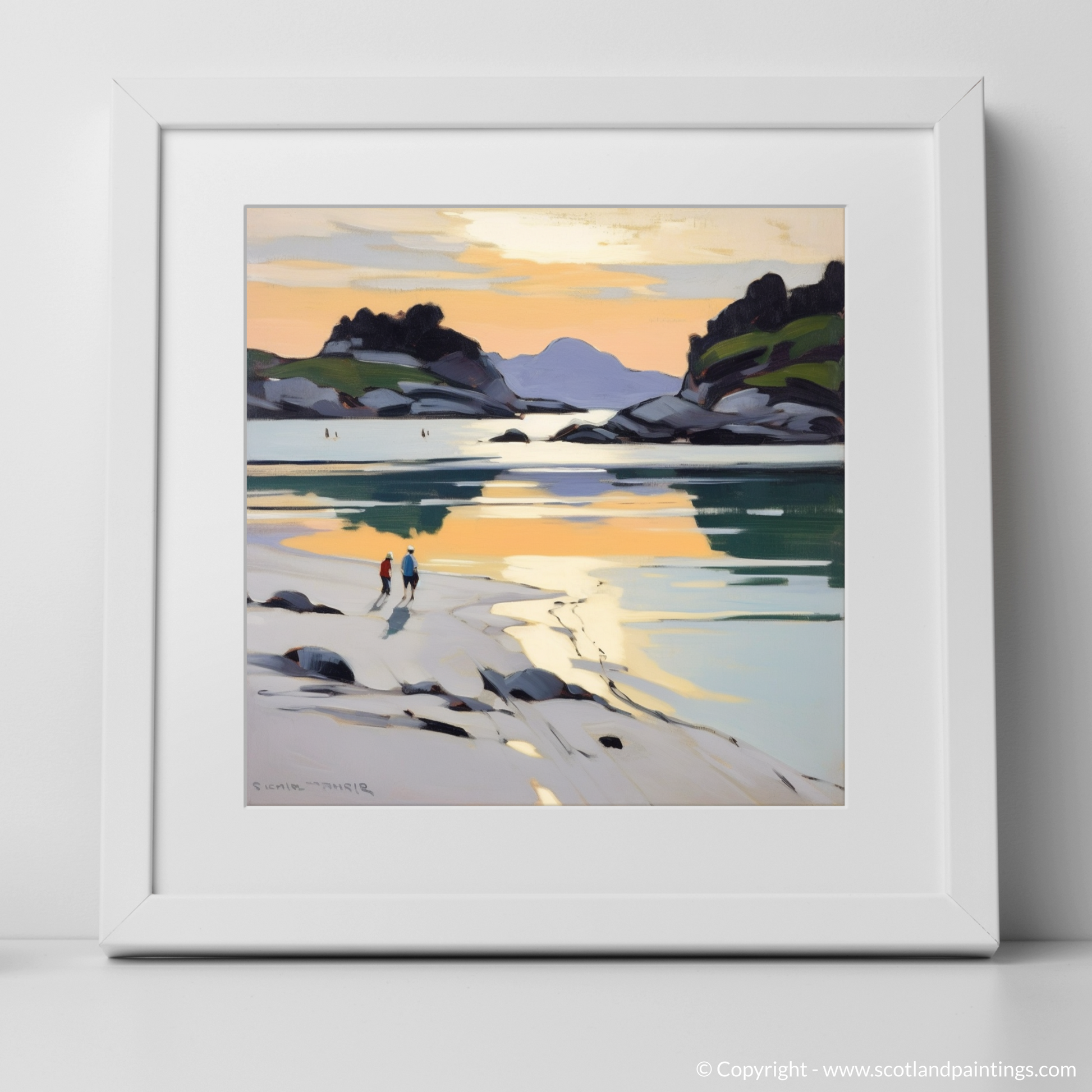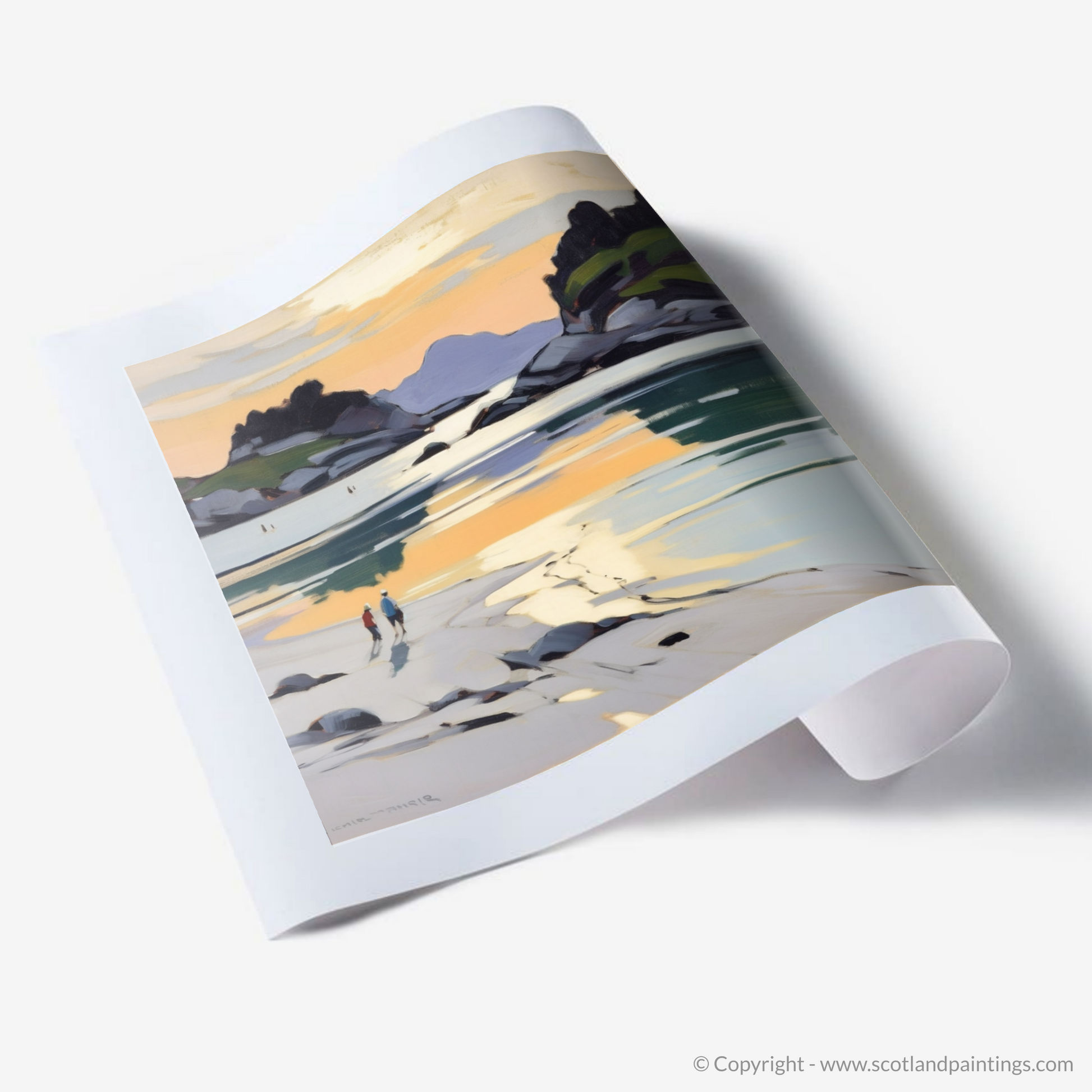 Immerse yourself in the serene beauty of the Silver Sands of Morar, exquisitely captured in this impressionistic print from our 'Scottish Beaches' collection. Evoking the unique, gentle light of a fading sun, the soft amber and peach tones of the sky contrast with the cooling hues of the coastal landscape. Below the sky, the silhouette of a distant mountain adds a sense of quiet majesty to the scene.
