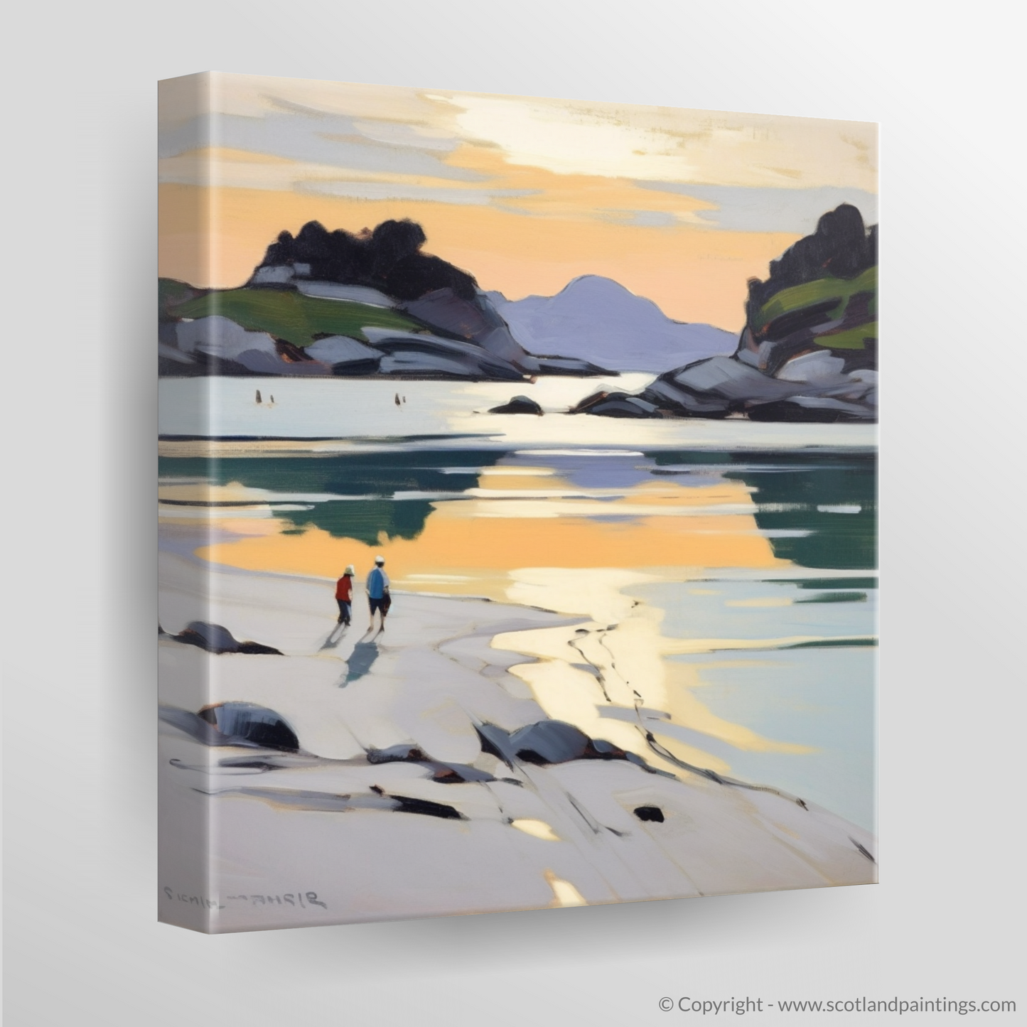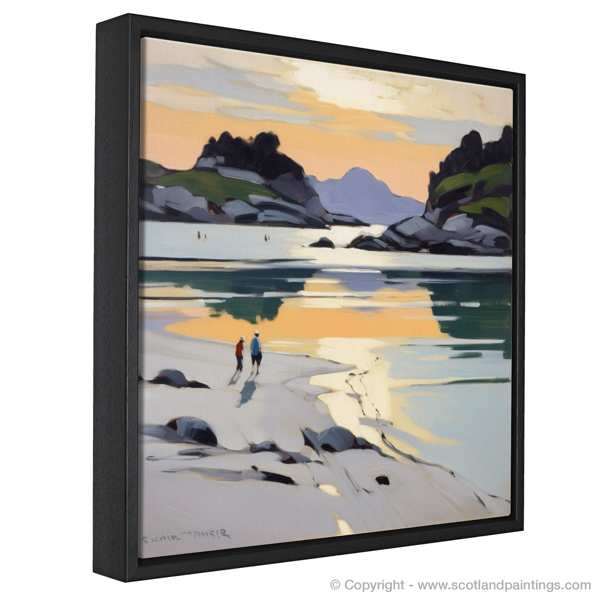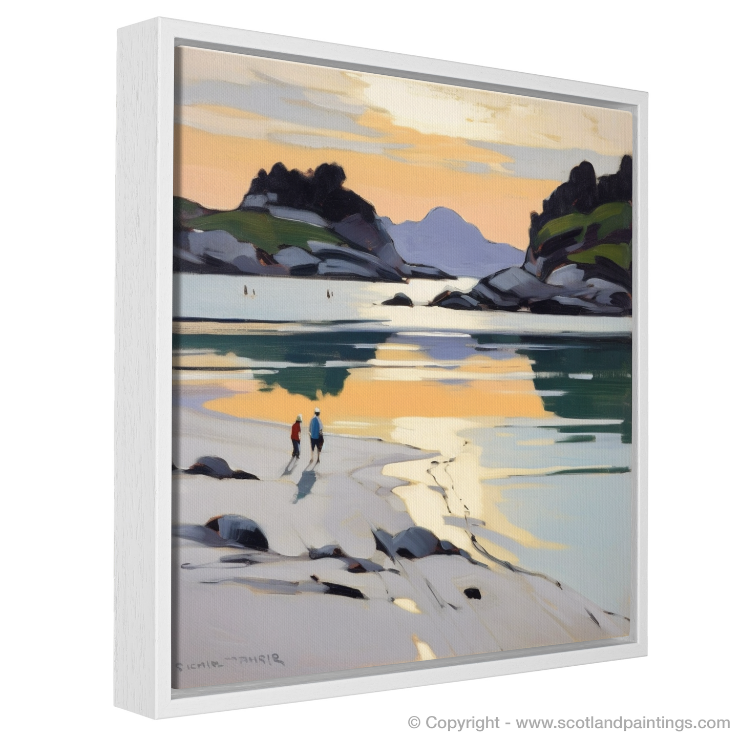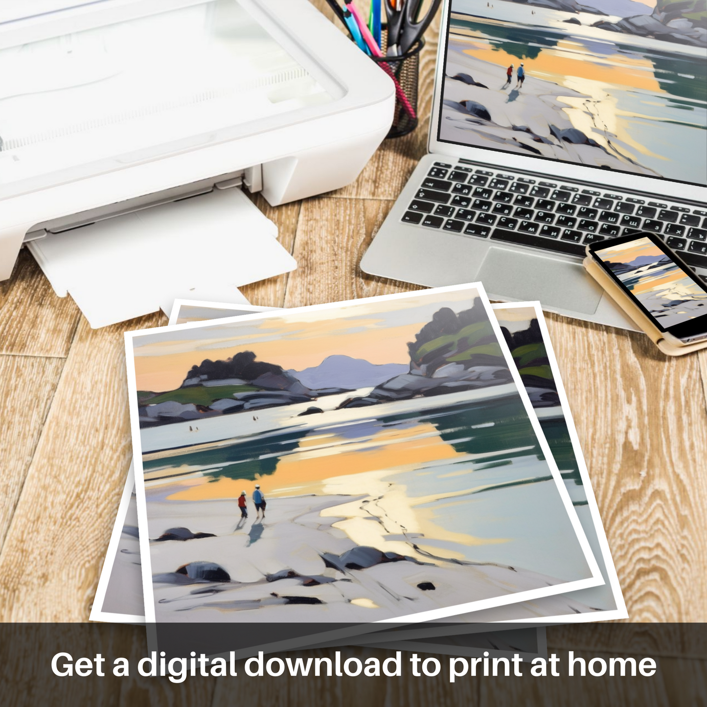 Immerse yourself in the serene beauty of the Silver Sands of Morar, exquisitely captured in this impressionistic print from our 'Scottish Beaches' collection. Evoking the unique, gentle light of a fading sun, the soft amber and peach tones of the sky contrast with the cooling hues of the coastal landscape. Below the sky, the silhouette of a distant mountain adds a sense of quiet majesty to the scene.