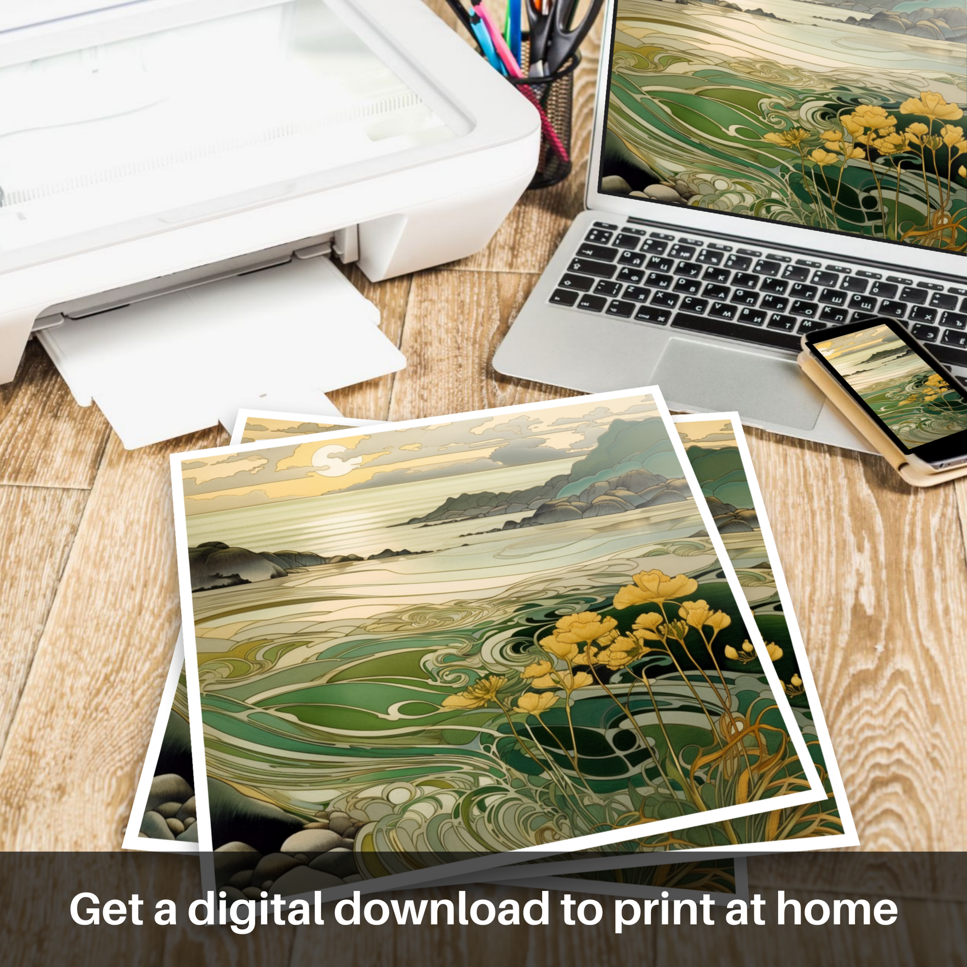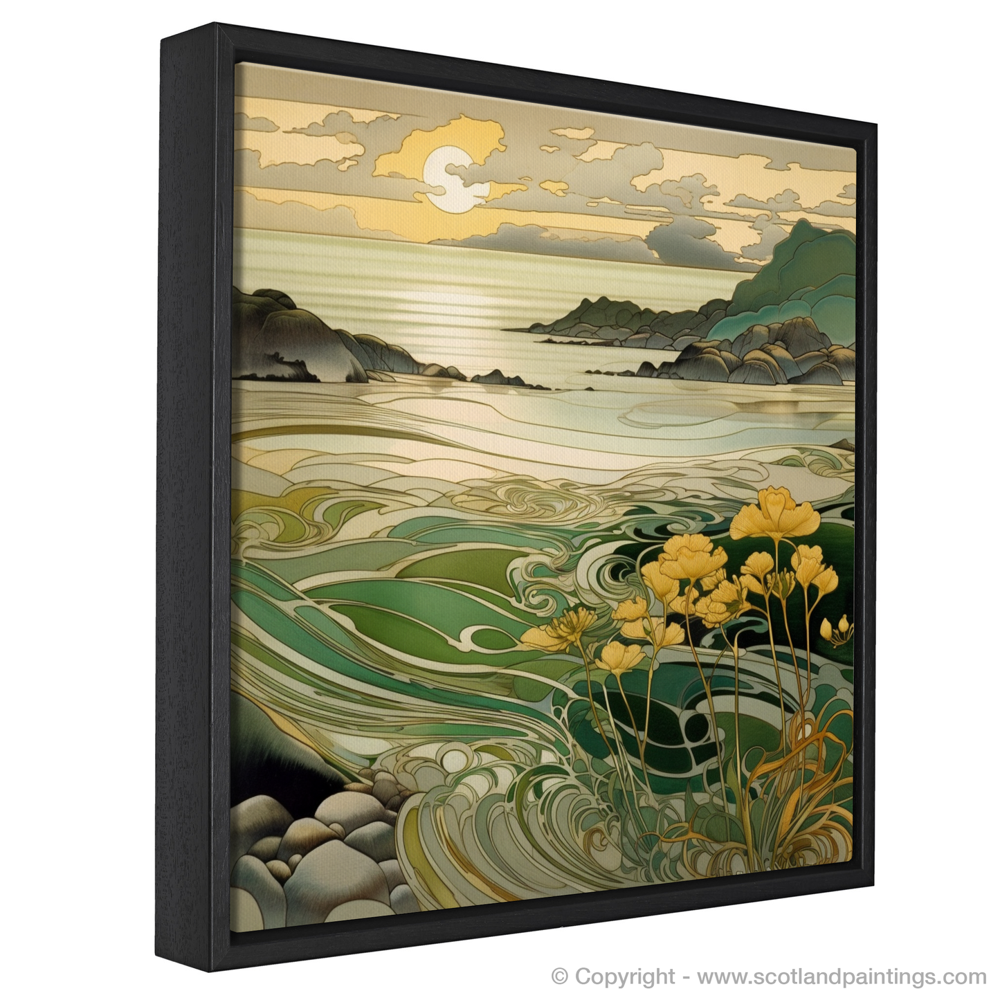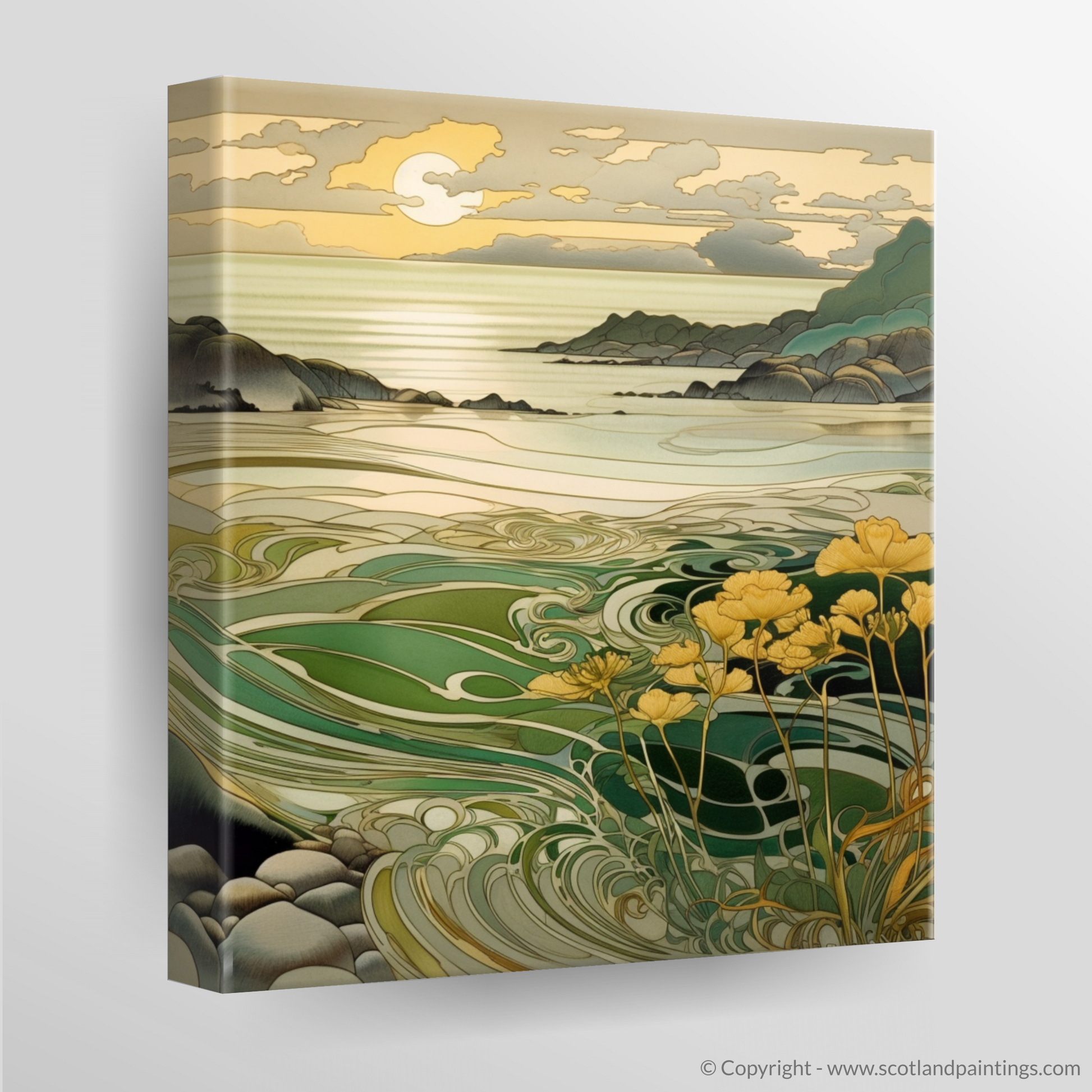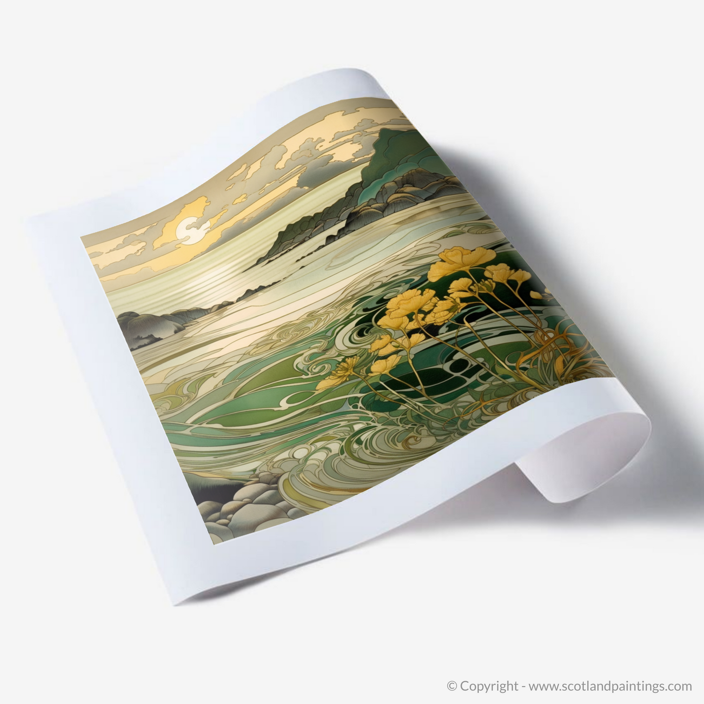 Rich in the sinuous curves and stylised nature that exemplify Art Nouveau, the print depicts a scene where the gentle embrace of the ebbing tides and the undulating hills meet. The intricate play of light bathes the landscape in warm, amber tones, while the cool greens and blues of the swirling waters create a soothing contrast. Delicate botanical motifs grace the foreground, where a cluster of flowers in resplendent yellows and subtle greens reaches towards the glow of the setting sun.
