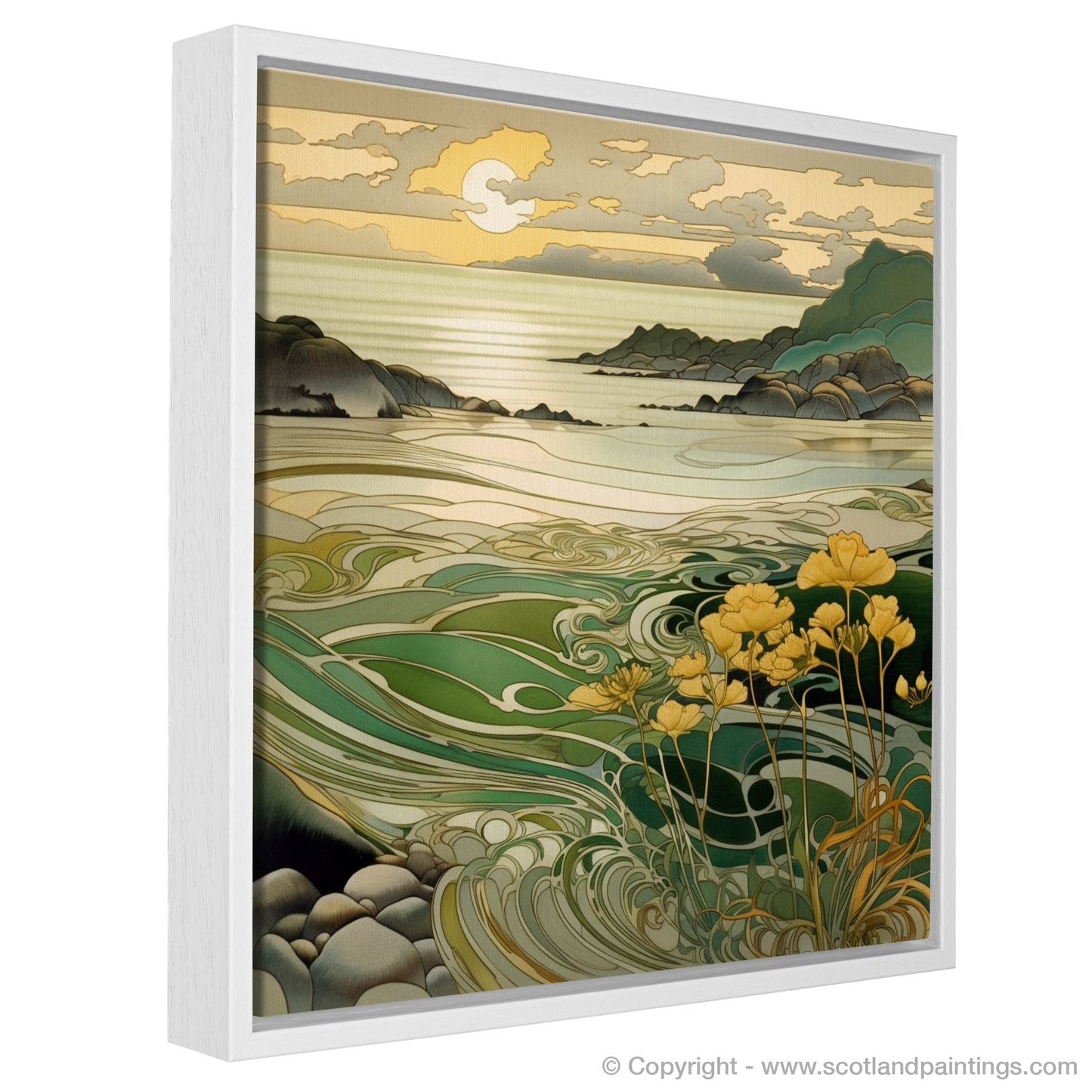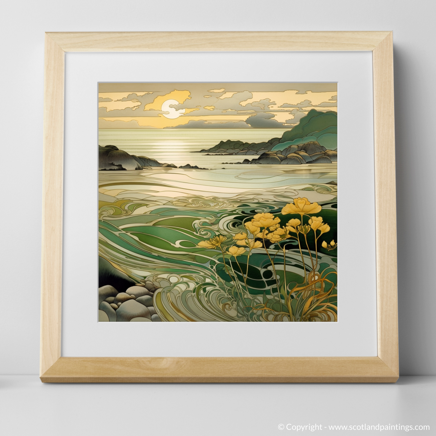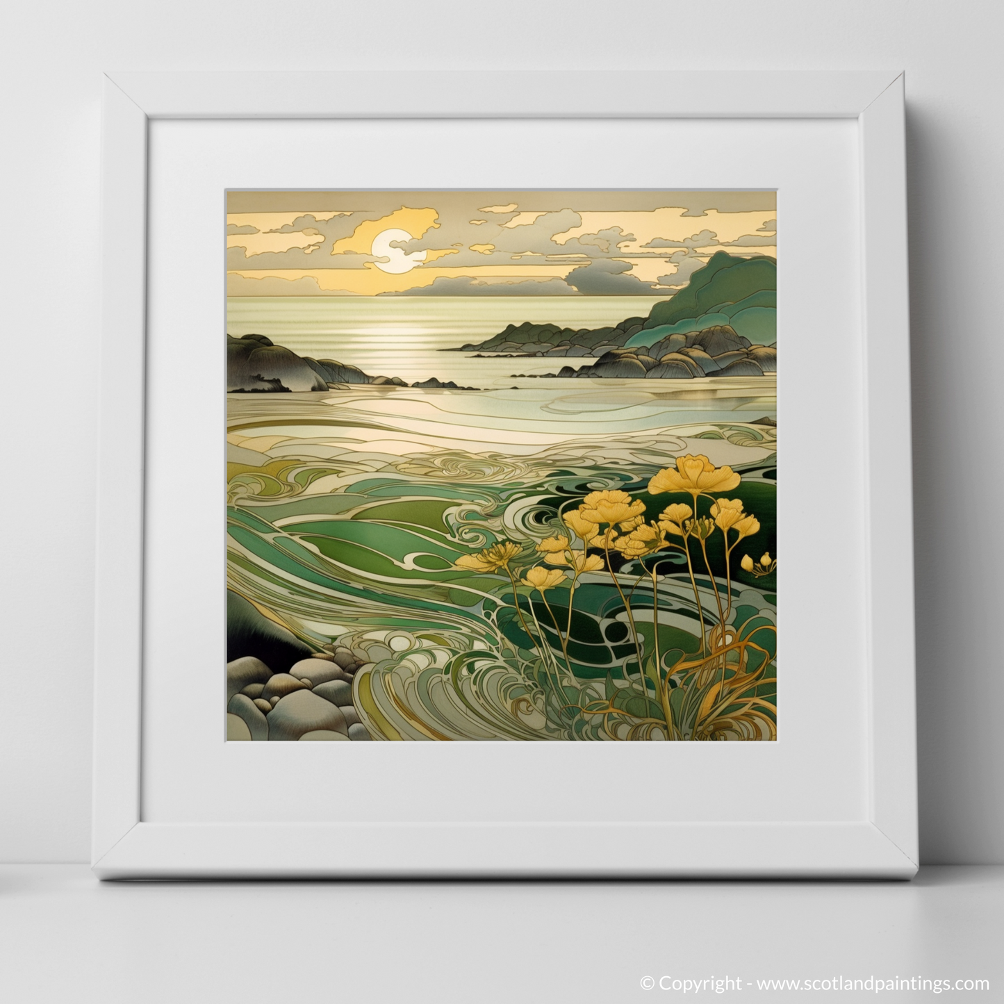 As the sun dips towards the horizon, casting a golden sheen over the tranquil waters, this captivating print captures the serenity and majesty of the Scottish seaside at its most enchanting. Part of the 'Scottish Beaches' collection, this exquisite piece invites you to immerse yourself in the enchanting ambiance of the Silver Sands of Morar.