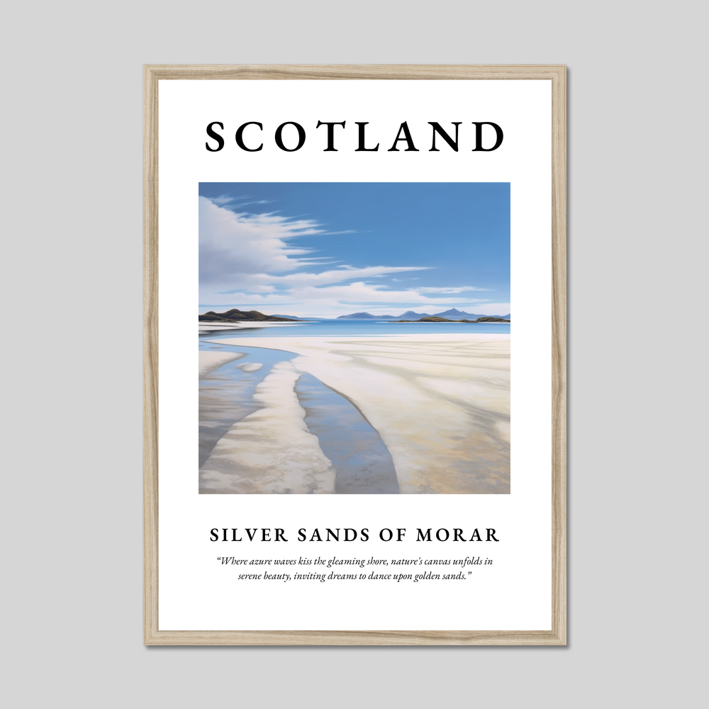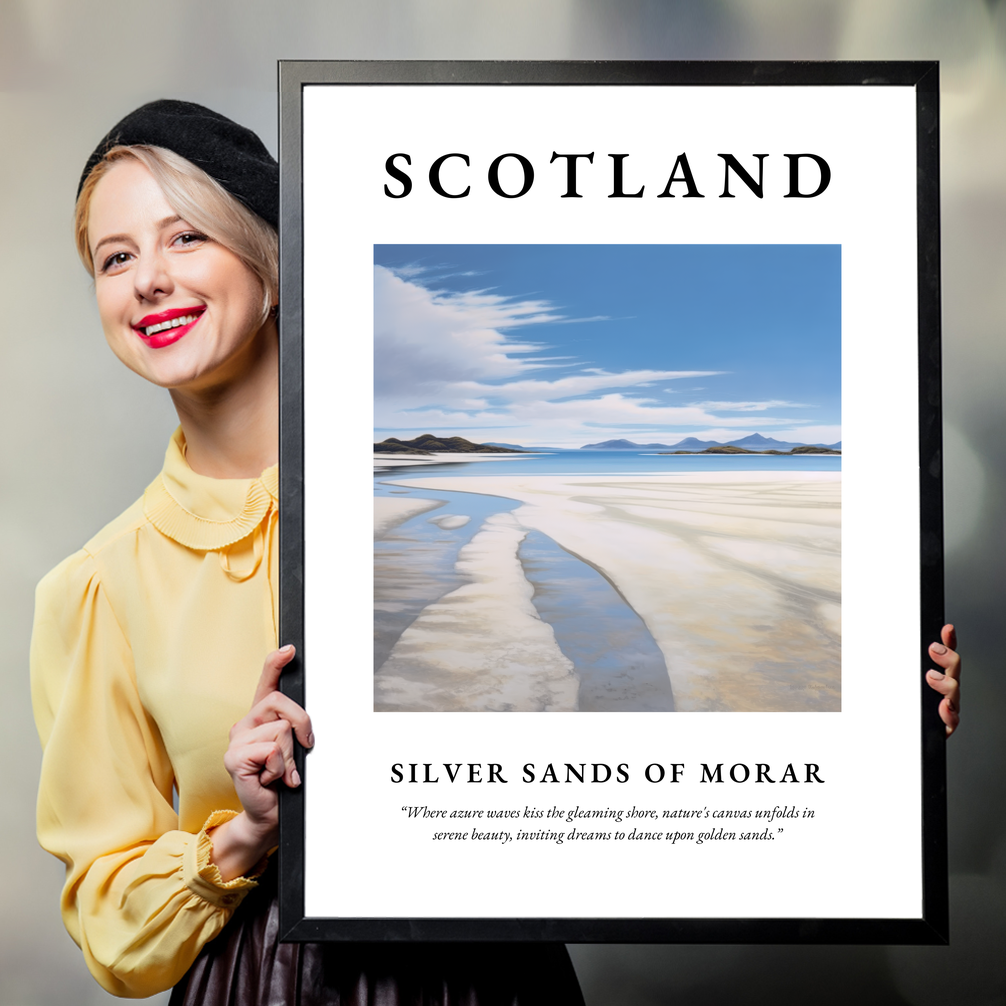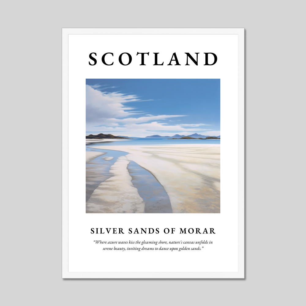 The poster boldly displays "SCOTLAND" in grand, commanding letters, a testament to the striking allure of this beautiful country. Beneath the title lies a minimalist painting that captures the Silver Sands of Morar in its most serene and timeless state. The artwork uses clean lines and soft tones to depict the azure waves softly kissing the gleaming shore, evoking a sense of peace and escape. Below the painting, the quote, “Where azure waves kiss the gleaming shore, nature's canvas unfolds in serene beauty, inviting dreams to dance upon golden sands,” encapsulates the dreamy atmosphere of this breathtaking location.