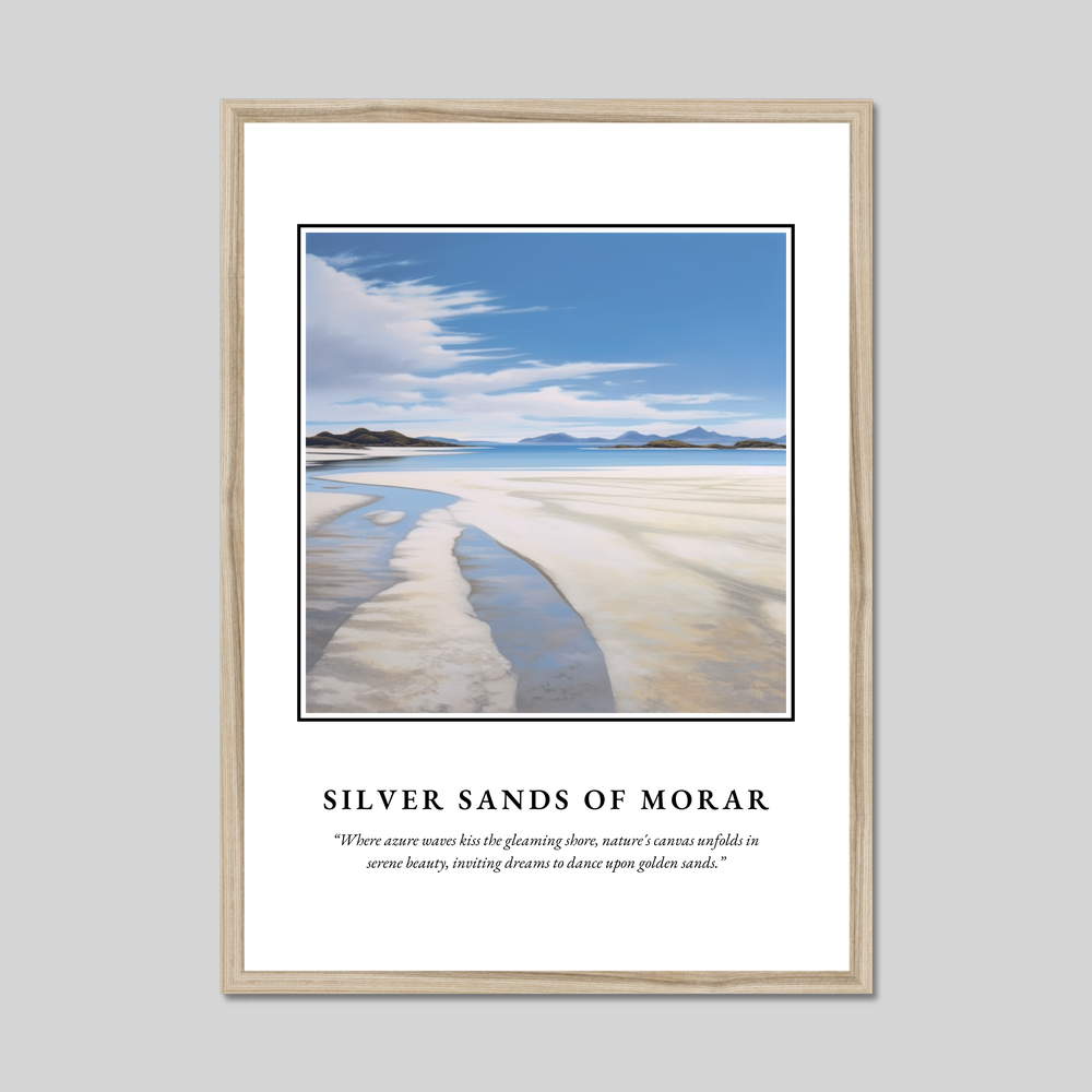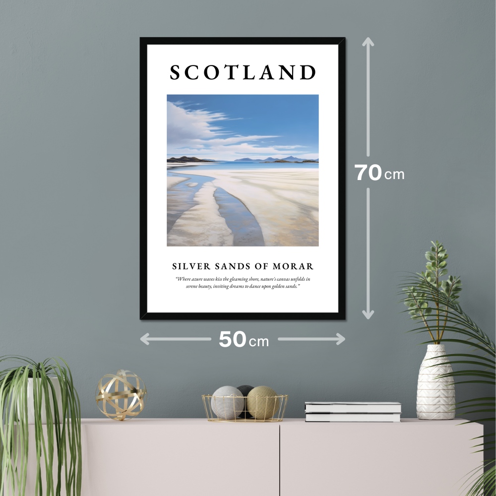 Indulge in the tranquil beauty of the Scottish coast with this captivating framed poster print, perfect for adorning any space with the essence of Silver Sands of Morar. Measuring an impressive 50cm x 70cm, this large-scale artwork covers a significant wall area, allowing you to transform your home into a gallery of serene landscapes at an affordable price.