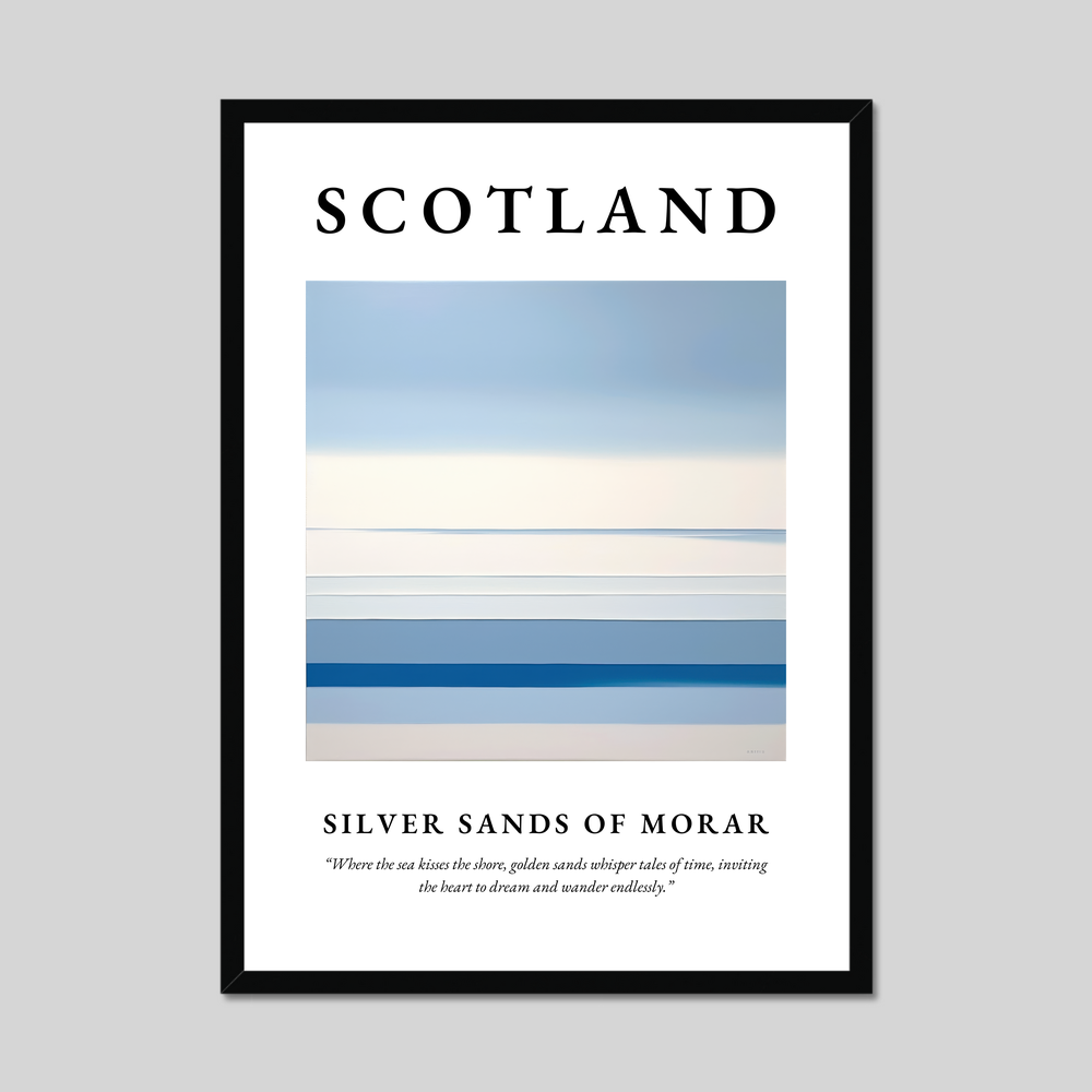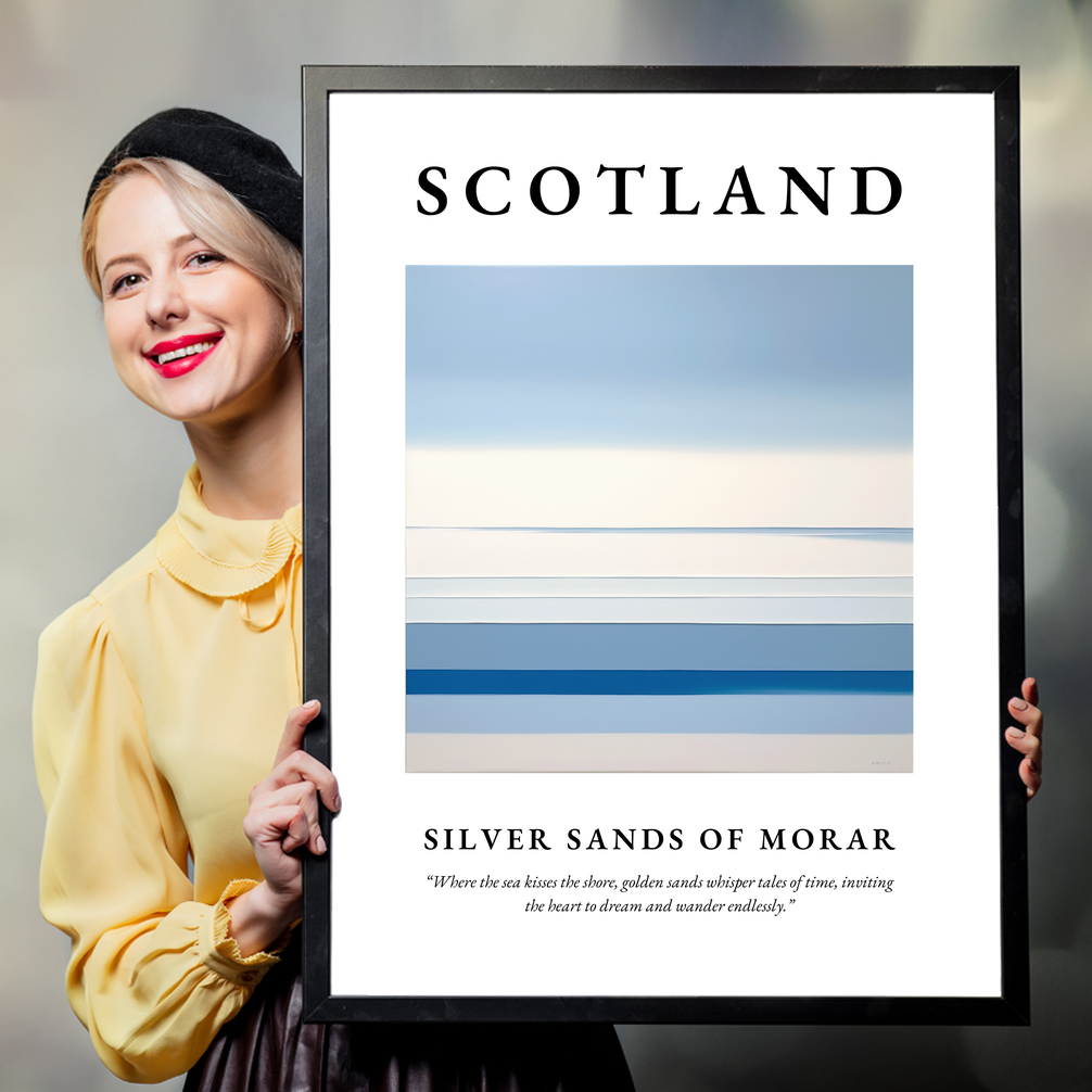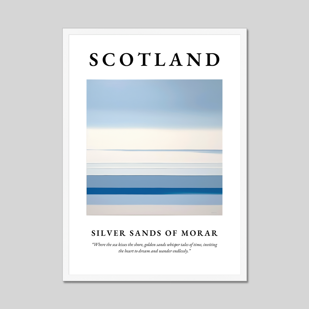 Silver Sands of Morar, located on the west coast of Scotland, is a place of breathtaking beauty, renowned for its pristine beaches and stunning vistas. Stretching along the coastline, these sands glisten with a golden hue under the Scottish sun, creating a perfect blend of sea and land. The area's tranquil atmosphere and picturesque landscapes have long inspired poets, dreamers, and wanderers. Our poster captures this essence, drawing upon the ethereal quality of the sands and the vast, inviting sky.