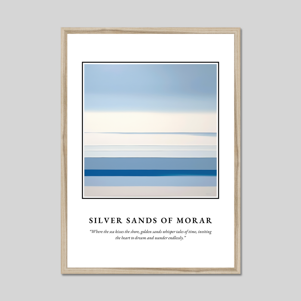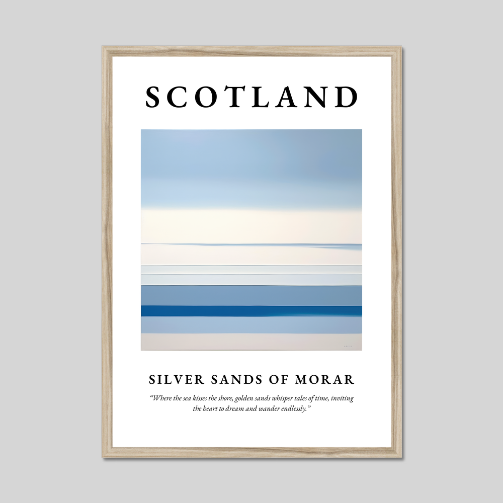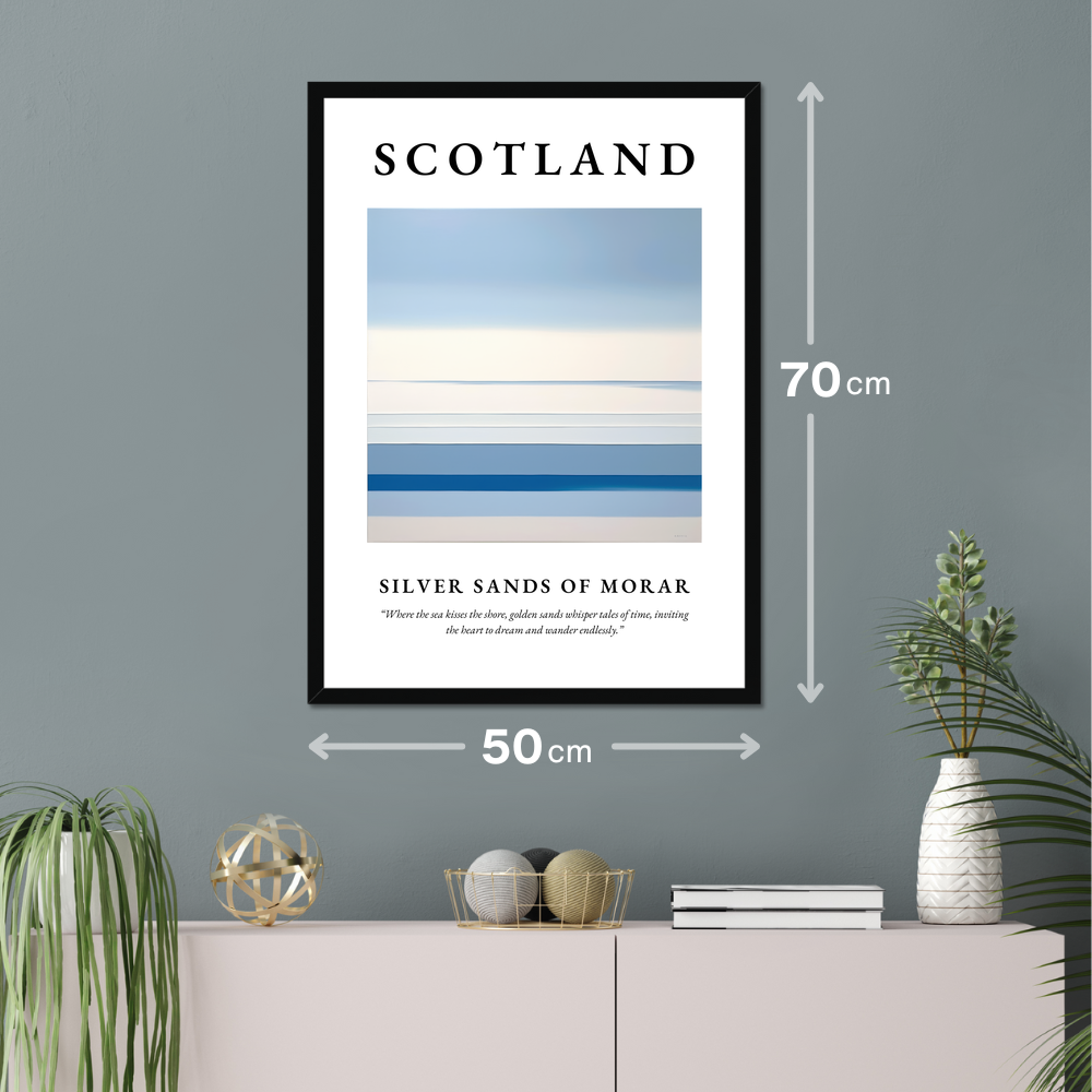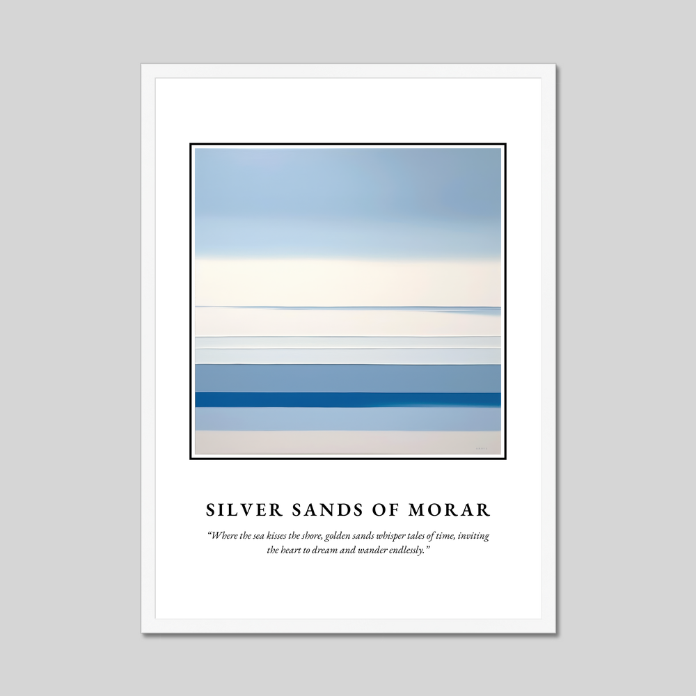 Silver Sands of Morar, located on the west coast of Scotland, is a place of breathtaking beauty, renowned for its pristine beaches and stunning vistas. Stretching along the coastline, these sands glisten with a golden hue under the Scottish sun, creating a perfect blend of sea and land. The area's tranquil atmosphere and picturesque landscapes have long inspired poets, dreamers, and wanderers. Our poster captures this essence, drawing upon the ethereal quality of the sands and the vast, inviting sky.