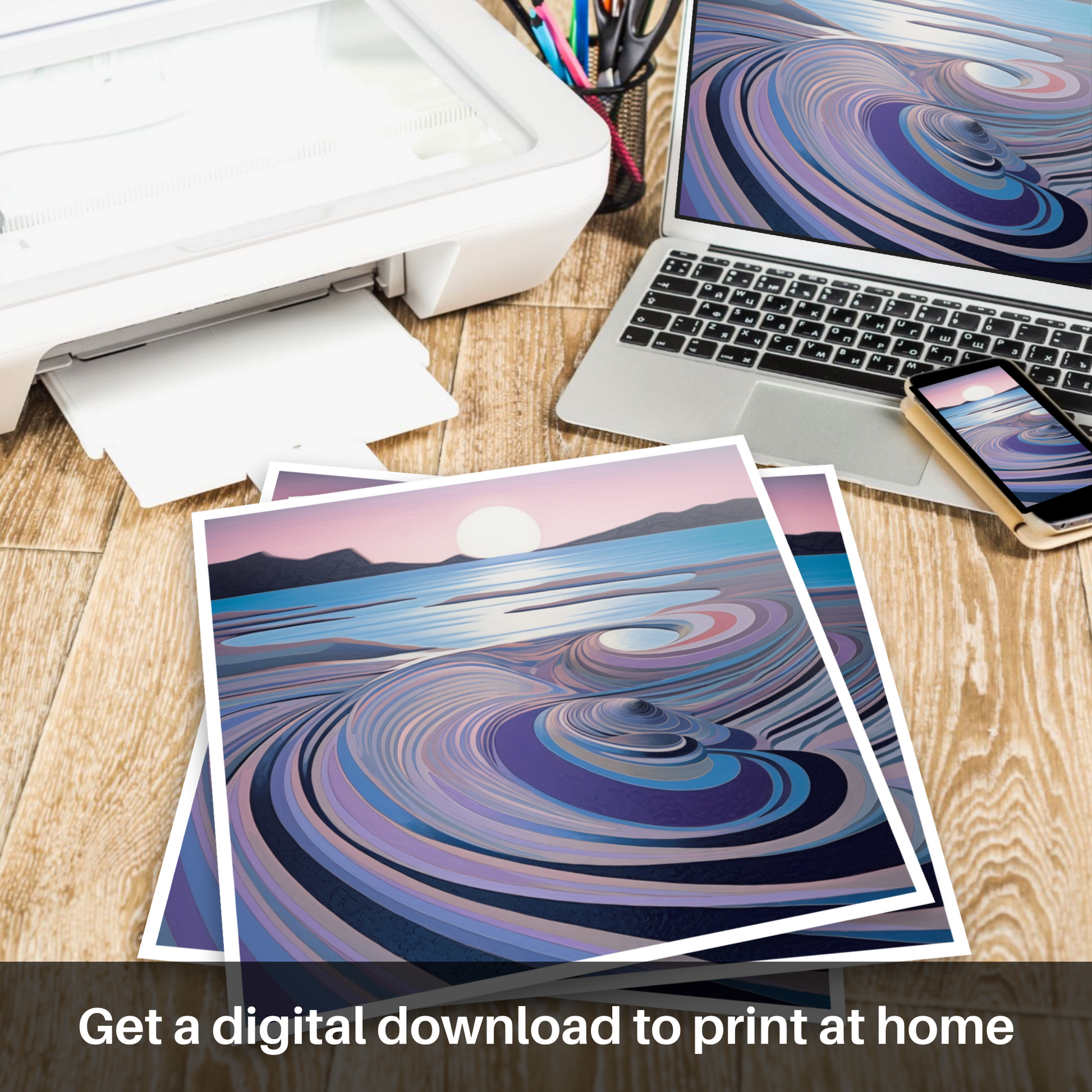 The colour palette is both soothing and sophisticated, featuring gradients of purples, blues, and gentle pinks that mirror the shifting hues of the sky as daylight slowly fades. The contours of the land and the silhouettes of distant hills are rendered in calm, understated tones, offering a sense of depth and solidity against the liquid expanse of the water. The rippling effects on the water's surface create an almost hypnotic visual texture, while the central placement of the sun injects a mesmerizing symmetry into the scene.