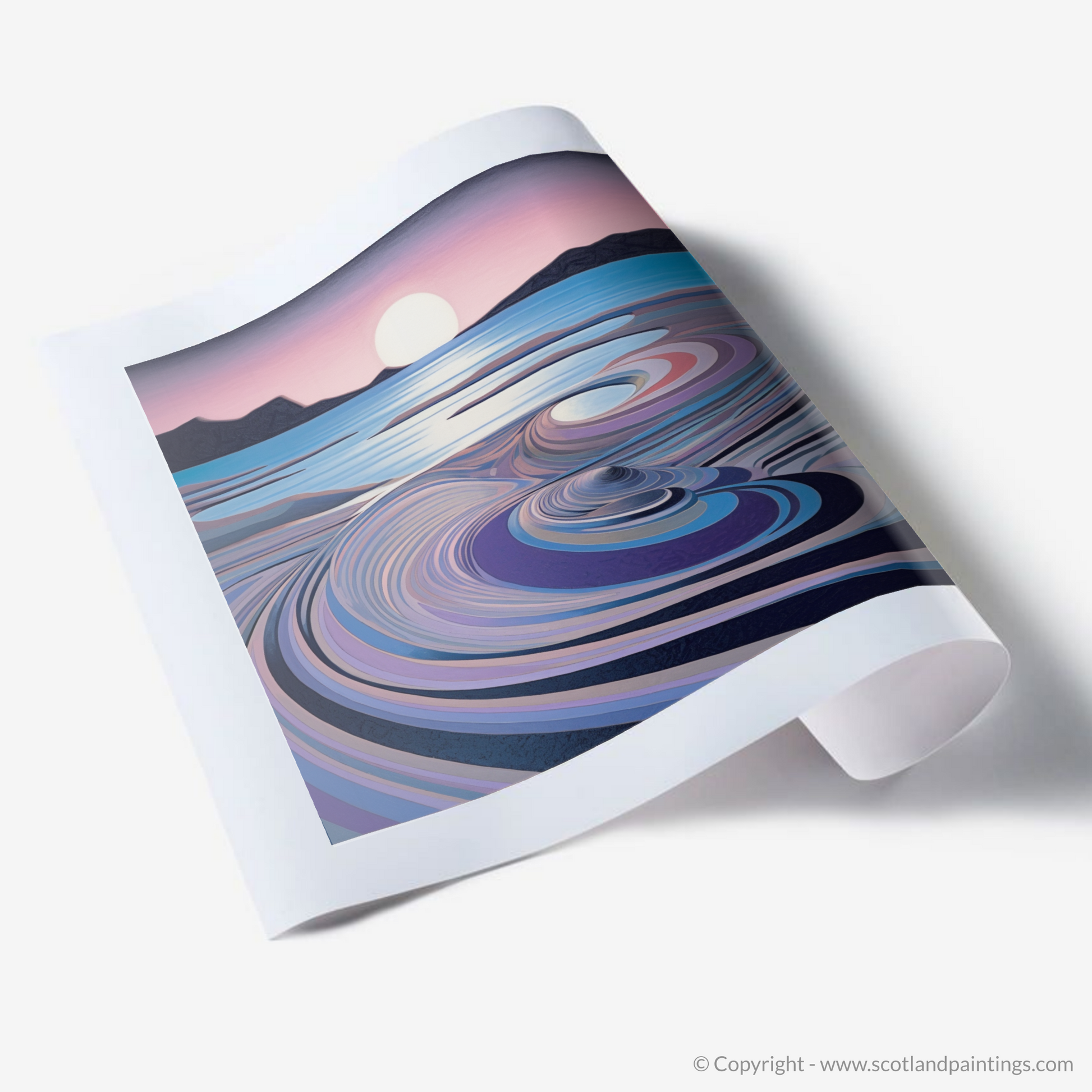 As dusk embraces the Silver Sands of Morar, this evocative print captures the tranquil beauty of one of Scotland's most picturesque beaches. Through a minimalistic approach, the serene landscape is distilled into sweeping, harmonious curves and bold, streamlined shapes, encapsulating the rhythmic motion of the sea and the stillness of the evening sky. The bold simplicity of the composition invites contemplation, with the interplay of light and shadow cast by a low, radiant sun that appears to be hovering just above the horizon.