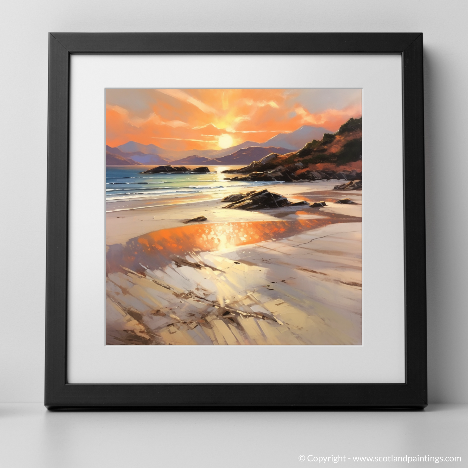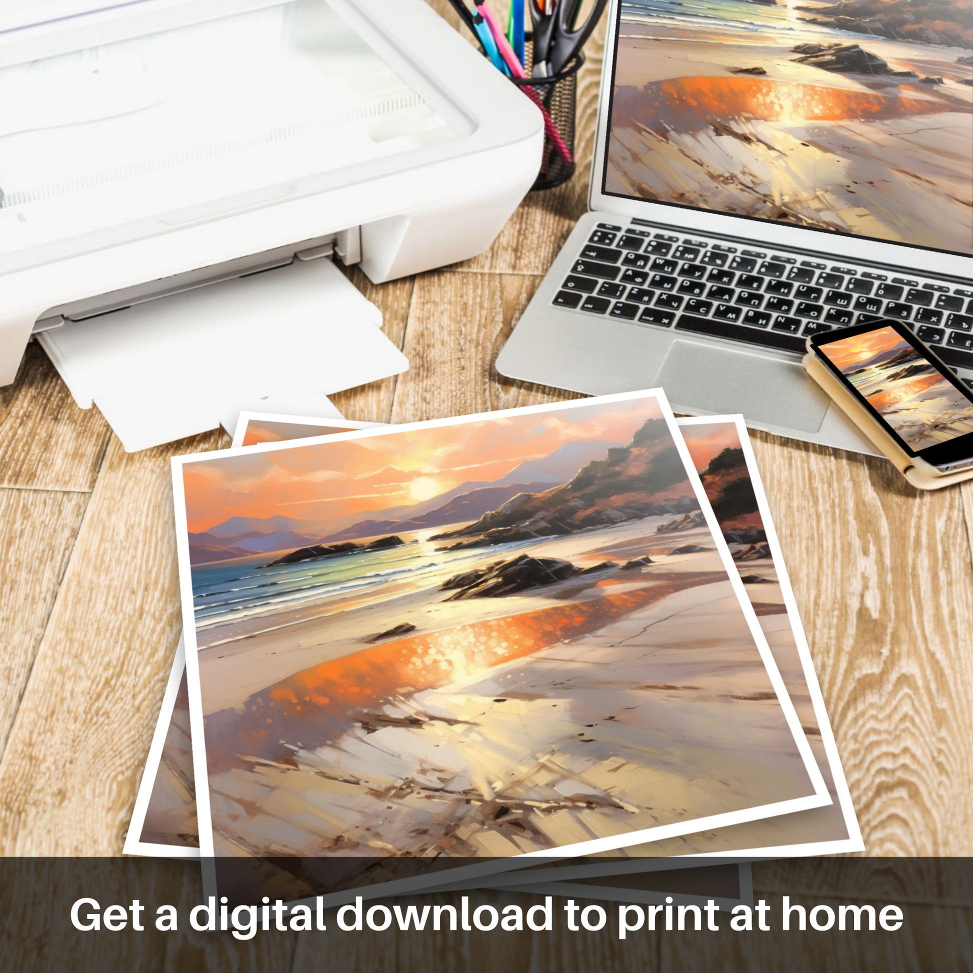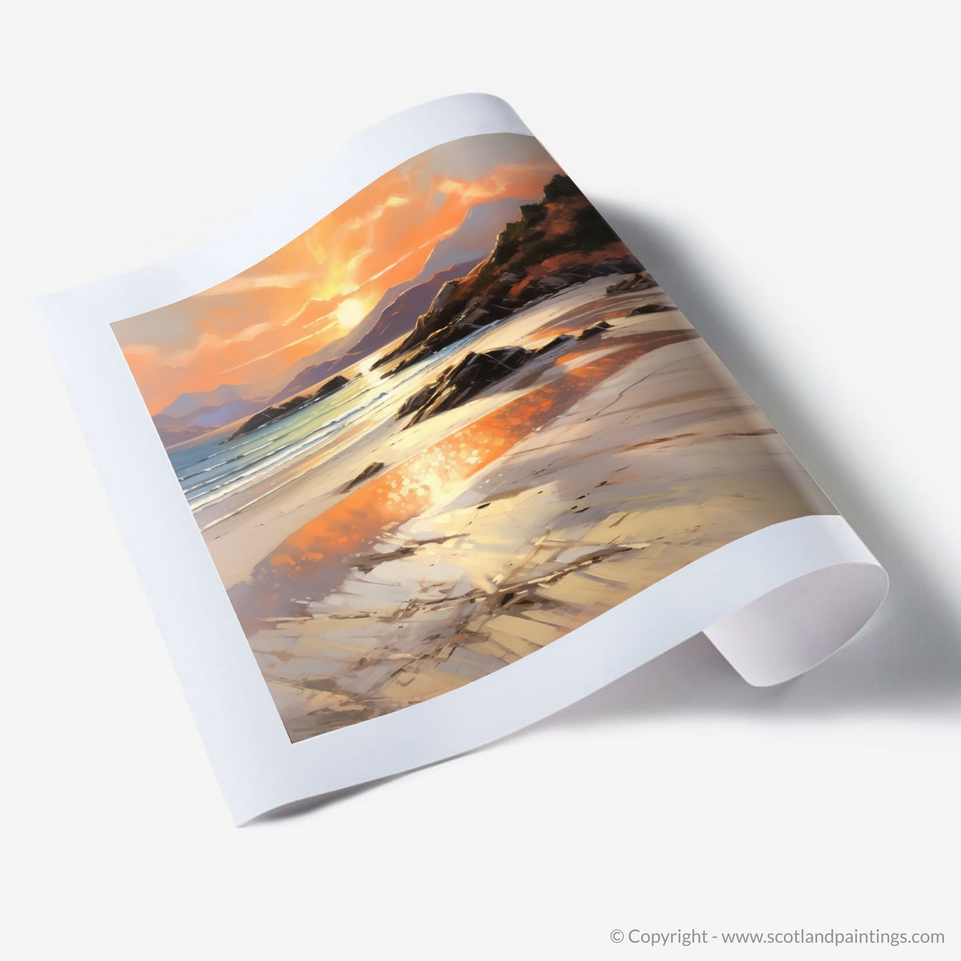 Immerse yourself in the serene splendour of a Scottish beach at the close of day with our enchanting print. Nestled in our 'Scottish Beaches' collection, this piece captures the radiant glow of golden hour at the famed Silver Sands of Morar, a place where time seems to stand still under the enchanting spell of the setting sun.