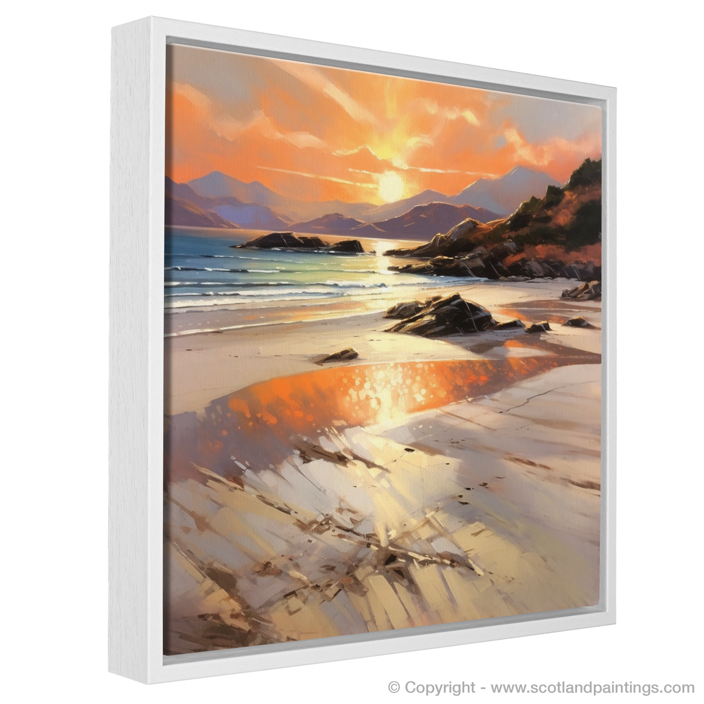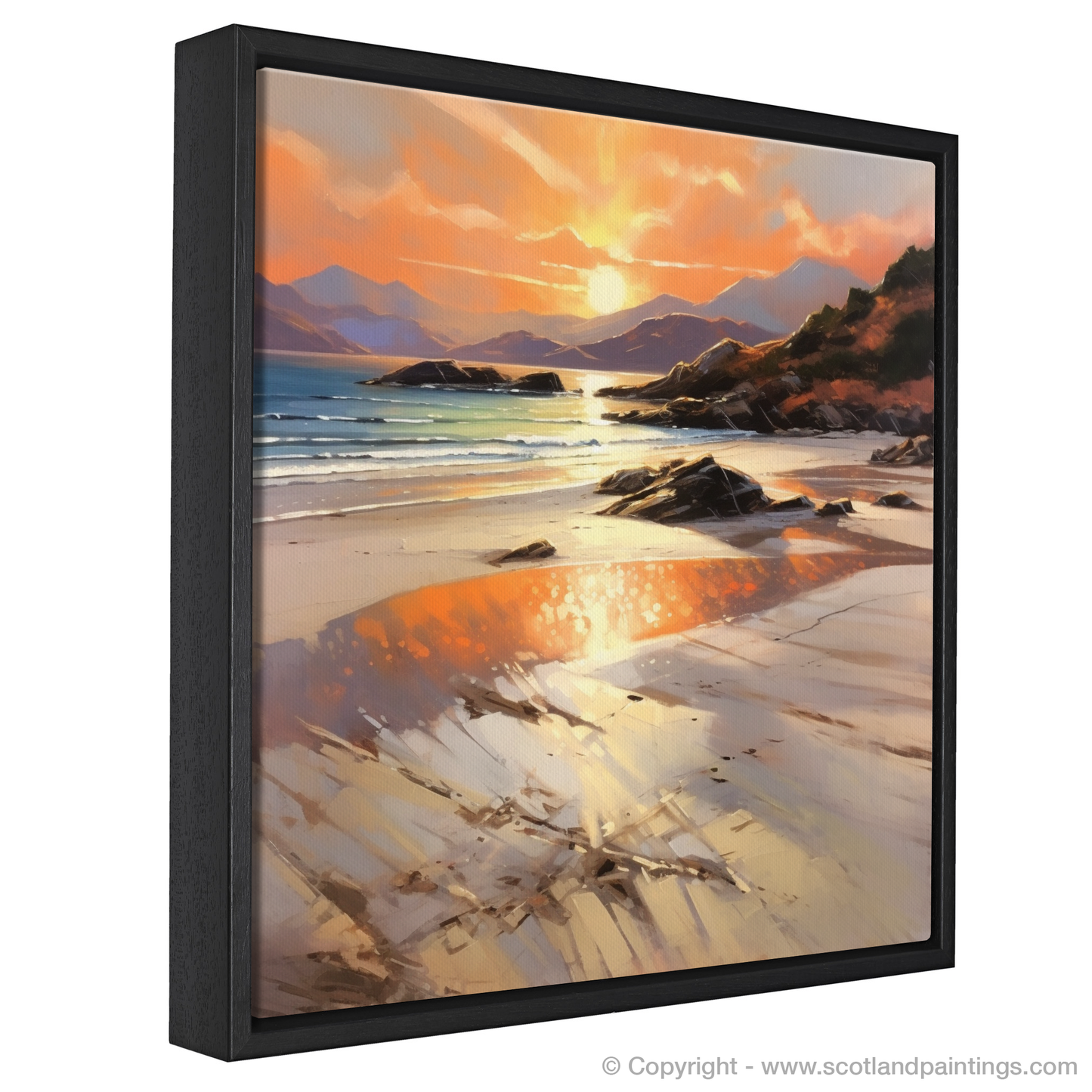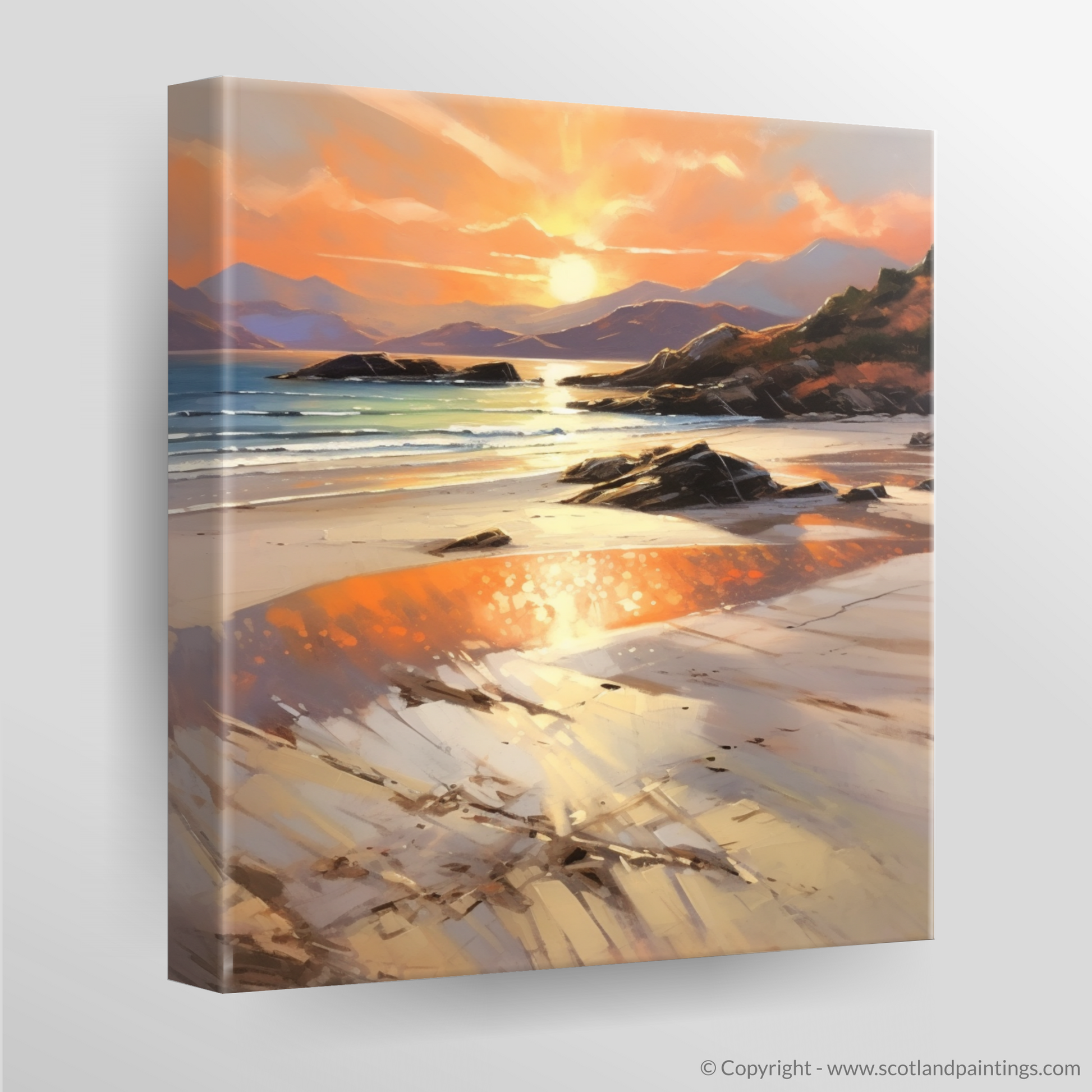 Immerse yourself in the serene splendour of a Scottish beach at the close of day with our enchanting print. Nestled in our 'Scottish Beaches' collection, this piece captures the radiant glow of golden hour at the famed Silver Sands of Morar, a place where time seems to stand still under the enchanting spell of the setting sun.