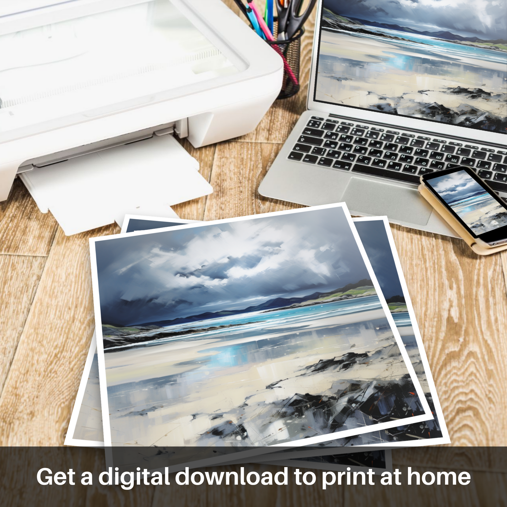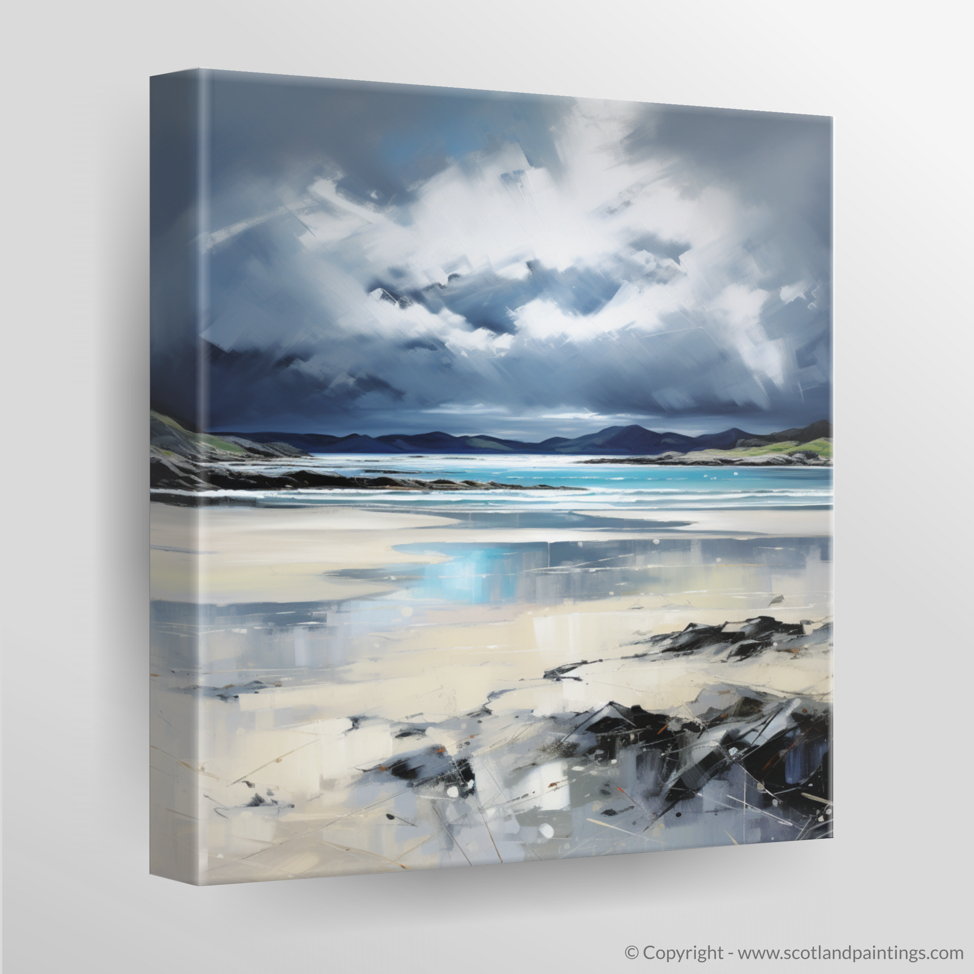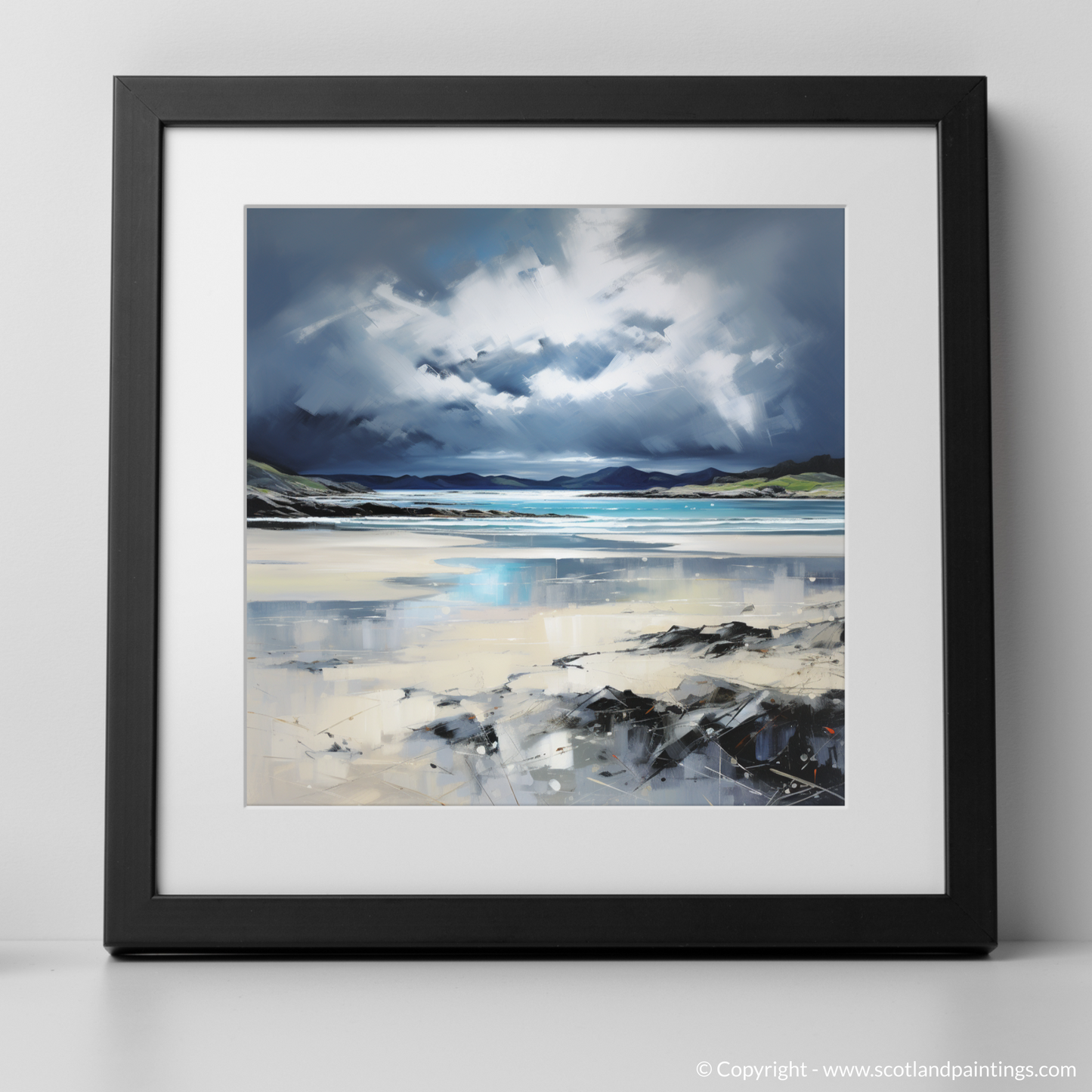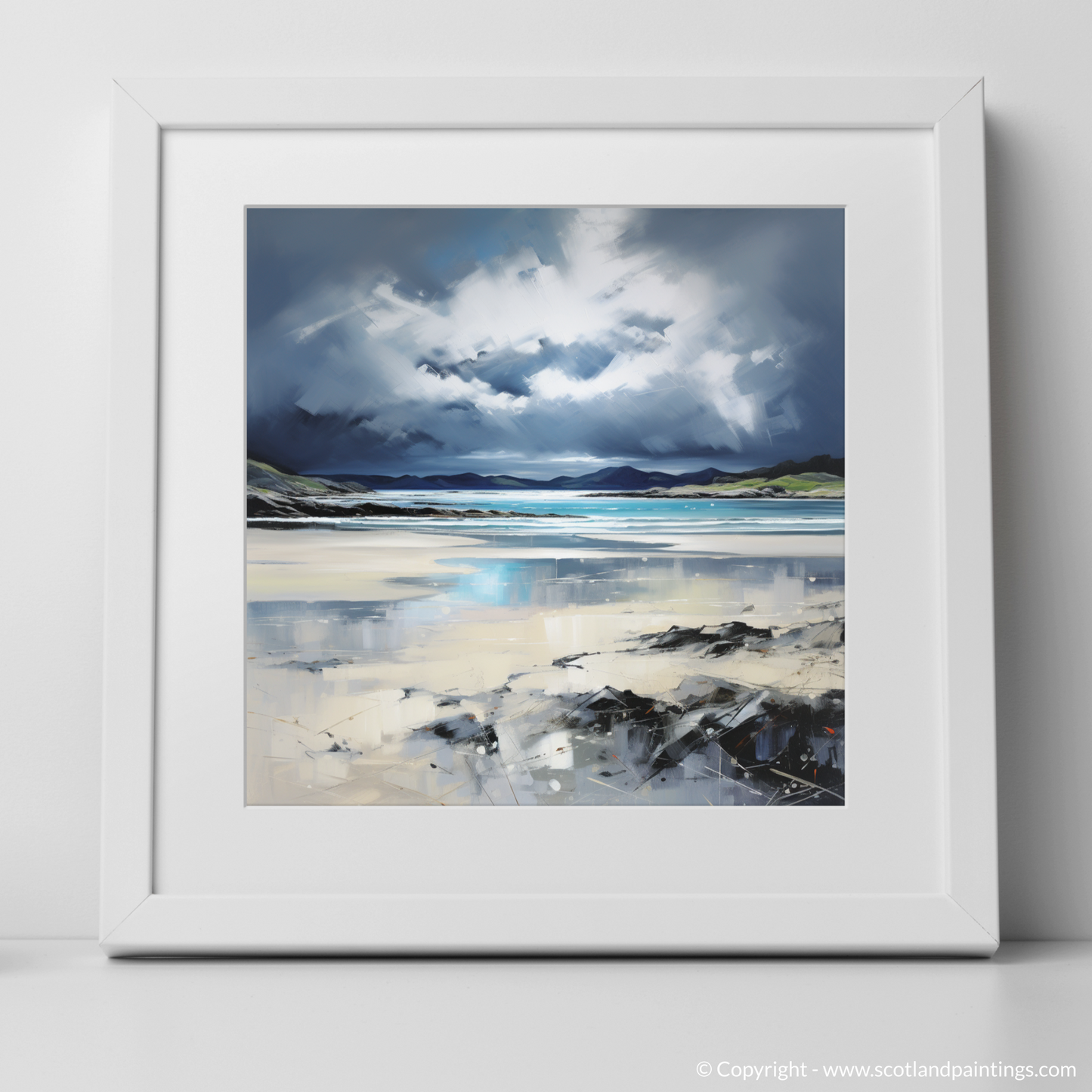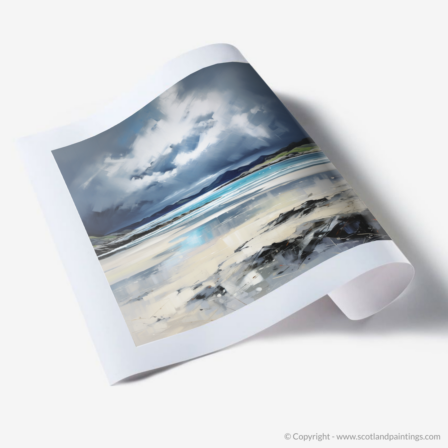 Capture the raw beauty of the Scottish coastline with this evocative print, where the untamed power of a stormy sky broods over the Silver Sands of Morar. Contrasting emotions stir within as the viewer is drawn into a landscape alive with the drama of nature's forces.