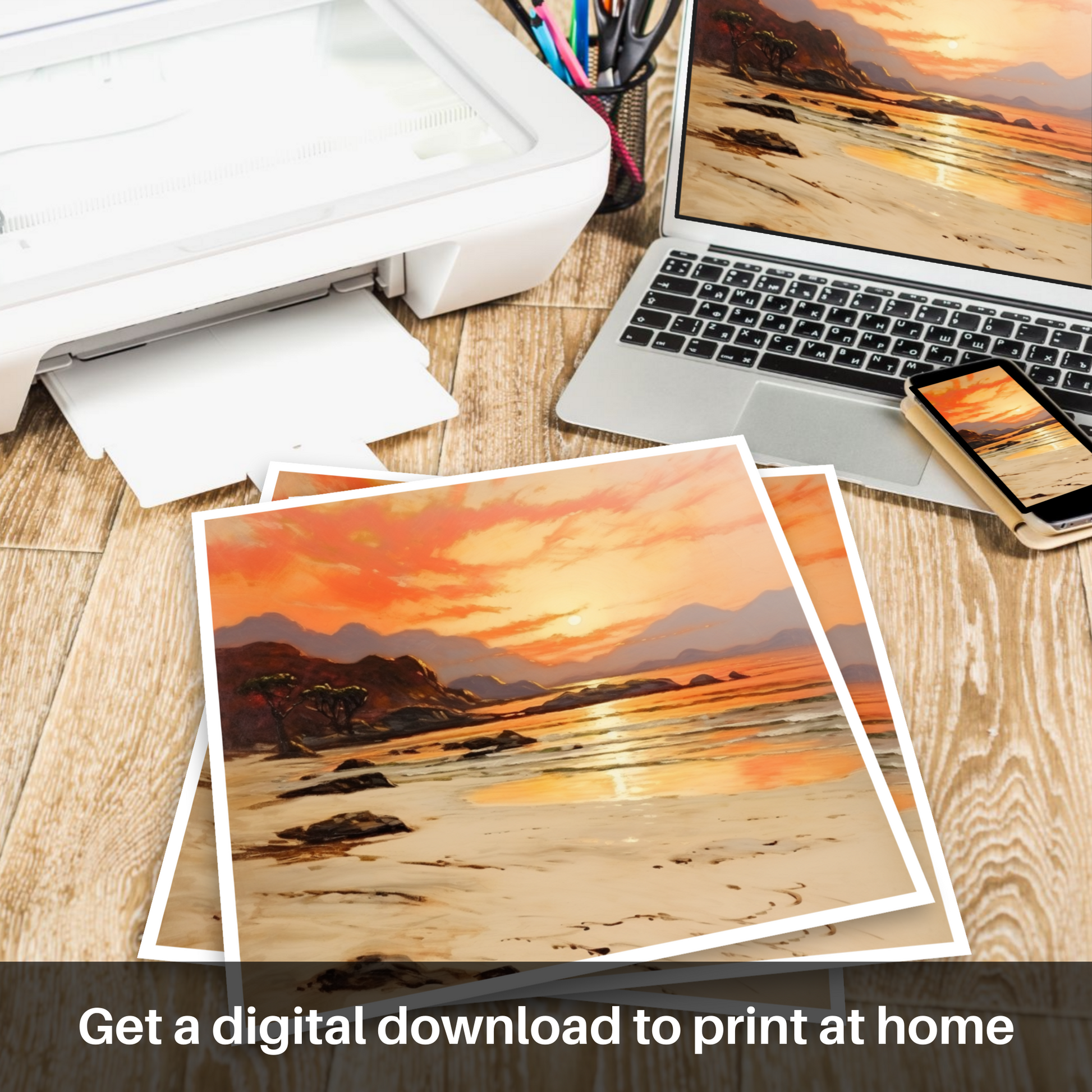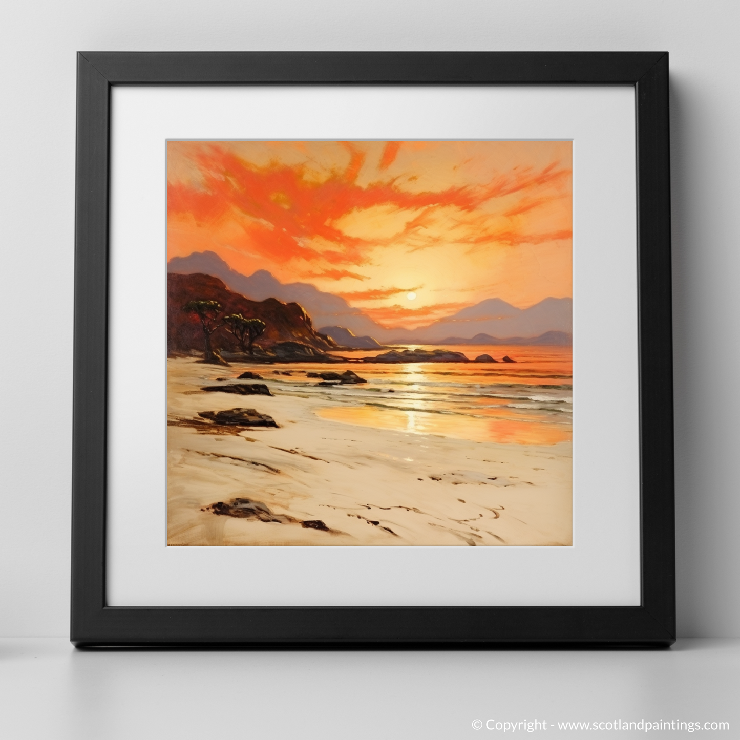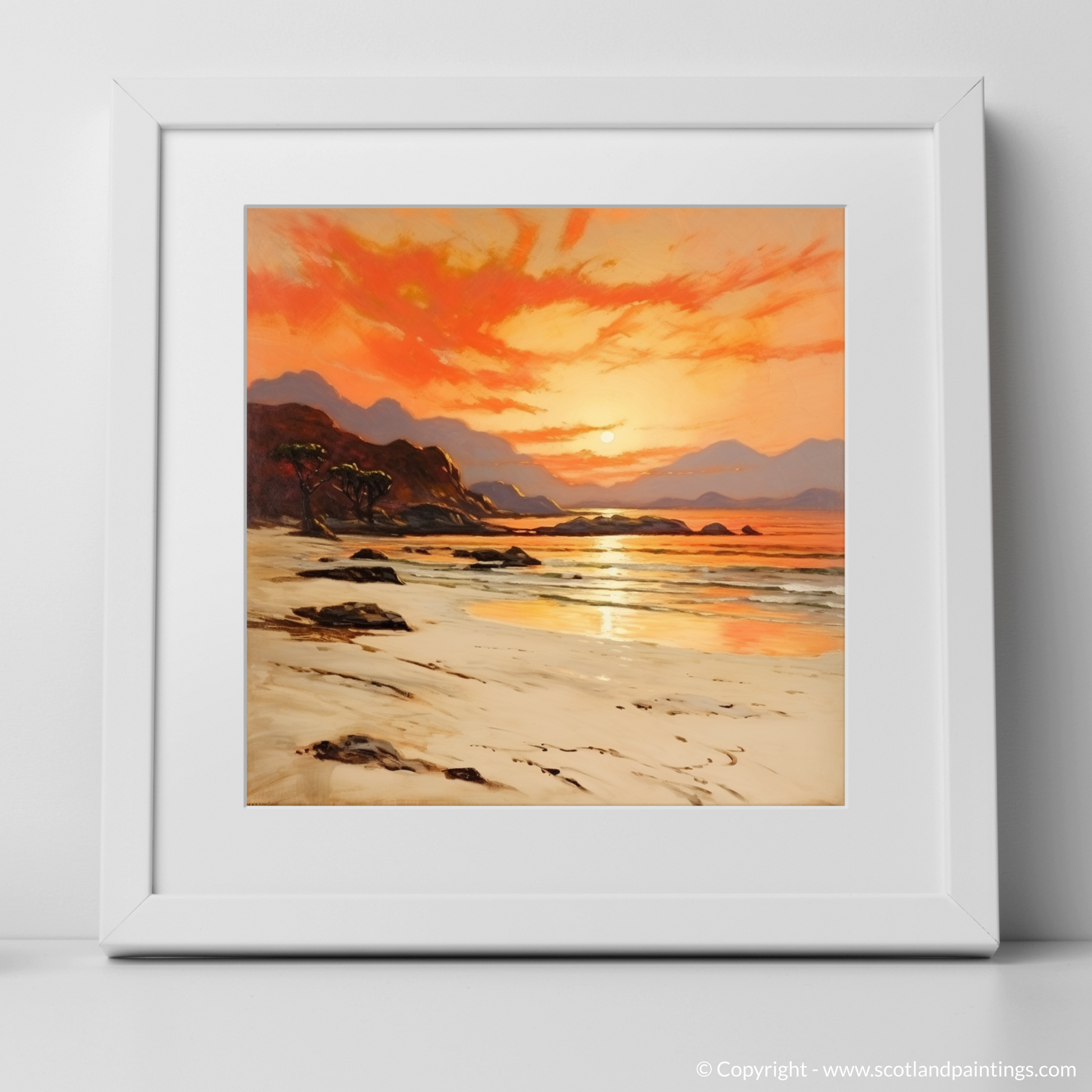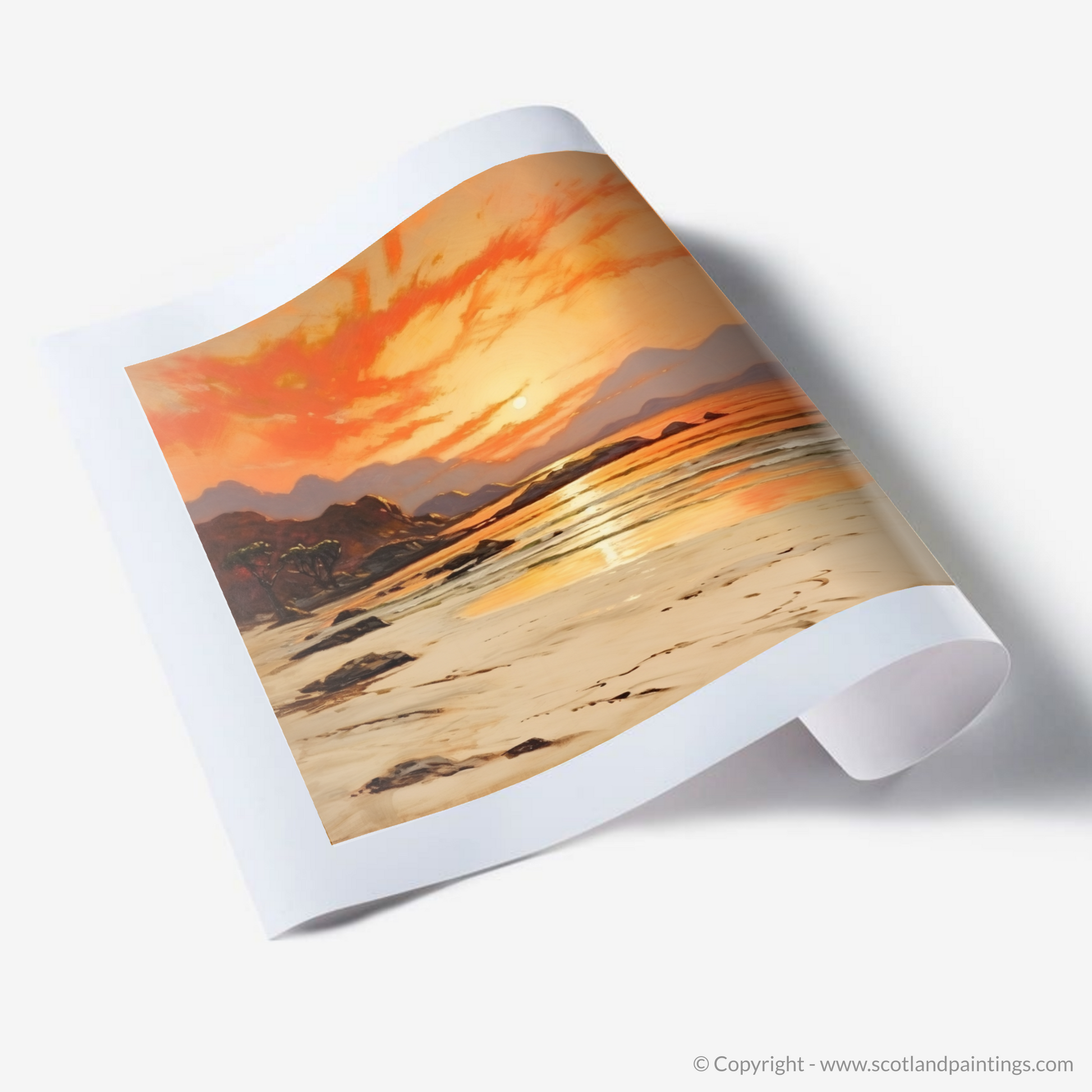 Immerse yourself in the ethereal beauty of the Scottish Highlands with our captivating print, inspired by the majestic sunset over the Silver Sands of Morar. This exquisite piece transports viewers to a serene shore where the fiery glow of the descending sun bathes the sky in a symphony of vibrant reds and warm oranges. The radiant hues are boldly juxtaposed with the cool, gentle purples and blues of the distant mountains, creating a dynamic Fauvist interpretation brimming with energy and emotion.