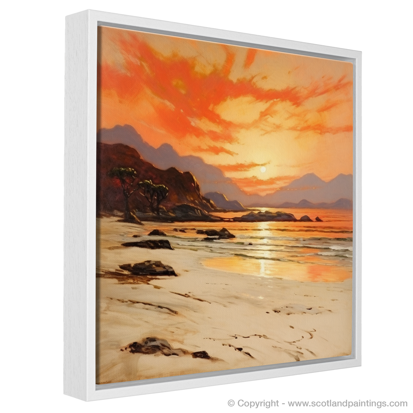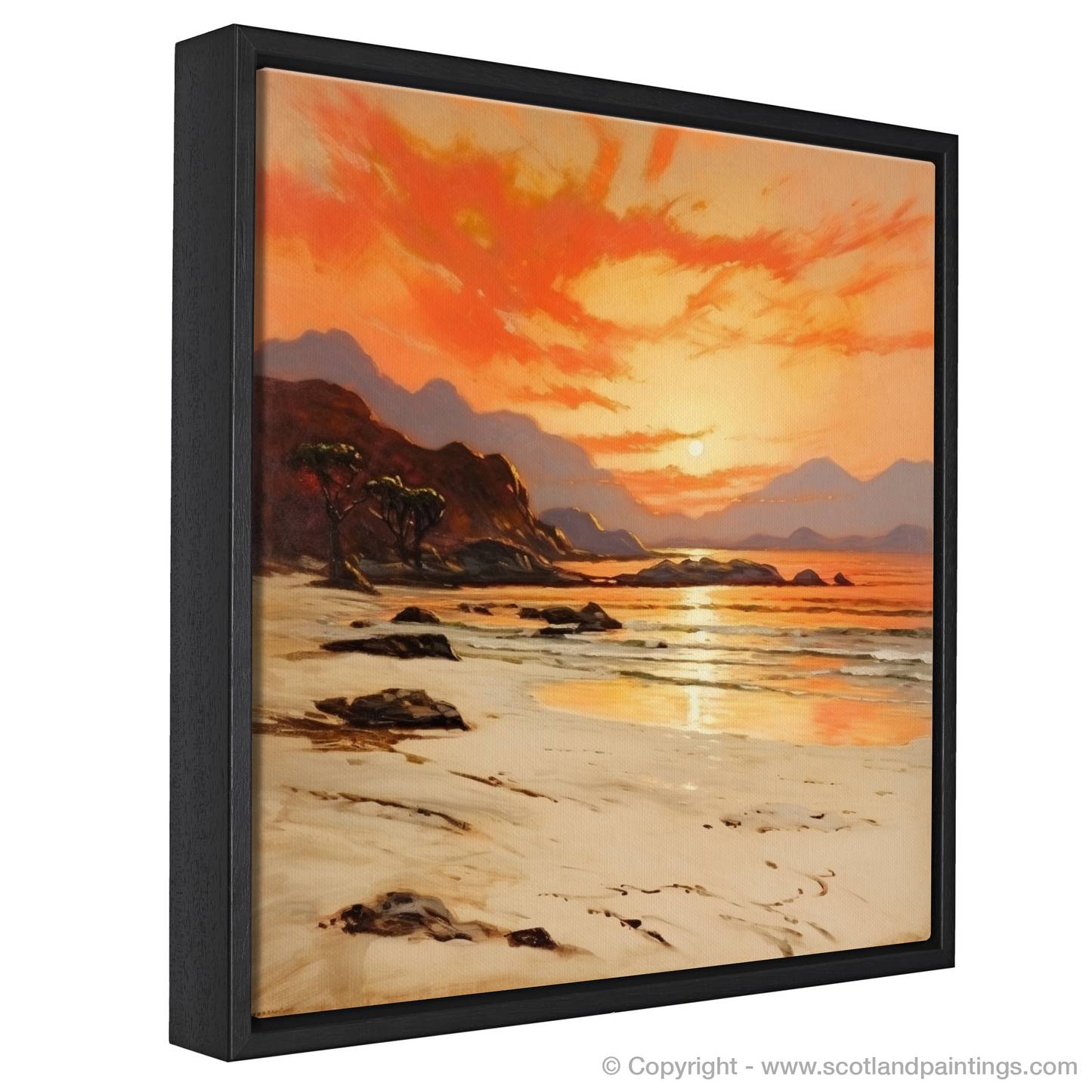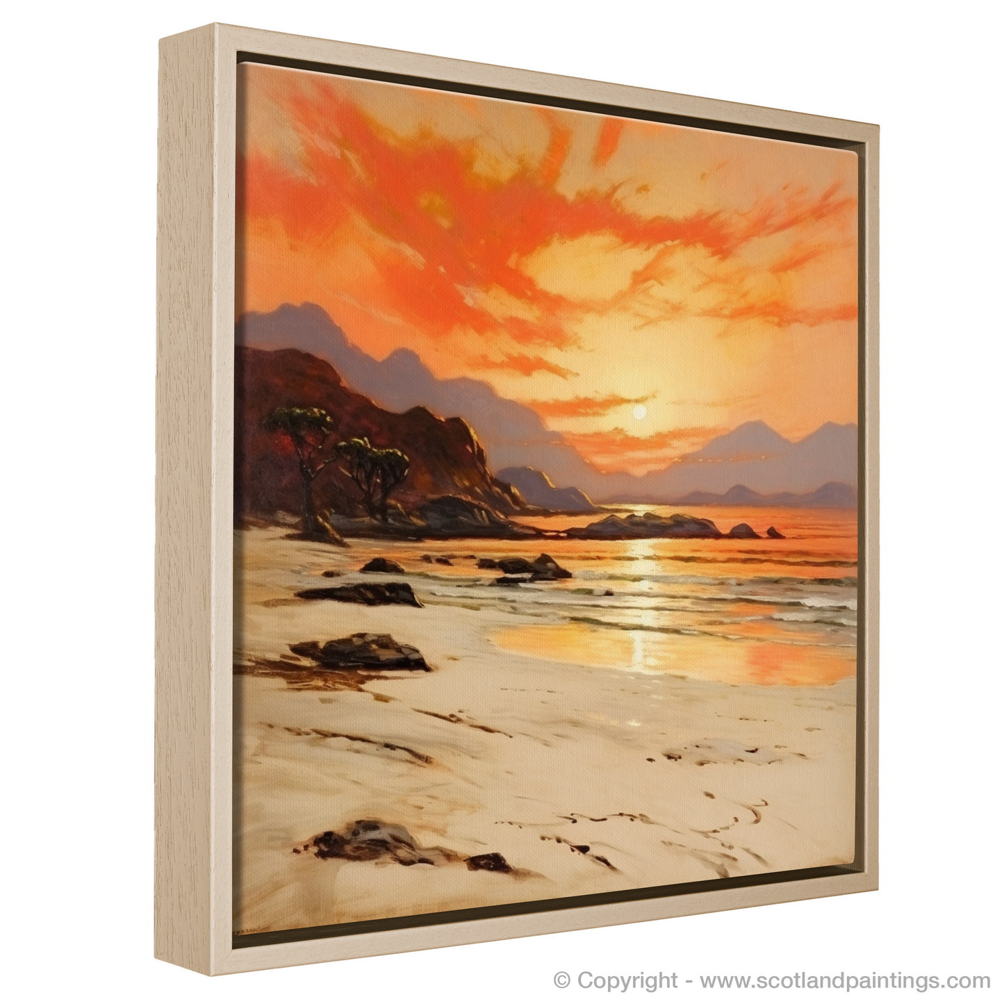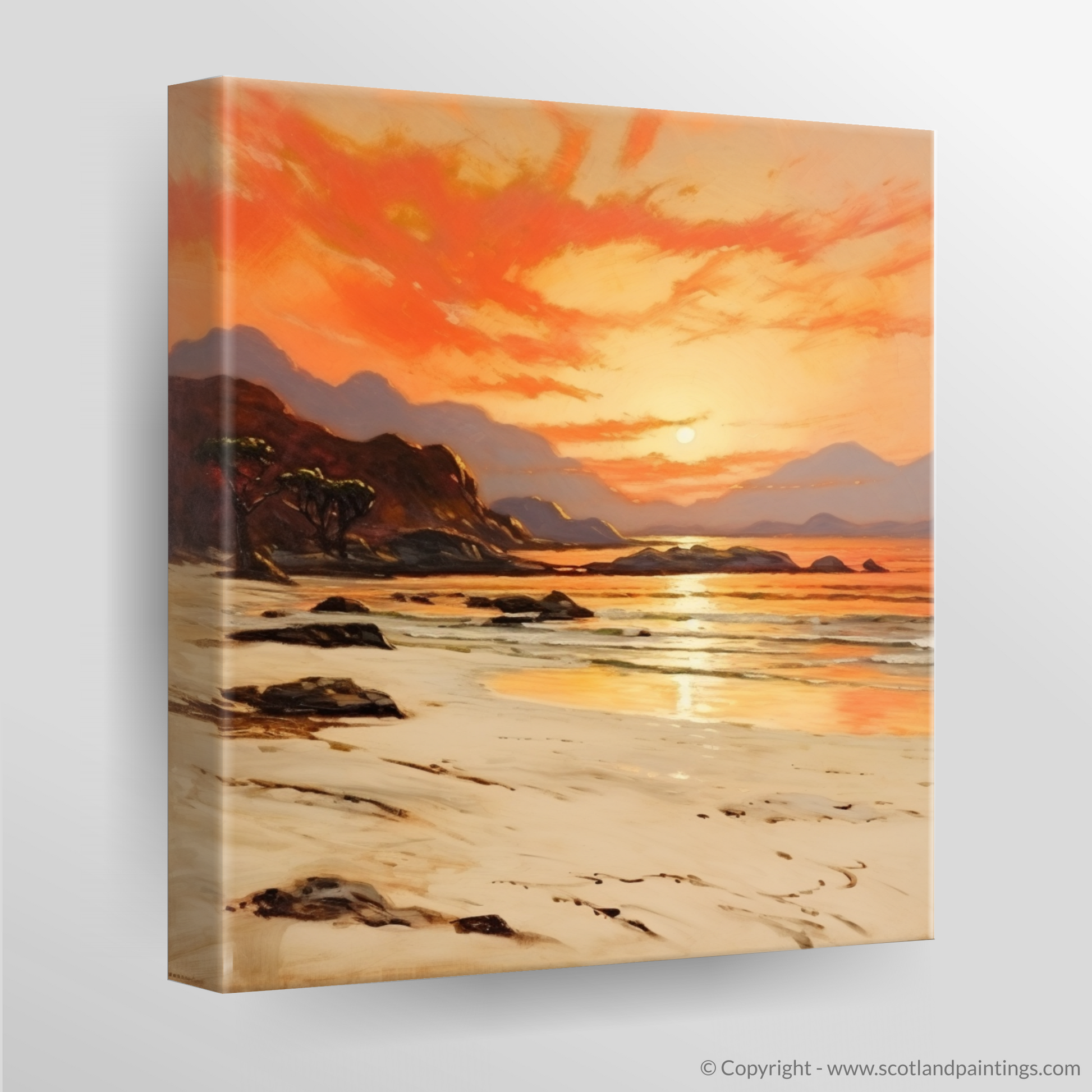 Immerse yourself in the ethereal beauty of the Scottish Highlands with our captivating print, inspired by the majestic sunset over the Silver Sands of Morar. This exquisite piece transports viewers to a serene shore where the fiery glow of the descending sun bathes the sky in a symphony of vibrant reds and warm oranges. The radiant hues are boldly juxtaposed with the cool, gentle purples and blues of the distant mountains, creating a dynamic Fauvist interpretation brimming with energy and emotion.