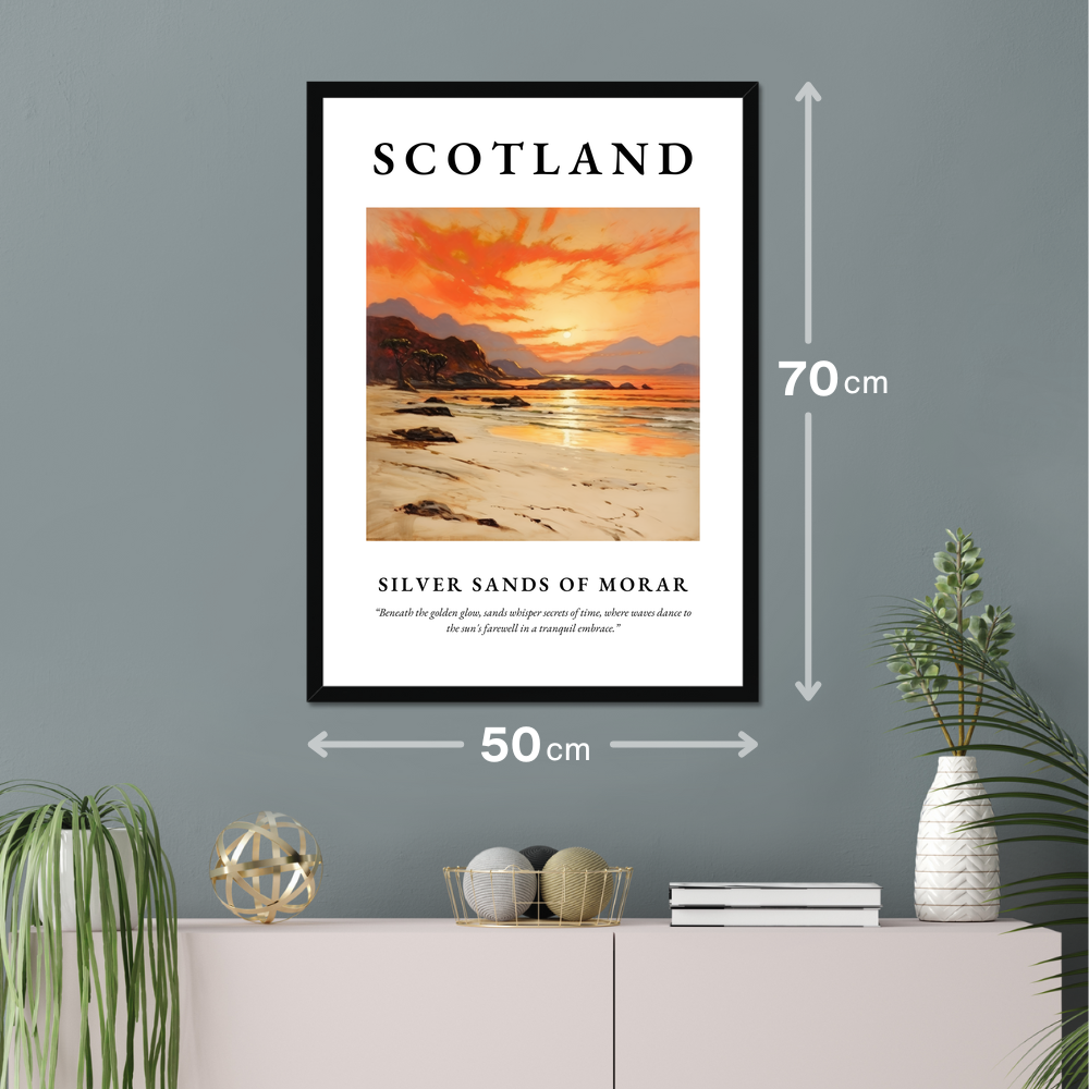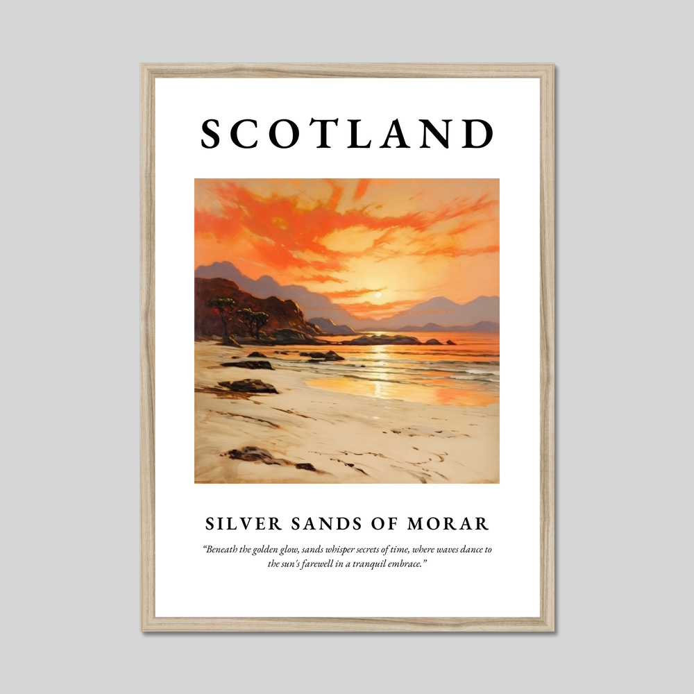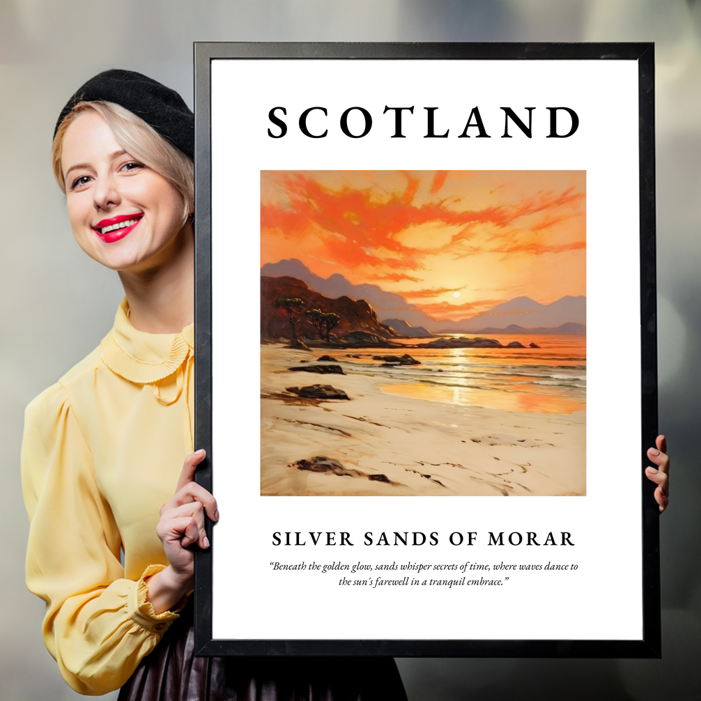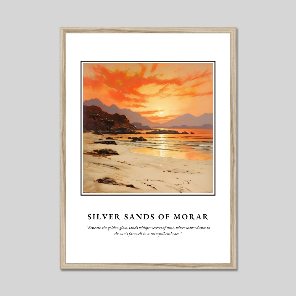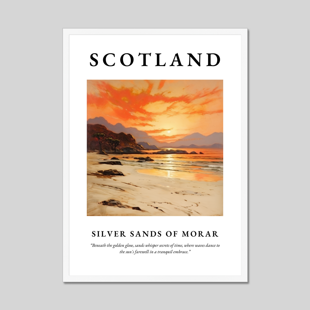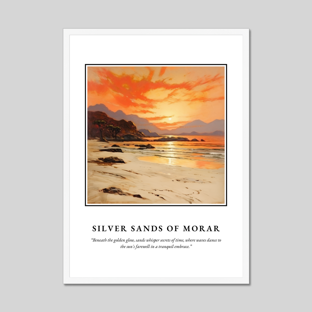 Silver Sands of Morar is a stunning coastal stretch in Scotland, renowned for its pristine white sands and clear turquoise waters. Nestled on the west coast, this magical place offers an ever-changing palette of colours as daylight fades, much like the artwork in our poster. The gentle lapping of waves and the whisper of winds create a symphony of natural tranquillity that soothes the soul.
