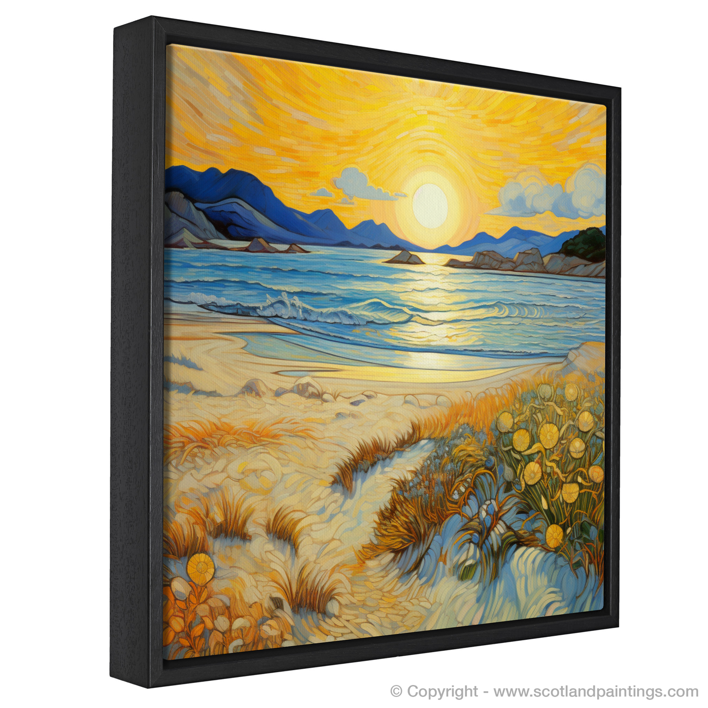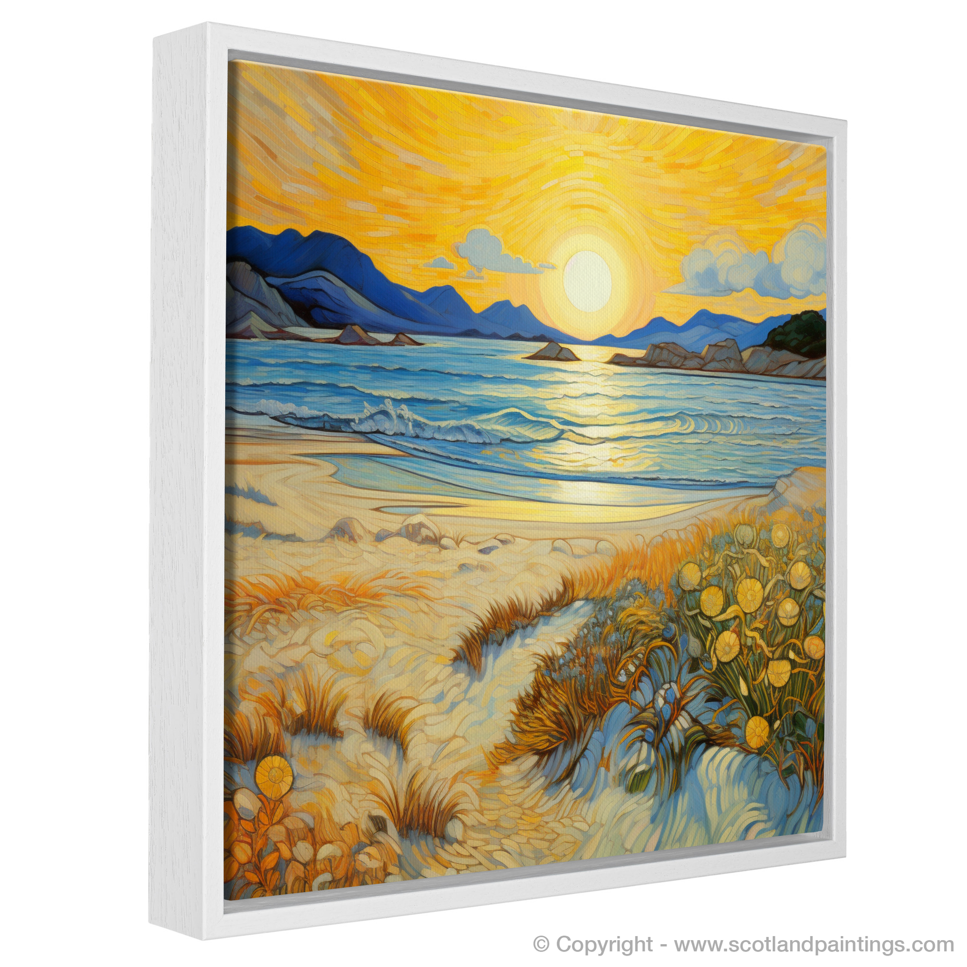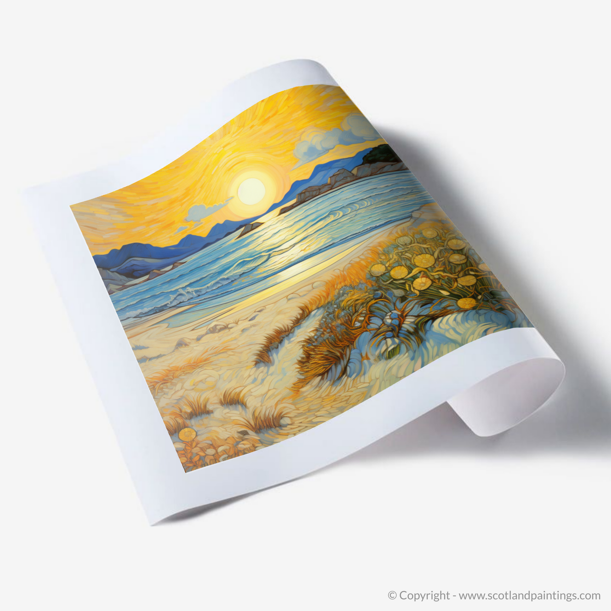 Capturing the serene tranquility of the Scottish coastline, this evocative print portrays the breath-taking Silver Sands of Morar bathed in the warm glow of a setting sun. The piece resonates with the charm of Naive Art, where simplicity and child-like innocence are woven into the very fabric of the visual narrative. With brush strokes that convey a sense of wonder and unguarded expression, this artwork serves as a portal to Scotland's natural splendour.