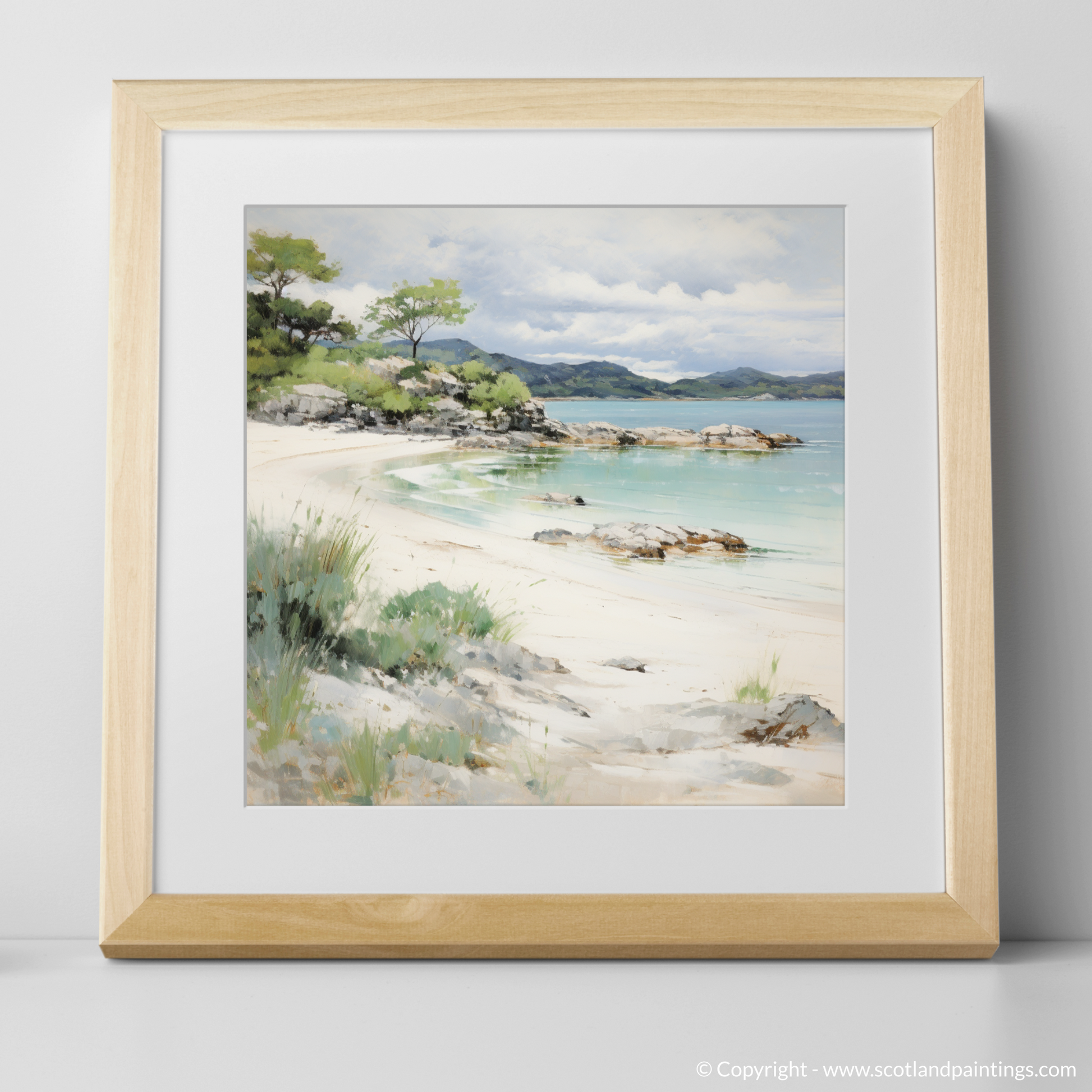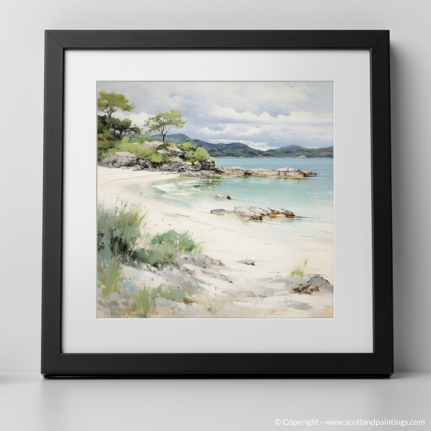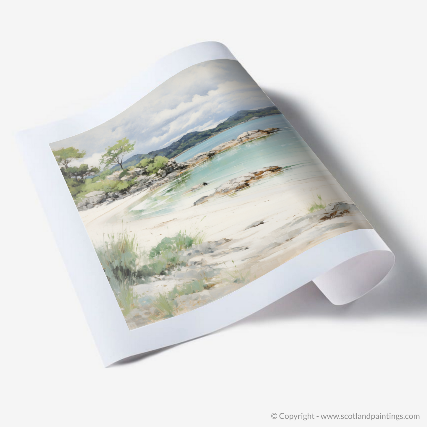 Immerse yourself in the serene beauty of the Scottish coastline with this exquisite interpretation of the Silver Sands of Morar. Suffused with the gentle touch of Impressionism, this print captures the unmistakable allure of one of Scotland's most picturesque beaches.
