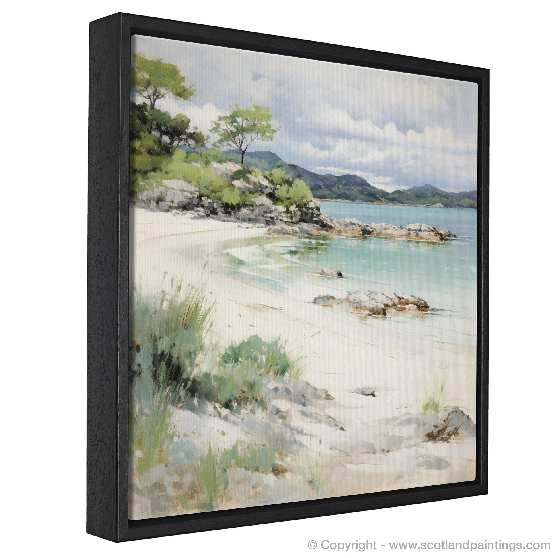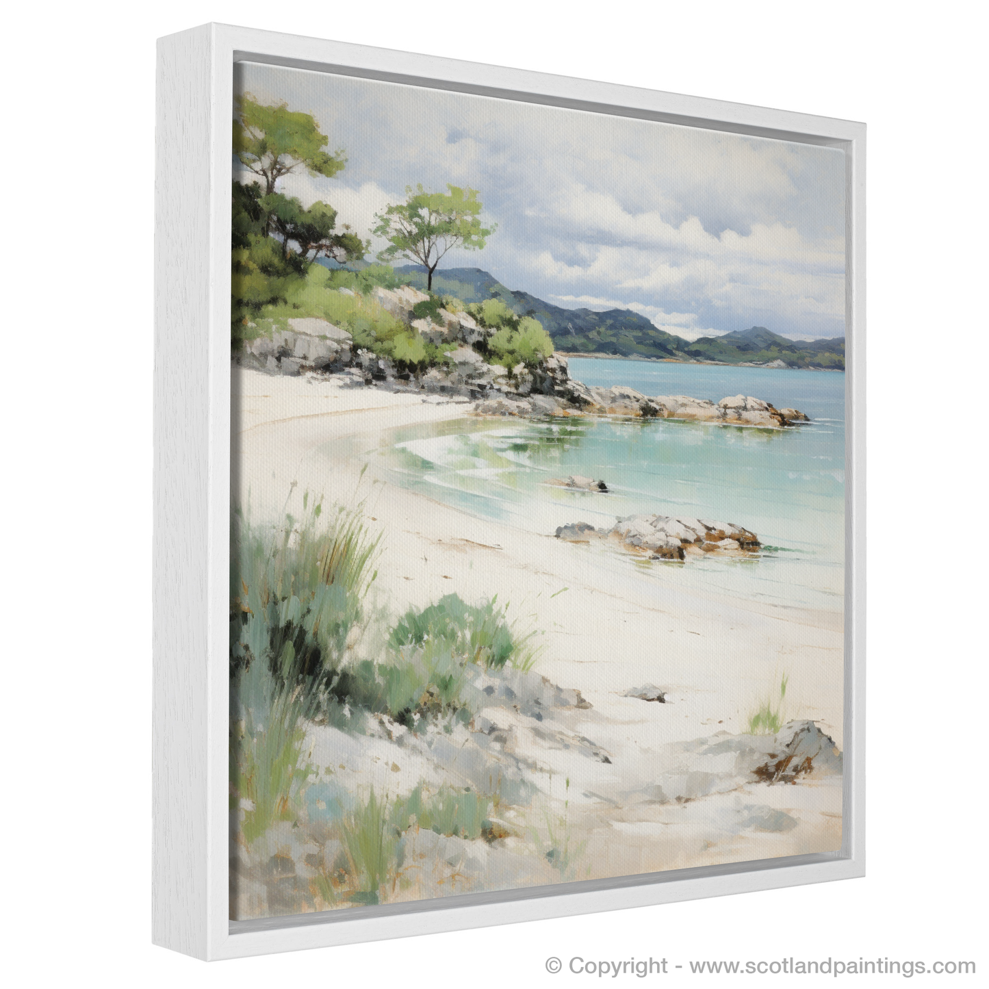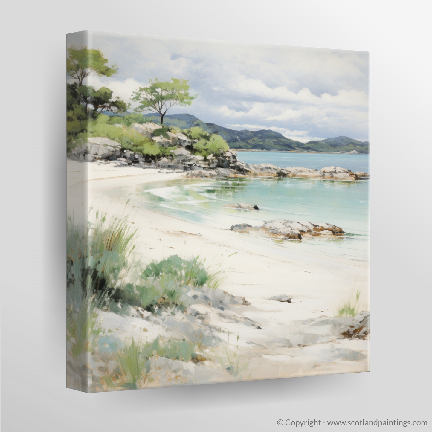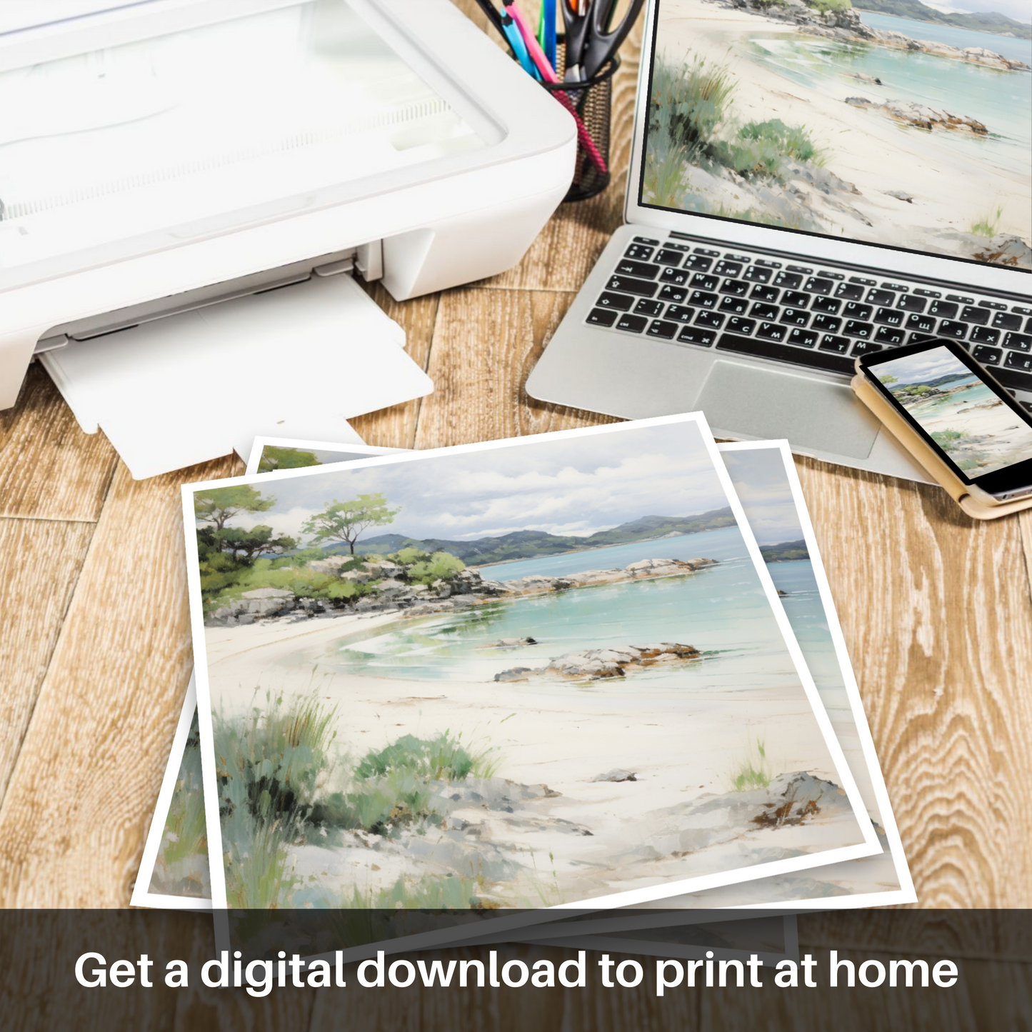 Immerse yourself in the serene beauty of the Scottish coastline with this exquisite interpretation of the Silver Sands of Morar. Suffused with the gentle touch of Impressionism, this print captures the unmistakable allure of one of Scotland's most picturesque beaches.