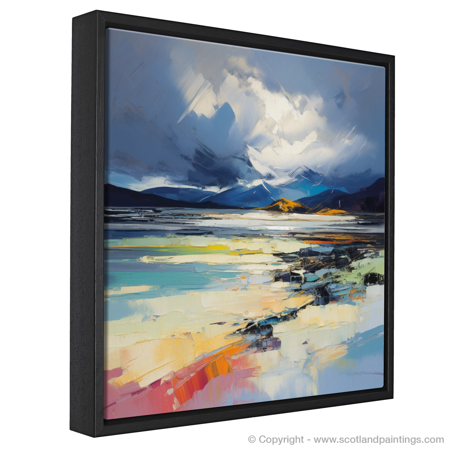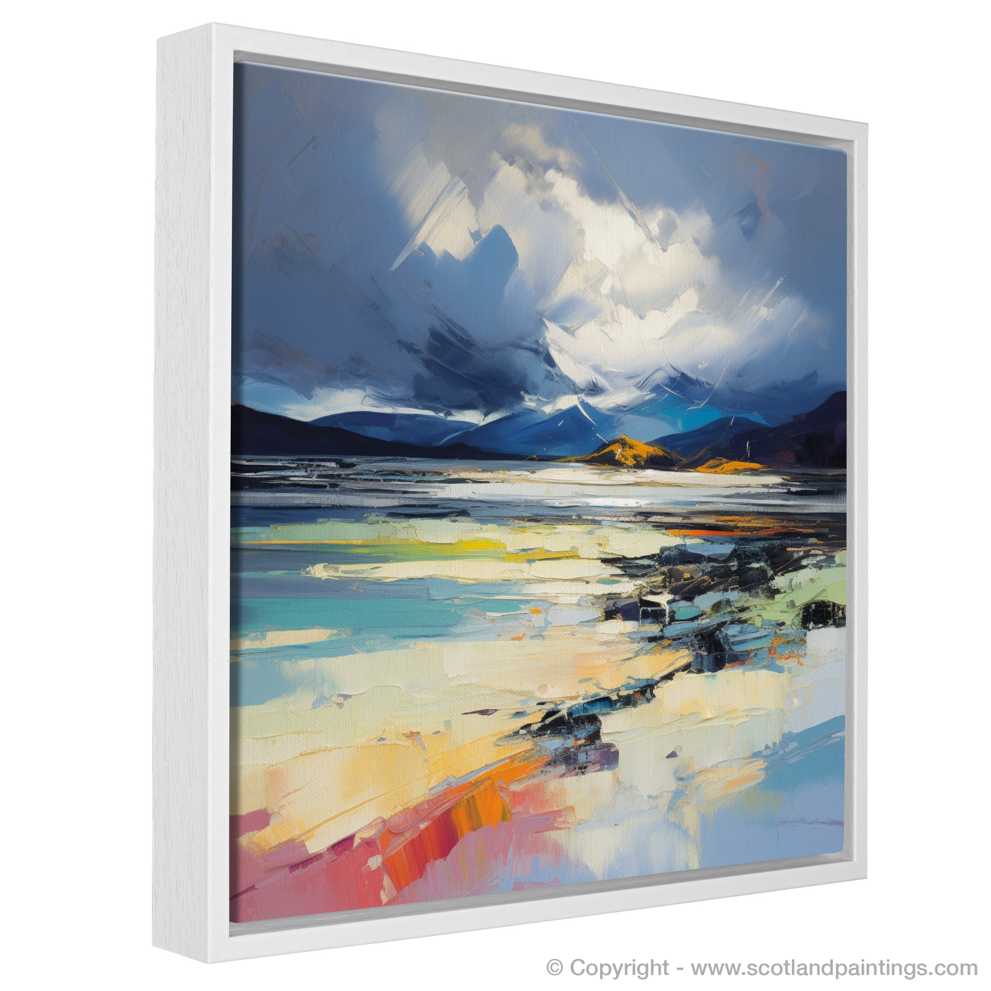 Embark on a visual journey to the rugged beauty of Scotland's coast with this evocative print, channeling the wild spirit of the Silver Sands of Morar under a tempestuous sky. This Abstract Expressionist piece captures the tumult of an approaching storm contrasting against the serene beauty of the seashore.