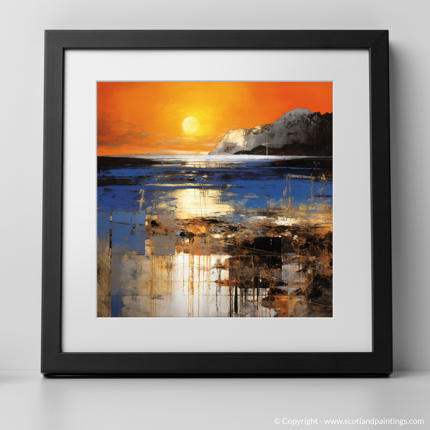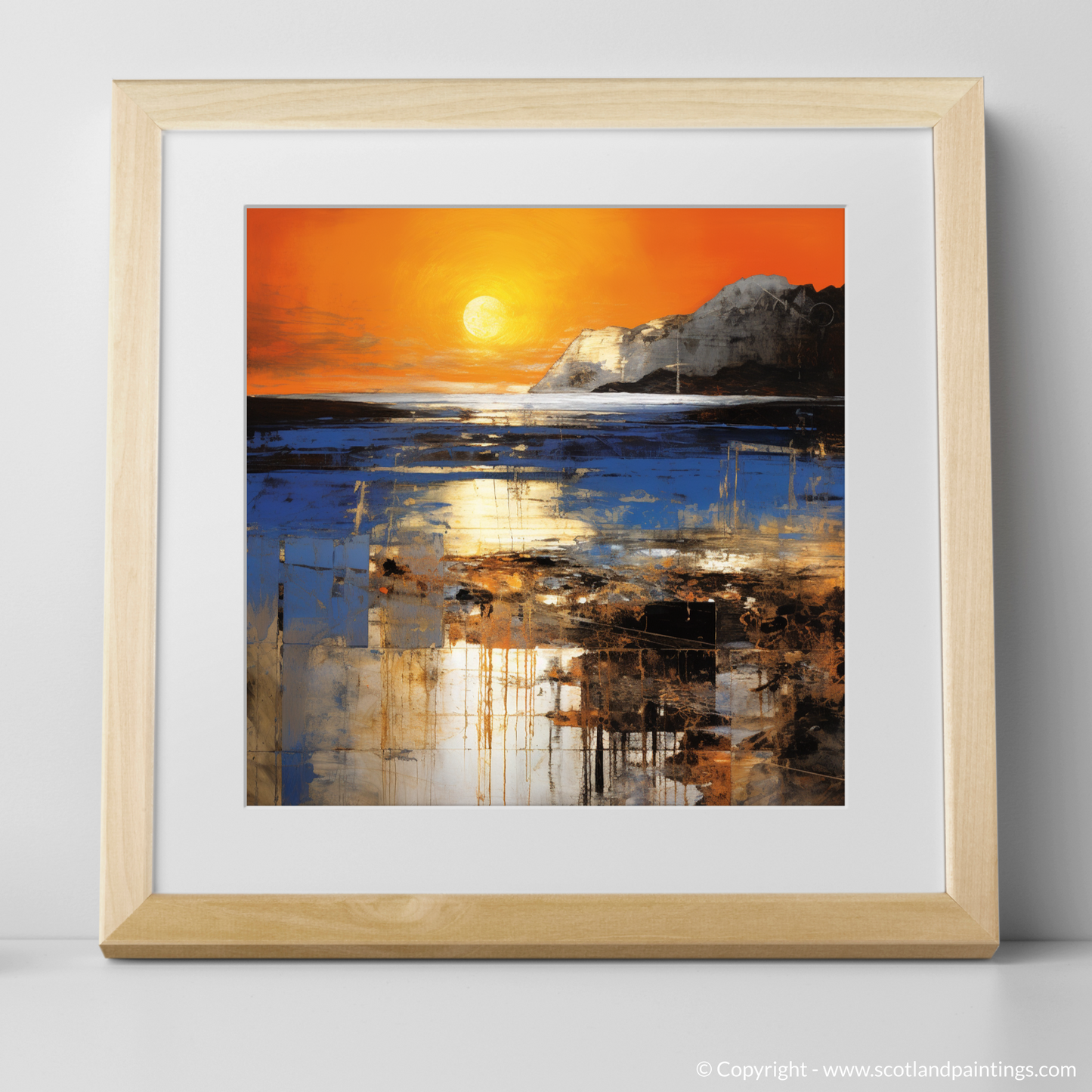 Immerse yourself in a creative reimagining of the serene Silver Sands of Morar, transformed into a vibrant pop art panorama. This bold interpretation captures the essence of a coastal twilight, where the Scottish shore is bathed in the fiery hues of sunset. A burnished orb hangs low, casting its amber glow across the sky, infusing it with a warm, electric orange that boldly contrasts with the cool blues of the reflective water below.