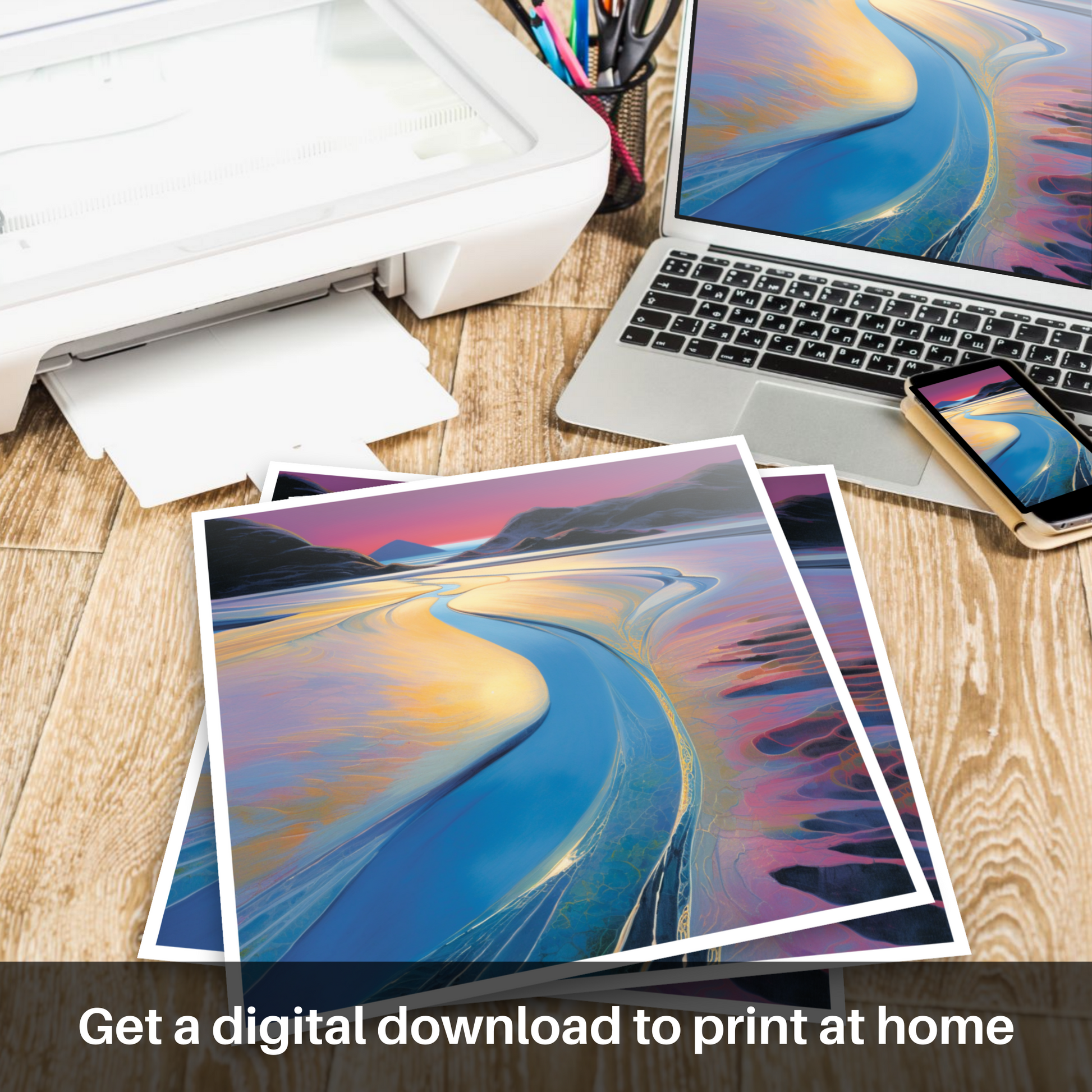 Capturing the effervescent glow of the Silver Sands of Morar at dusk, this vibrant print presents the viewer with a reimagined Scottish shoreline bathed in the last fleeting kisses of sunlight. Swathes of golden and azure hues dance across the canvas in bold, sweeping curves, embodying the natural serenity of the moment when day softly surrenders to night.