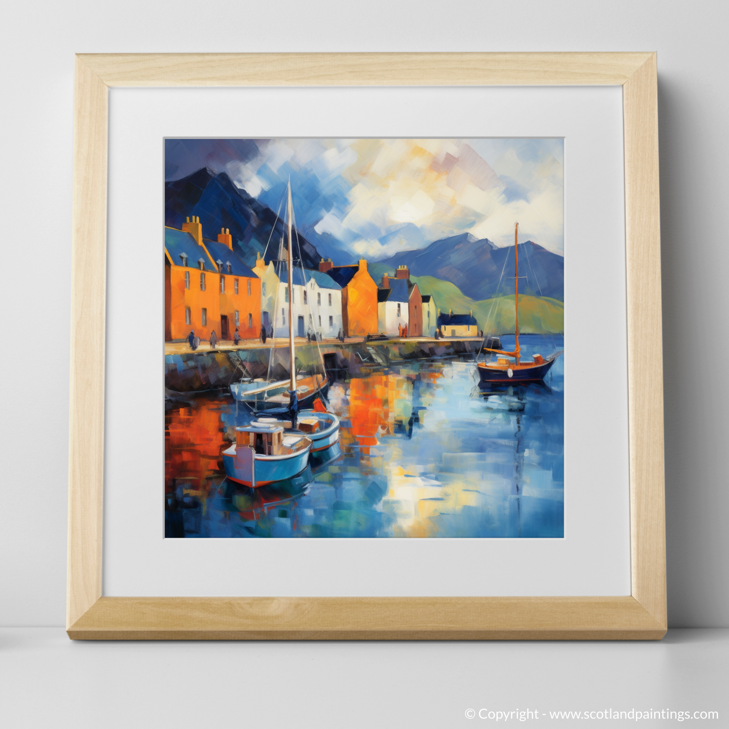 Embrace the serene beauty of Scotland's coastal charm with our enchanting depiction of Portree Harbour, a tranquil haven nestled in the heart of the Isle of Skye. Capturing the essence of the harbour's picturesque waterfront, this Impressionist-inspired print effuses a harmonious blend of vivacious colour and gentle movement.