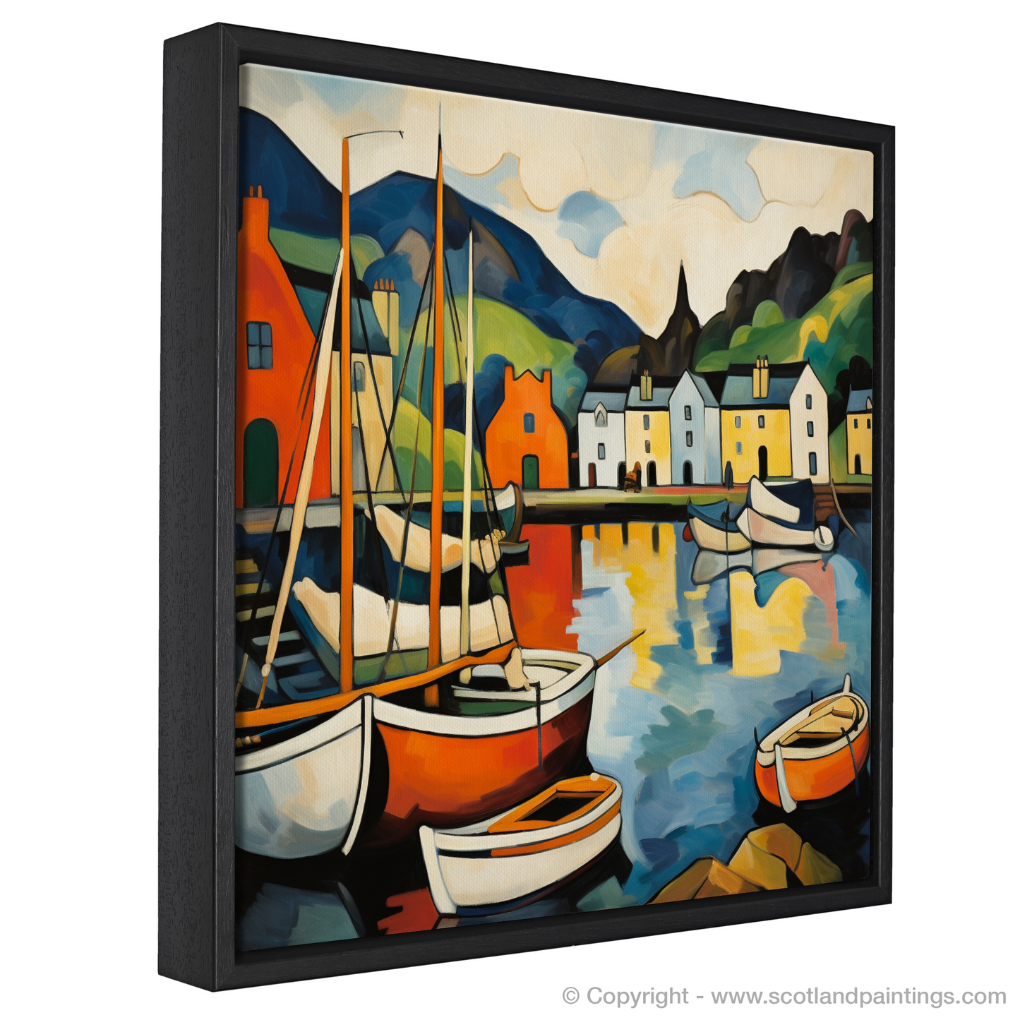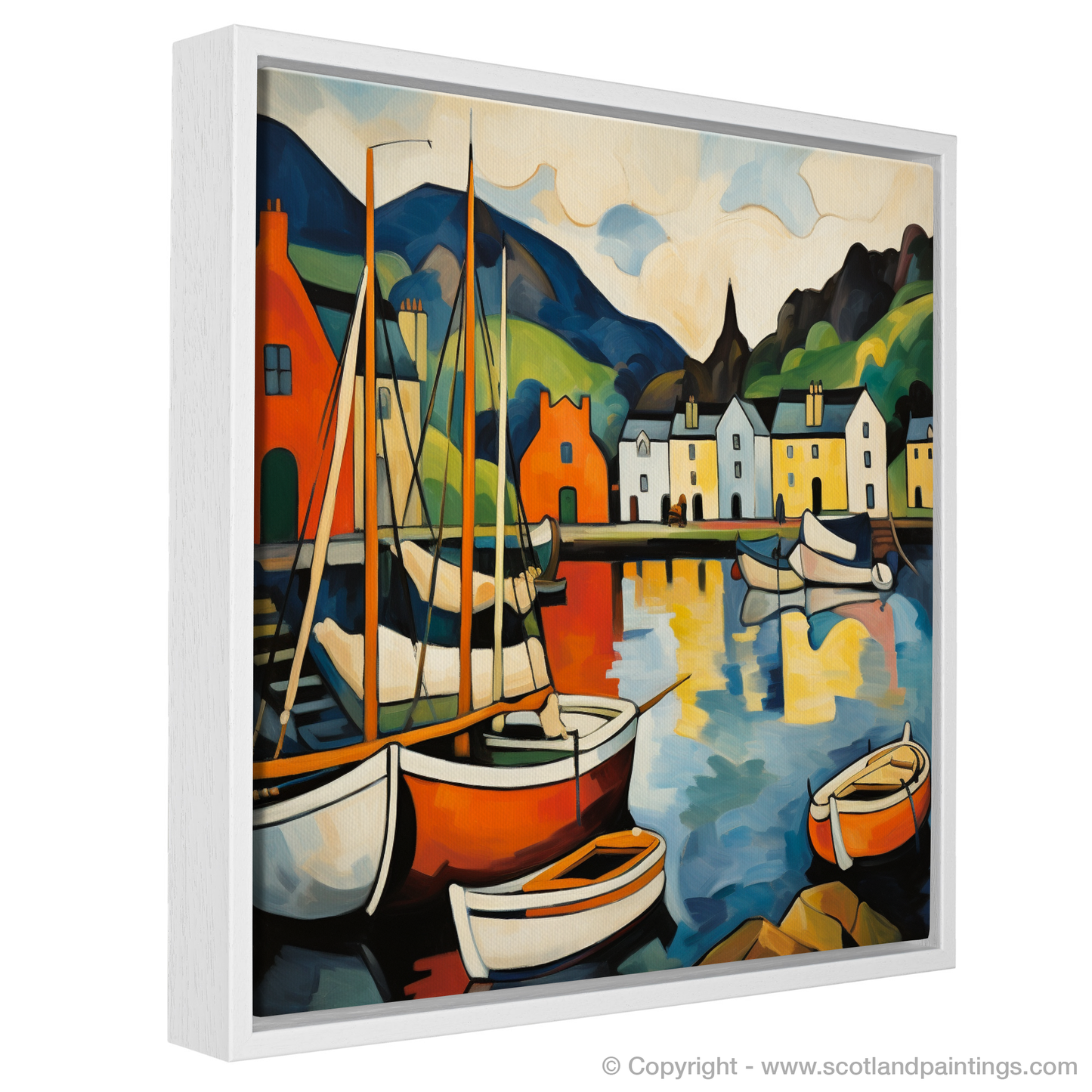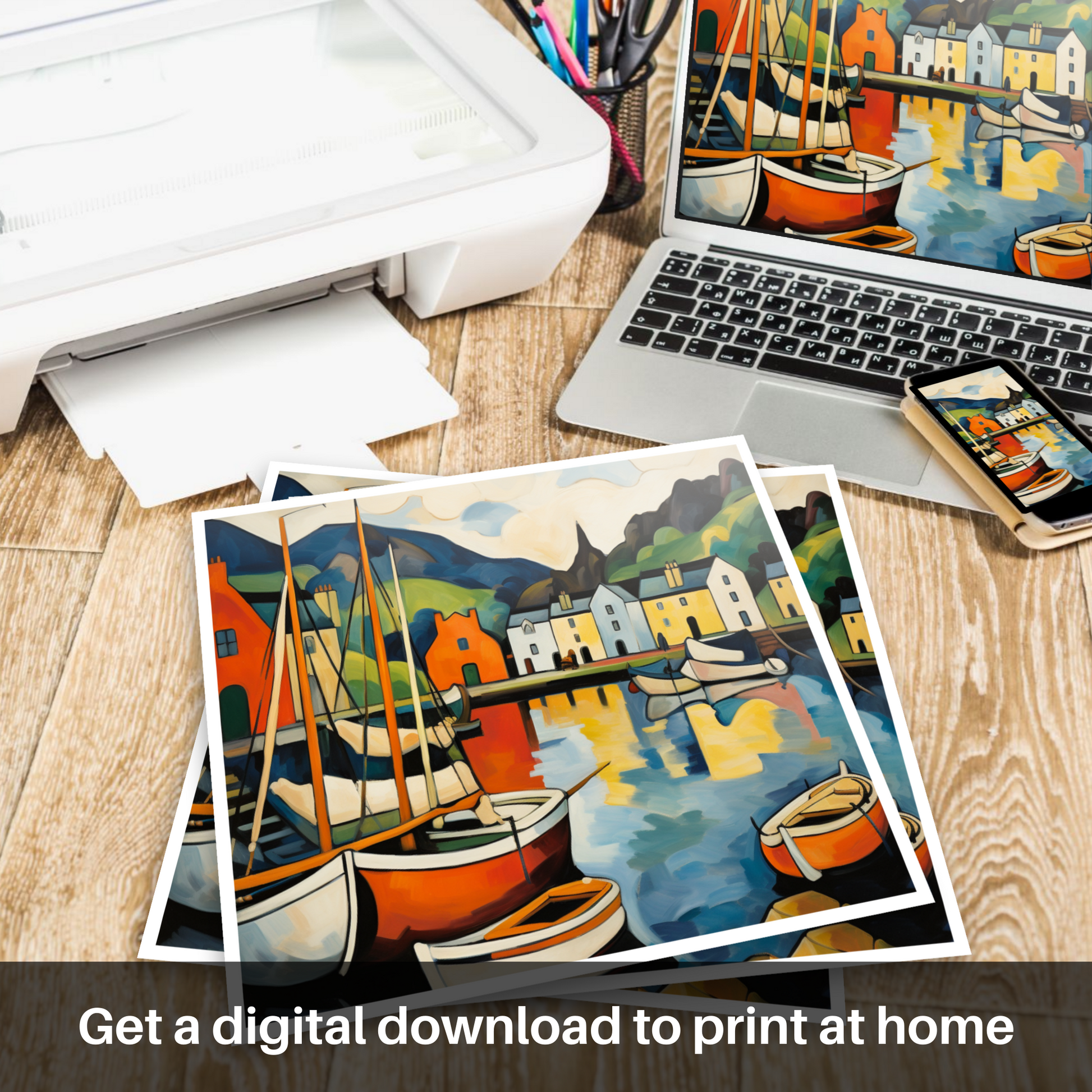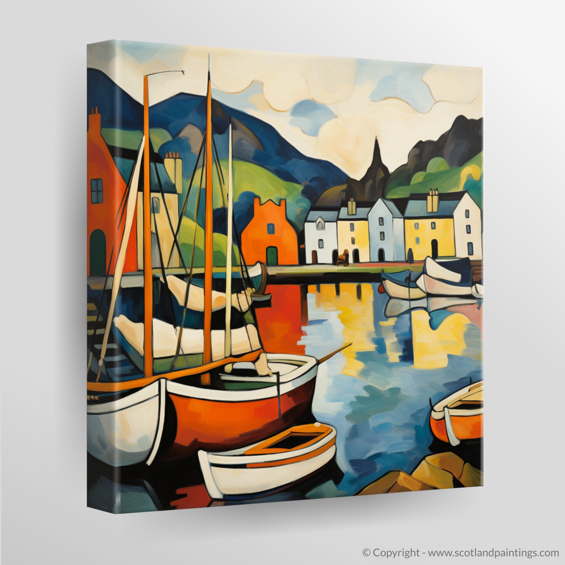 Immerse yourself in the vivid allure of a fauvist-inspired print, depicting the charming and bustling Portree Harbour from the Isle of Skye. At first glance, the viewer is struck by the dazzling interplay of colour and form, a hallmark of the Fauvist approach that favours painterly qualities and strong colour over the representational or realistic values retained by Impressionism.