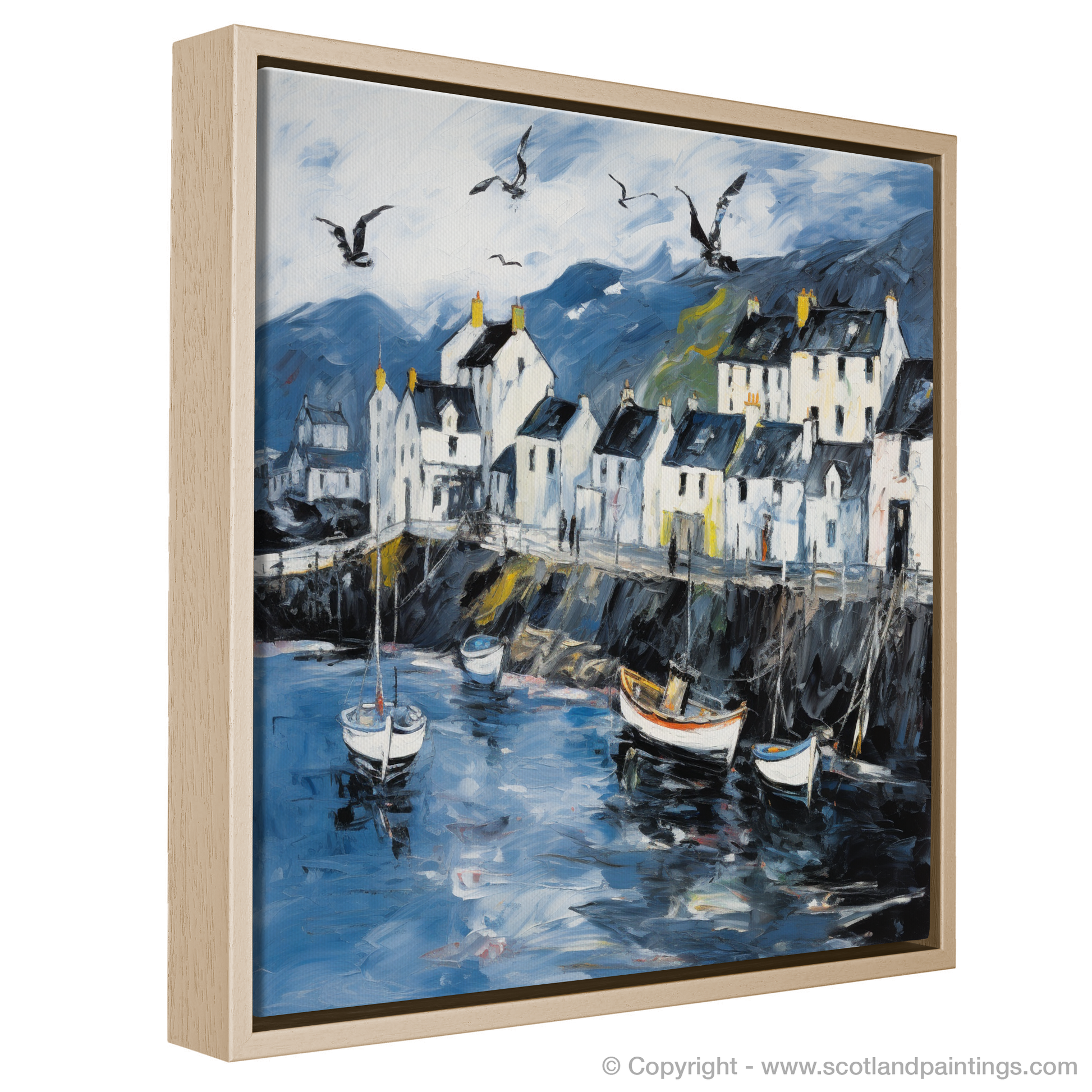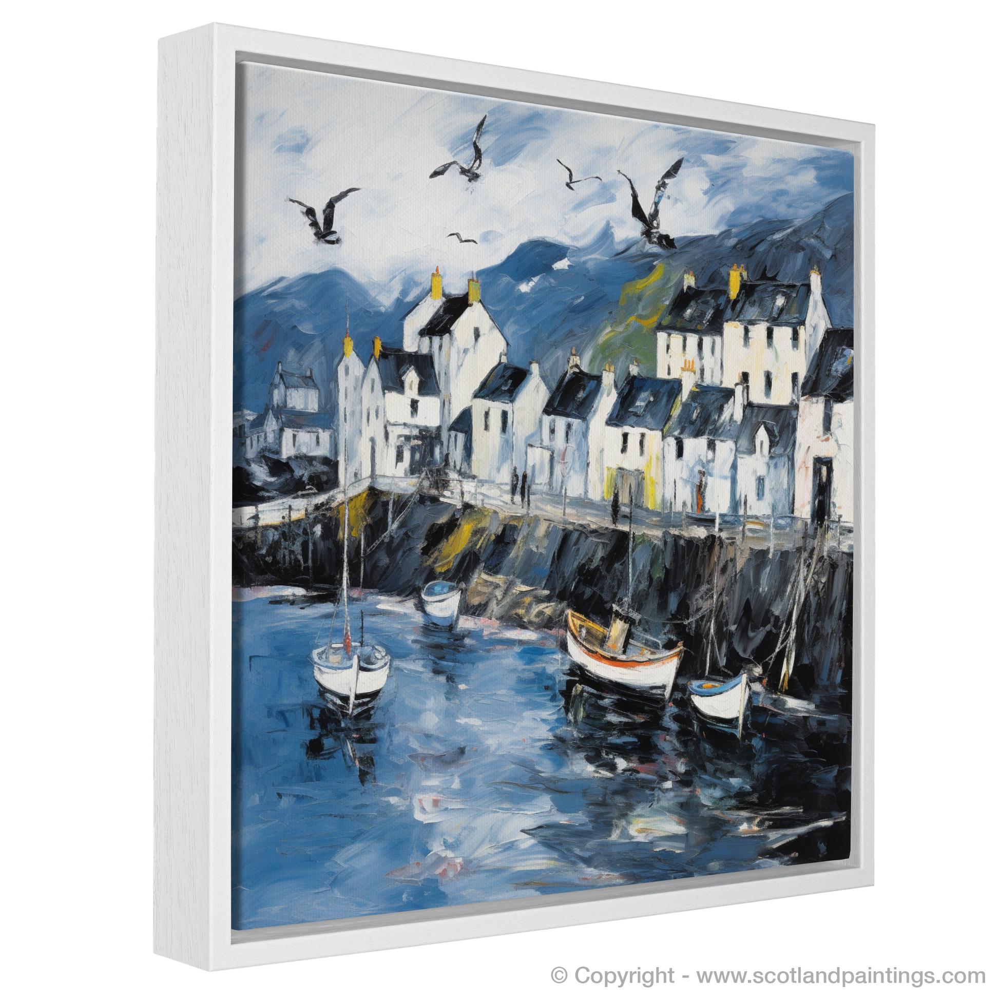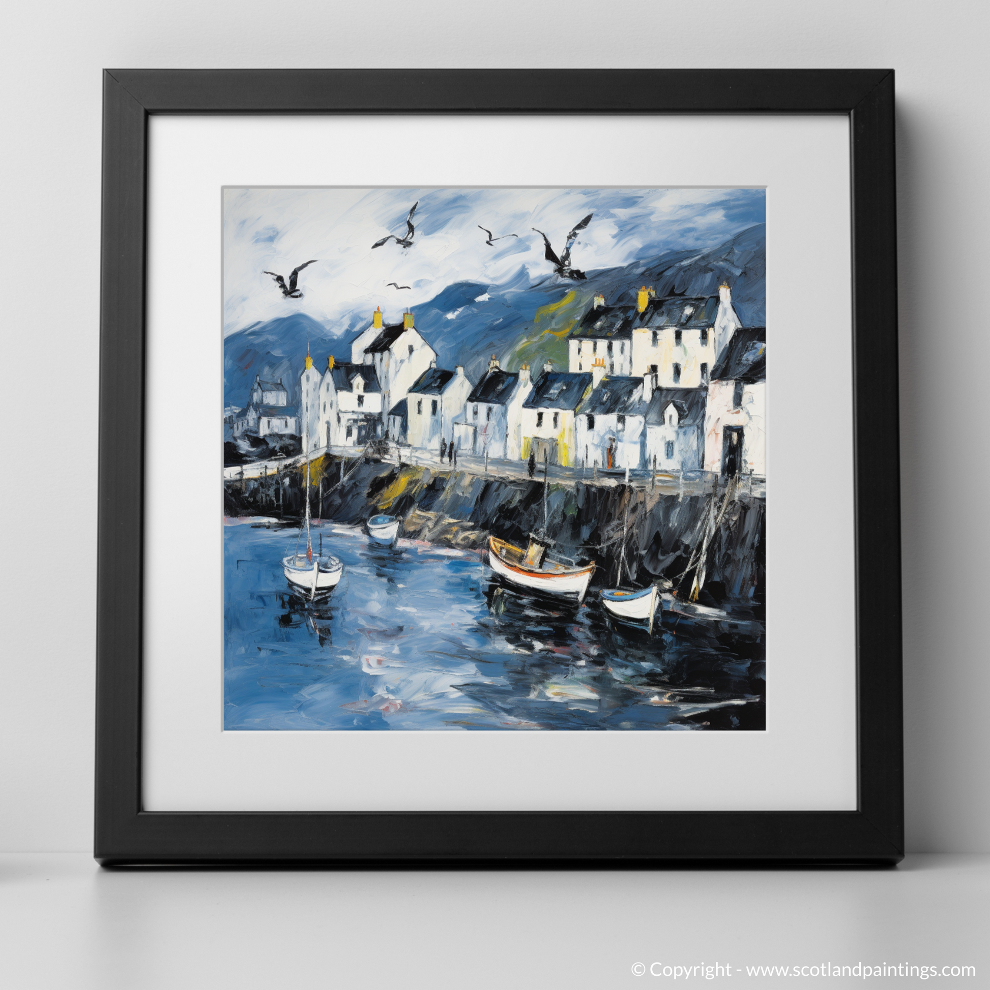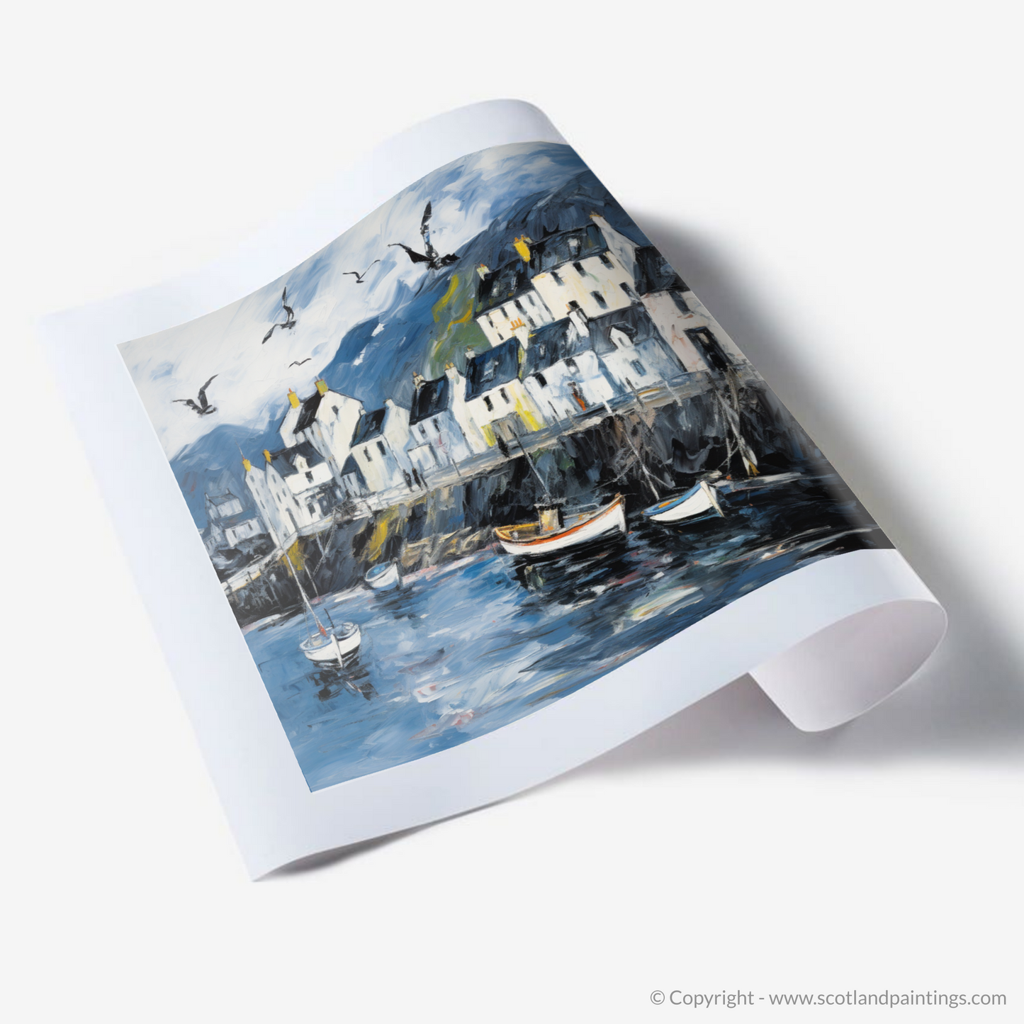 Let the essence of the Scottish coastline embrace your living space with this evocative abstract print, celebrating the rugged charm of Portree Harbour on the Isle of Skye. A masterful tapestry of brushstrokes captures the swirling energy of the sea, juxtaposed with the tranquil outlines of moored boats bobbing gently on water that reflects the mood of the sky above. The harbour front is depicted through an animated play of light and shade, with the crisp whites of the buildings standing boldly against a backdrop of moody hues. These structures, each uniquely detailed by windows that appear to hold centuries of stories, give way to a dynamic skyline under a broad expanse of sky.