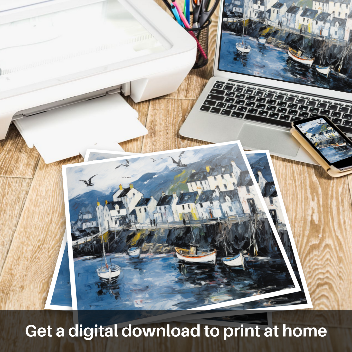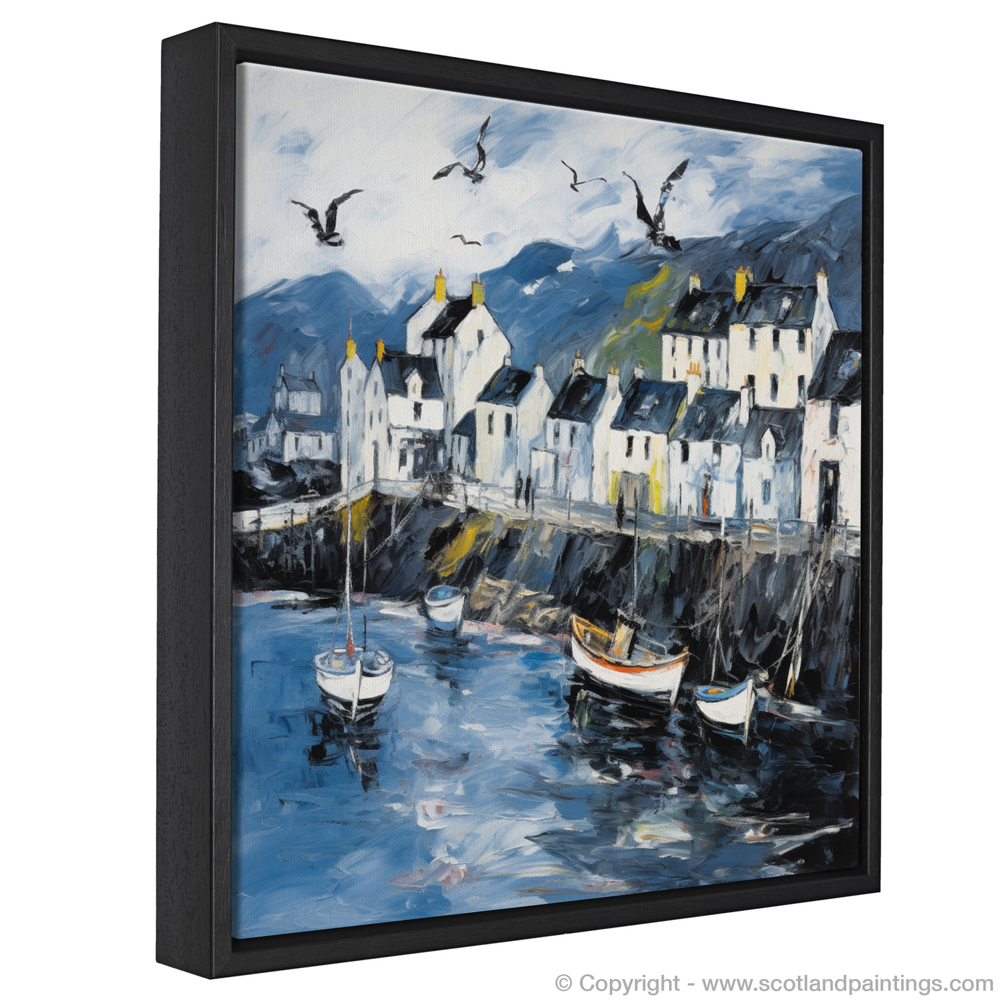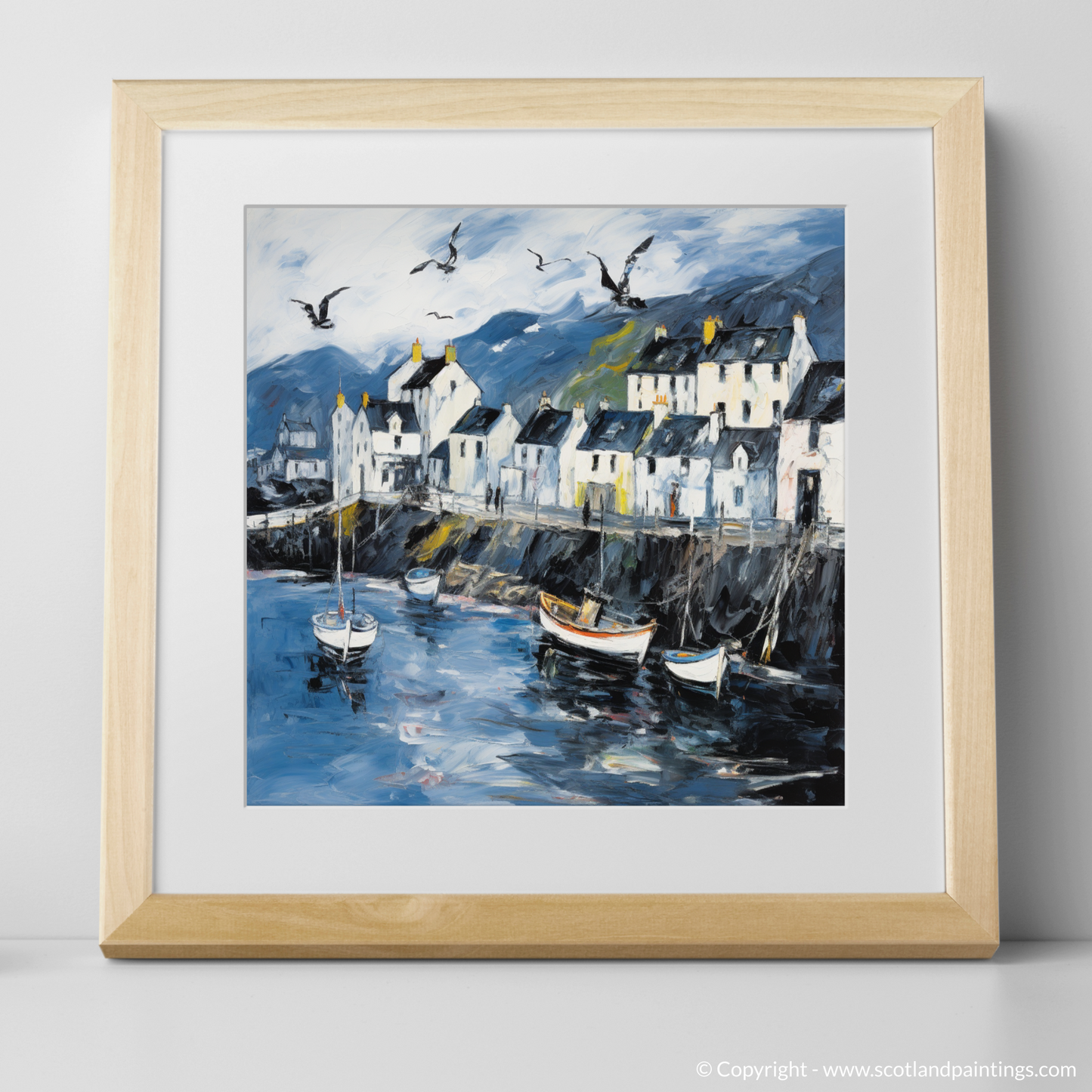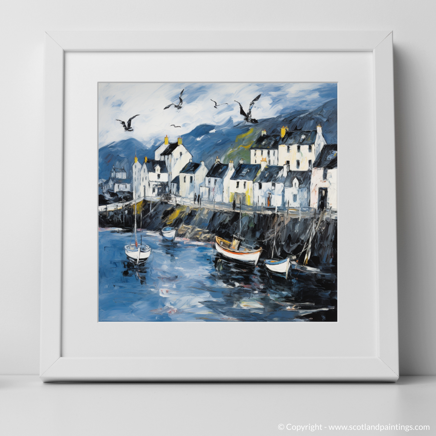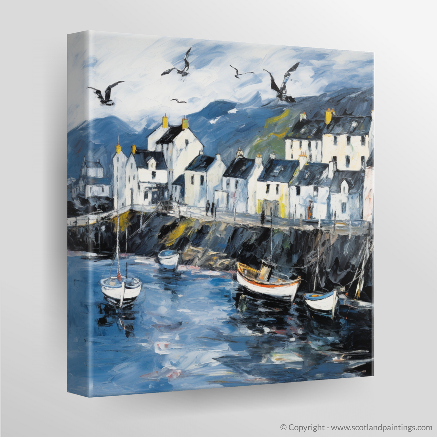 Let the essence of the Scottish coastline embrace your living space with this evocative abstract print, celebrating the rugged charm of Portree Harbour on the Isle of Skye. A masterful tapestry of brushstrokes captures the swirling energy of the sea, juxtaposed with the tranquil outlines of moored boats bobbing gently on water that reflects the mood of the sky above. The harbour front is depicted through an animated play of light and shade, with the crisp whites of the buildings standing boldly against a backdrop of moody hues. These structures, each uniquely detailed by windows that appear to hold centuries of stories, give way to a dynamic skyline under a broad expanse of sky.