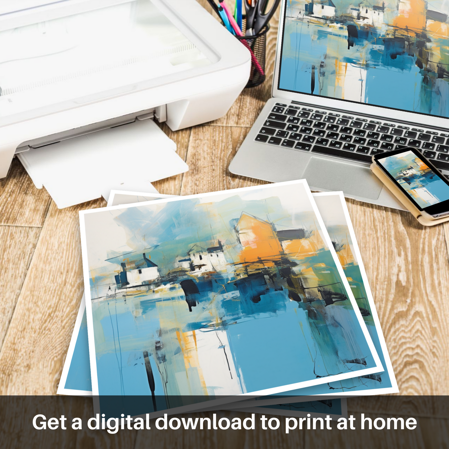 This print is a profound yet tranquil portrayal of Portree Harbour, offering a fresh and contemporary take on the scenic beauty of Scotland's harbours. It invites viewers to lose themselves within its abstract depths, and to find their own personal connection to the sublime Scottish coastline. It's a remarkable invitation to embrace the transformative power of art, envisaging the familiar through a lens of abstract creativity and colour.