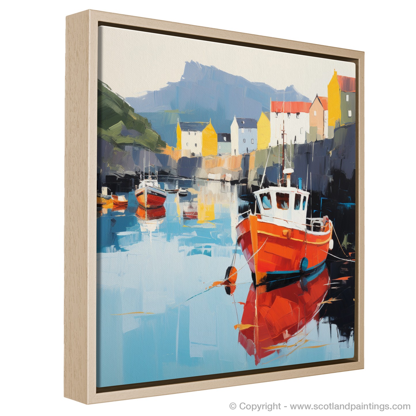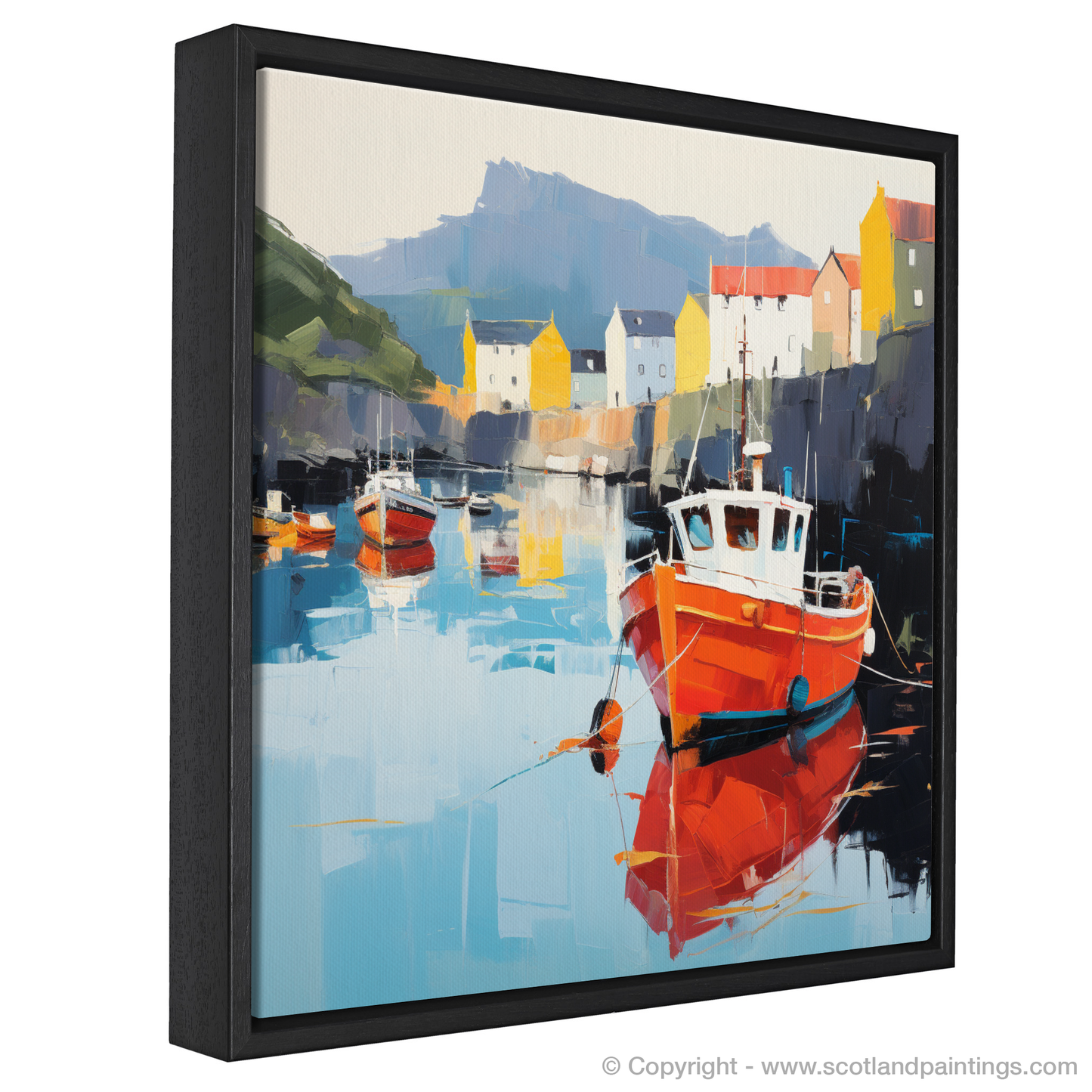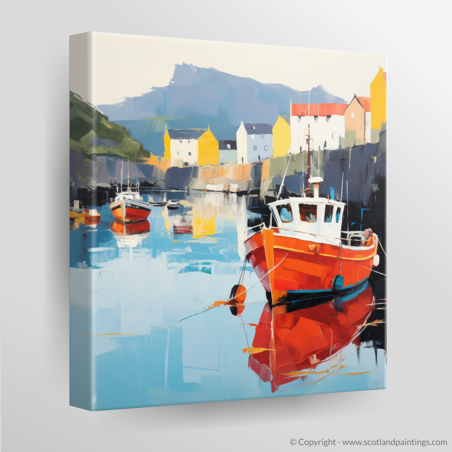 Transport your senses to the serene Scottish waters with this charming portrayal of the iconic Portree Harbour, nestled on the Isle of Skye. Envision a tranquil morning where the canvas comes alive with the calm mirror-like waters reflecting a fleet of boats moored against the quay. The glisten of the sea carries the vibrantly coloured vessels, including a striking orange-hued fishing boat that anchors the scene, its reflection a mesmerising dance of shape and hue upon the water's surface.