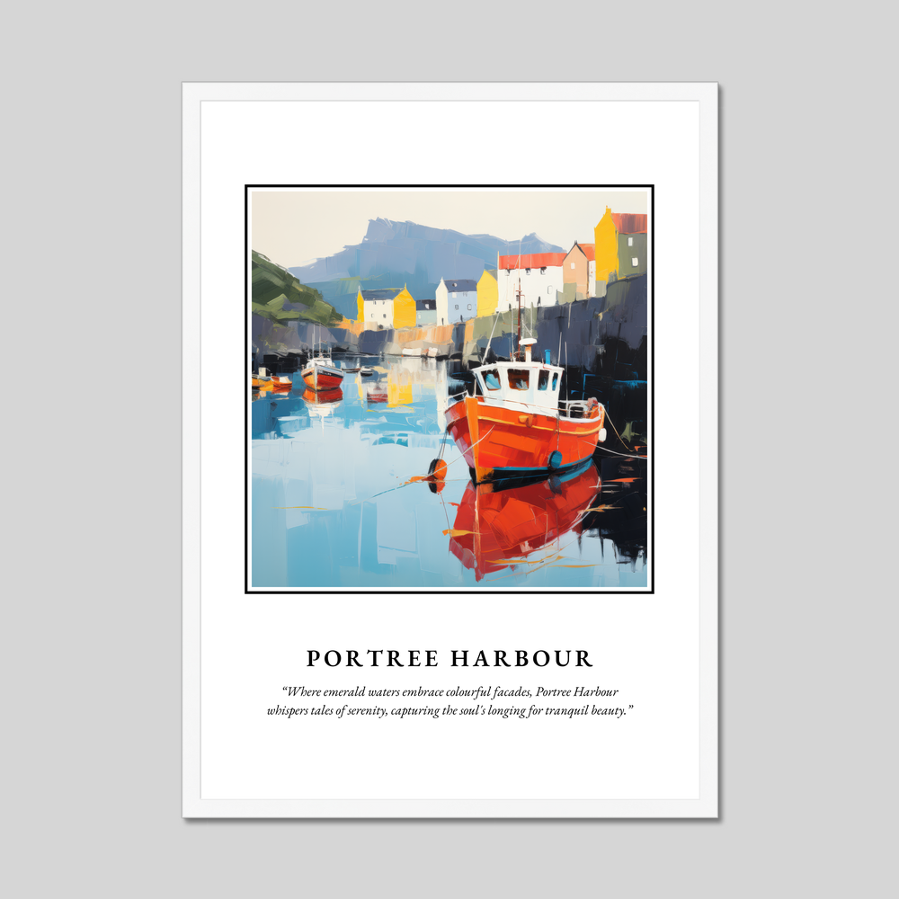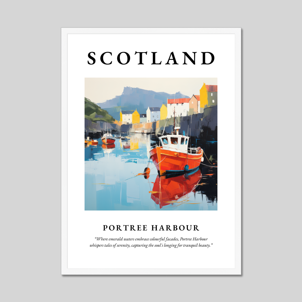 At the top of the poster, the bold declaration of "SCOTLAND" immediately catches the eye, setting the stage for the breathtaking artwork below. The painting captures the essence of Portree Harbour's idyllic setting with its array of colourful buildings reflecting gracefully on the emerald waters. The contemporary style employs a dynamic palette with expressive brushstrokes that bring the scene to life, offering a fresh and modern take on a timeless landscape. Below this vibrant depiction, the poetic quote reads: “Where emerald waters embrace colourful facades, Portree Harbour whispers tales of serenity, capturing the soul's longing for tranquil beauty.”