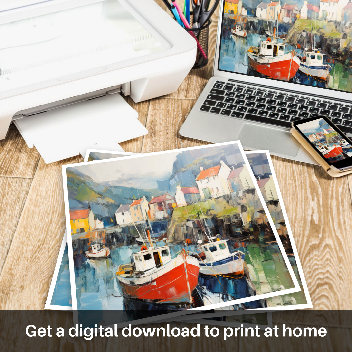 This stirring piece from our 'Scottish Harbours' collection is more than a mere visual treat; it's an invitation to wander through the timeless allure of Scotland's coastal heritage, a striking conversation piece destined to elevate any space with its dynamic energy and poetic interpretation of nature's beauty.