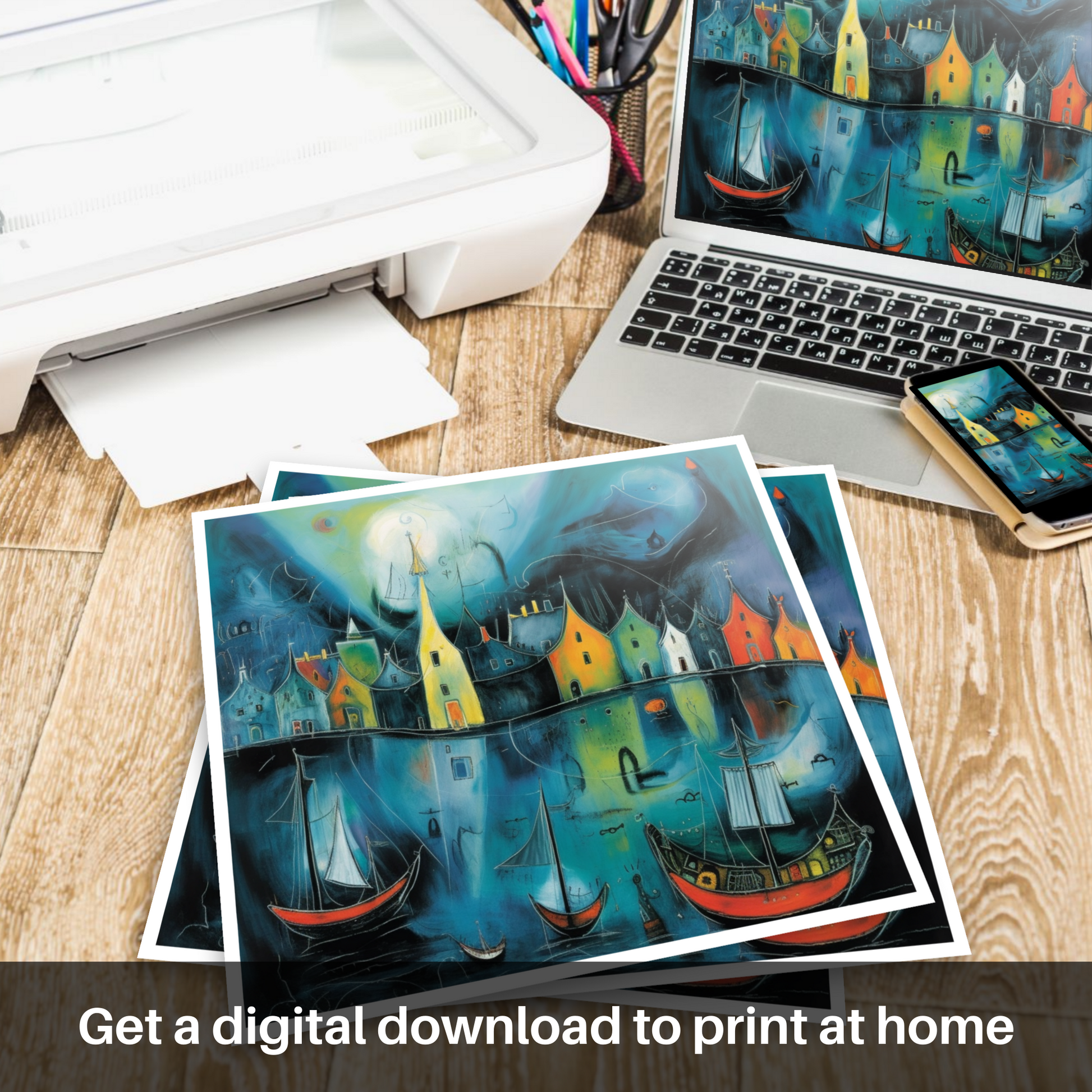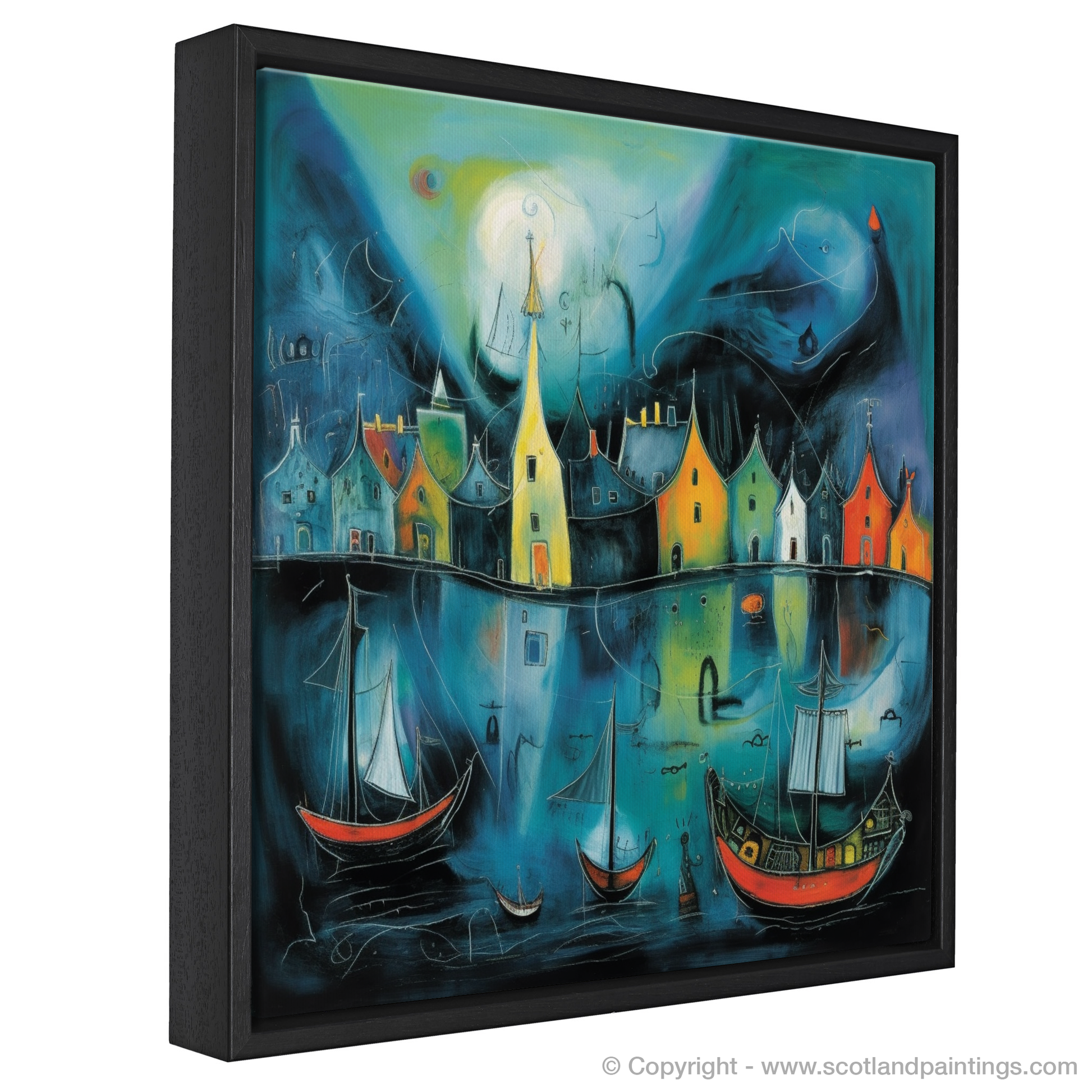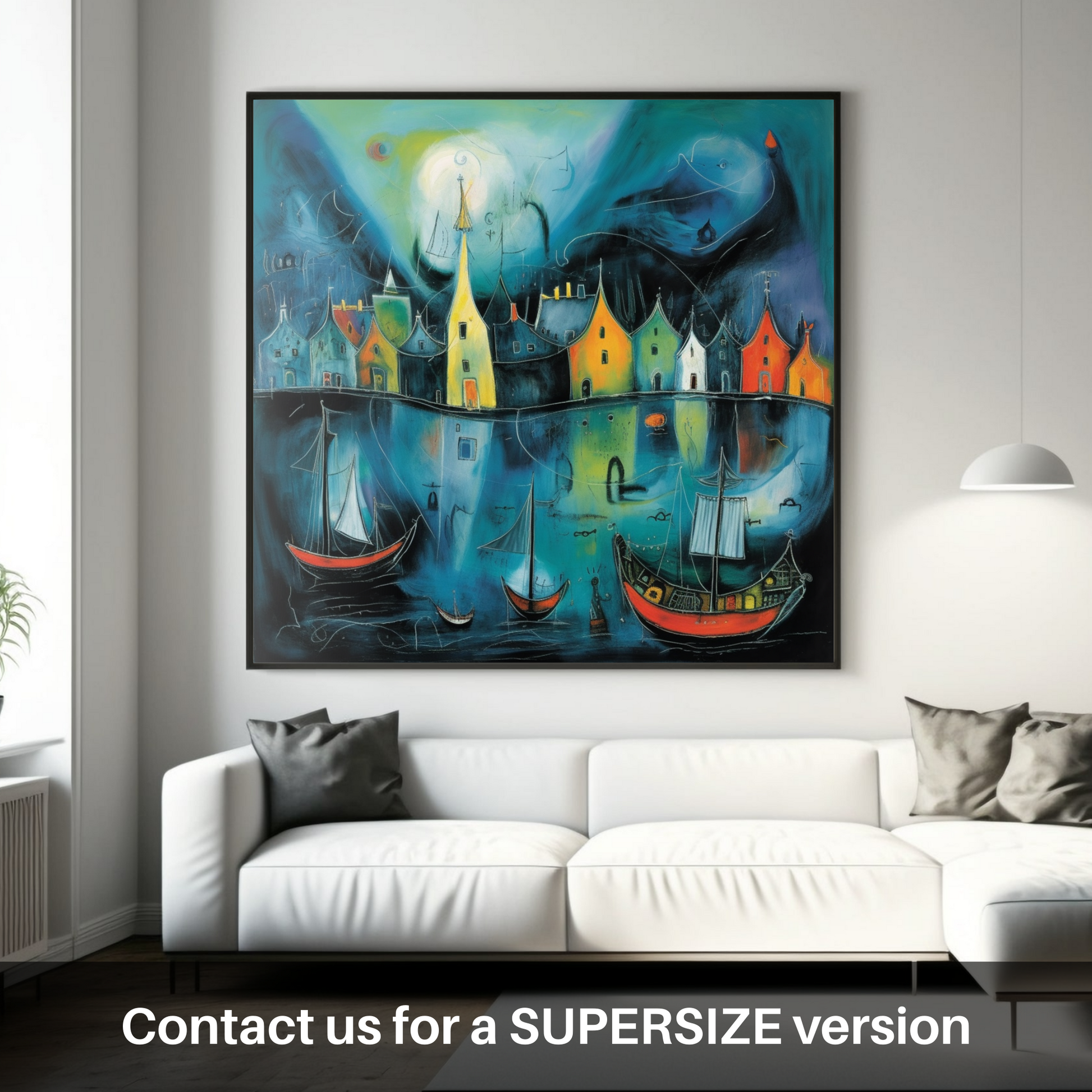 Immerse yourself in the whimsical charm of our stunning print, an ode to the enchanting Portree Harbour as viewed through a surreal lens. This artwork sets a dream-like scene, where the conventional limits of reality are gracefully suspended, allowing the viewer to step into a captivating world where imagination reigns supreme.