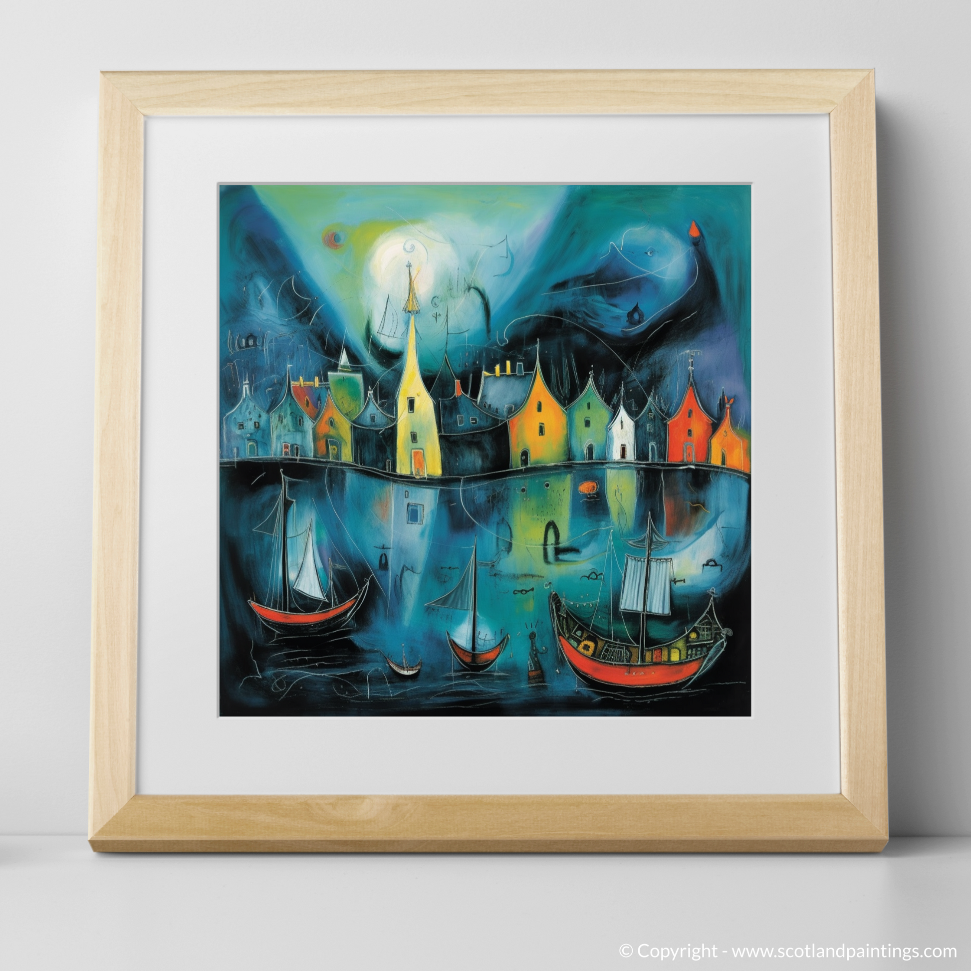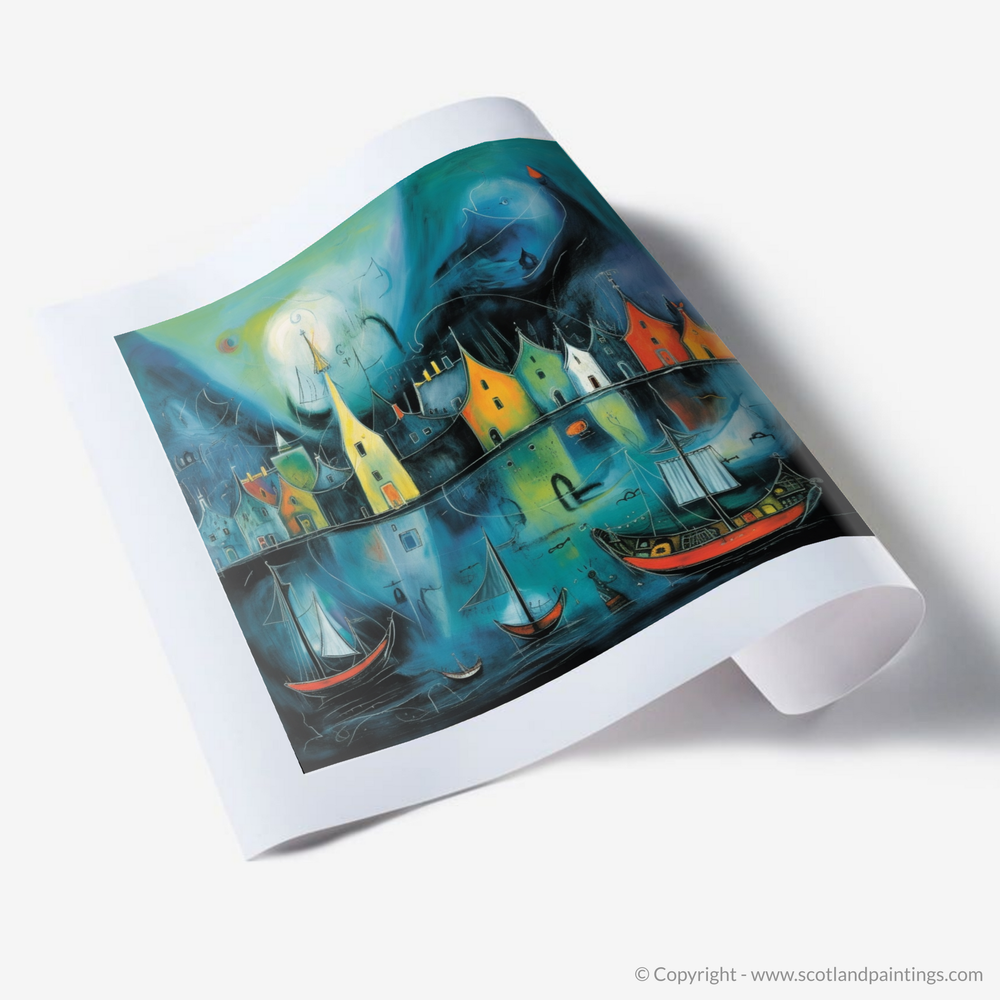 With its peculiar admixture of the quaint and the bizarre, this print invites the curious eye to linger, explore, and perhaps even to get lost within its fantastical symmetry. It's more than a mere depiction of Portree Harbour; it's a gateway to a world where reality is tenderly cradled by the arms of the surreal.