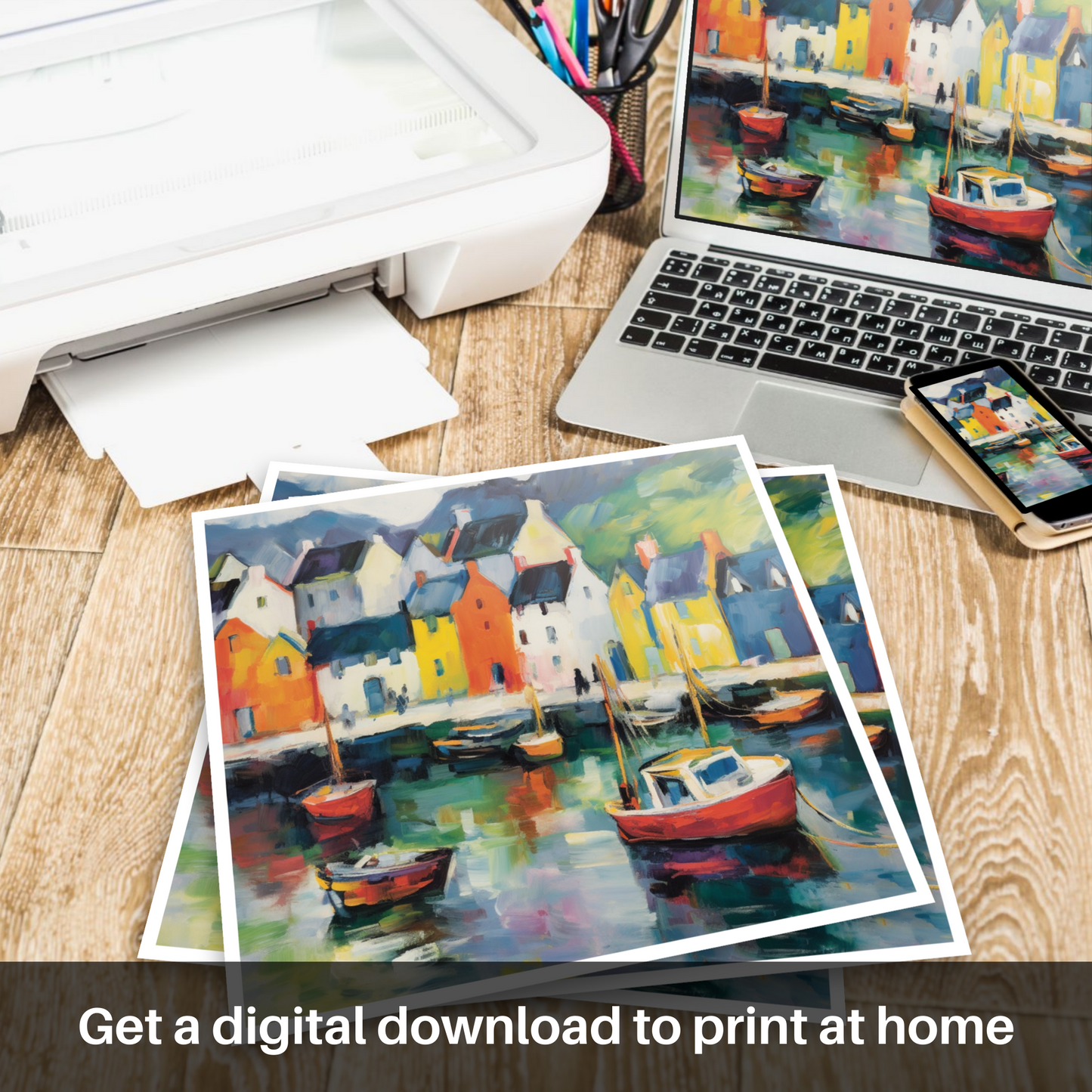 The background looms with hills shrouded in dynamic shades of green, creating a powerful contrast that frames the joviality of the harbour. This print is a symphony of colour and movement, capturing the laid-back rhythm of coastal life enlivened through a Fauvist lens, a standout piece within our 'Scottish Harbours' collection that promises to infuse any space with its intriguing blend of eclecticism and charm.