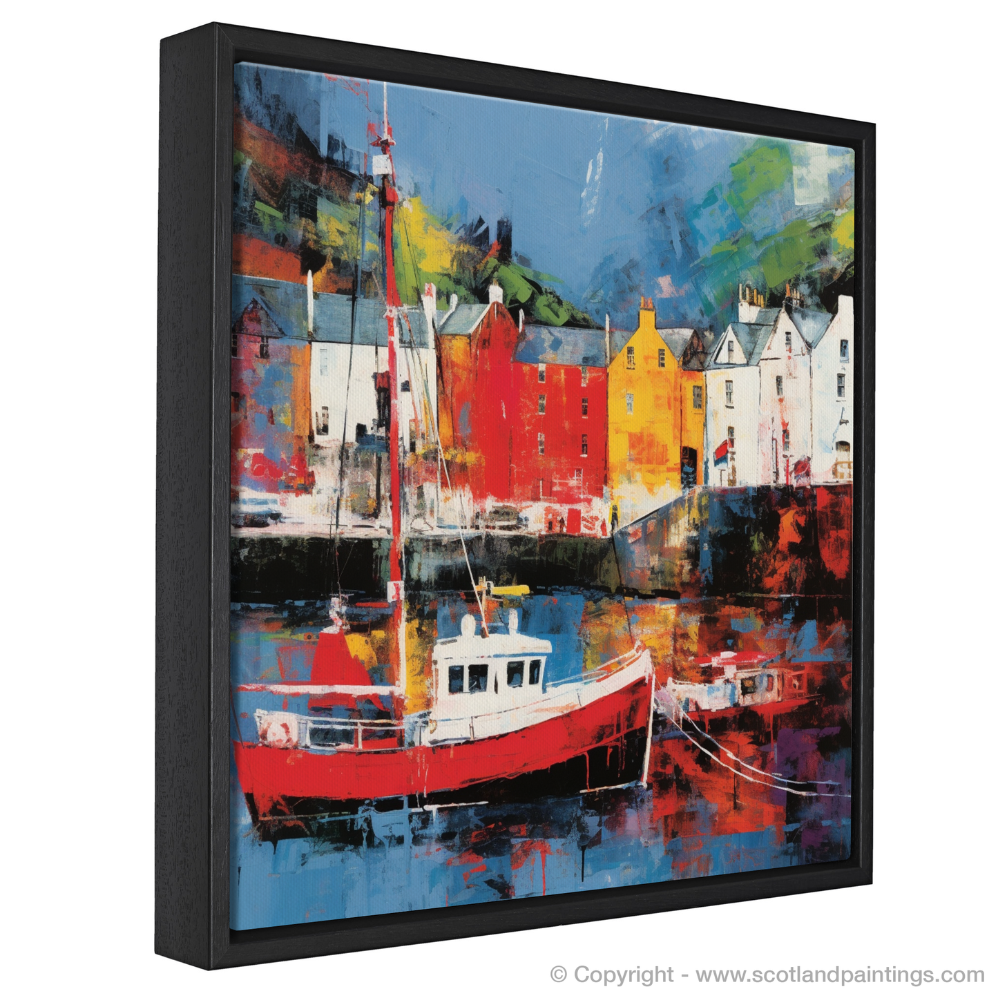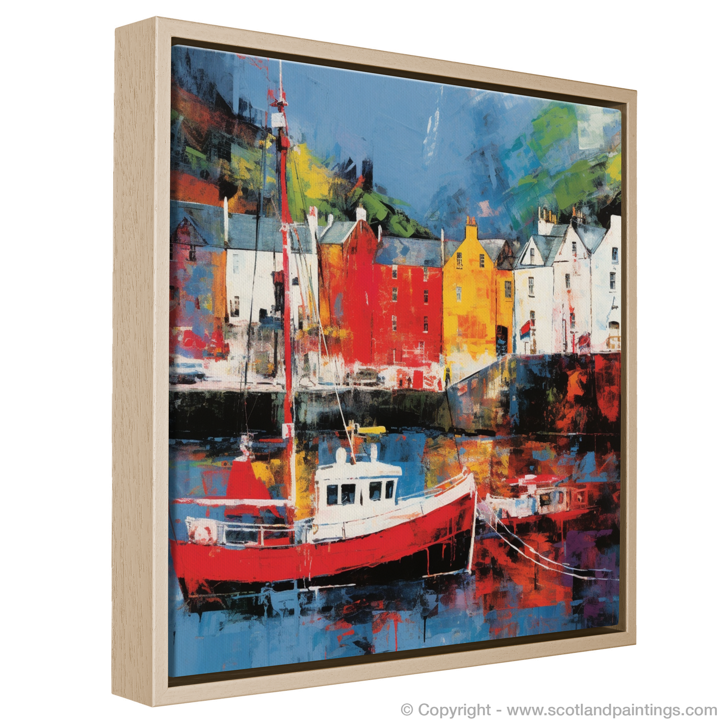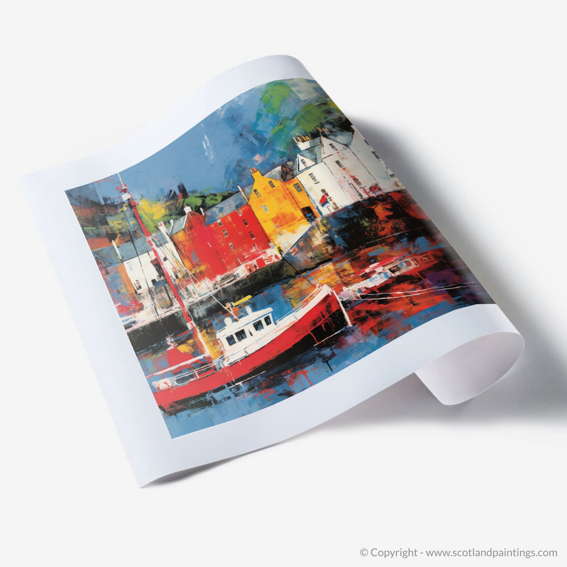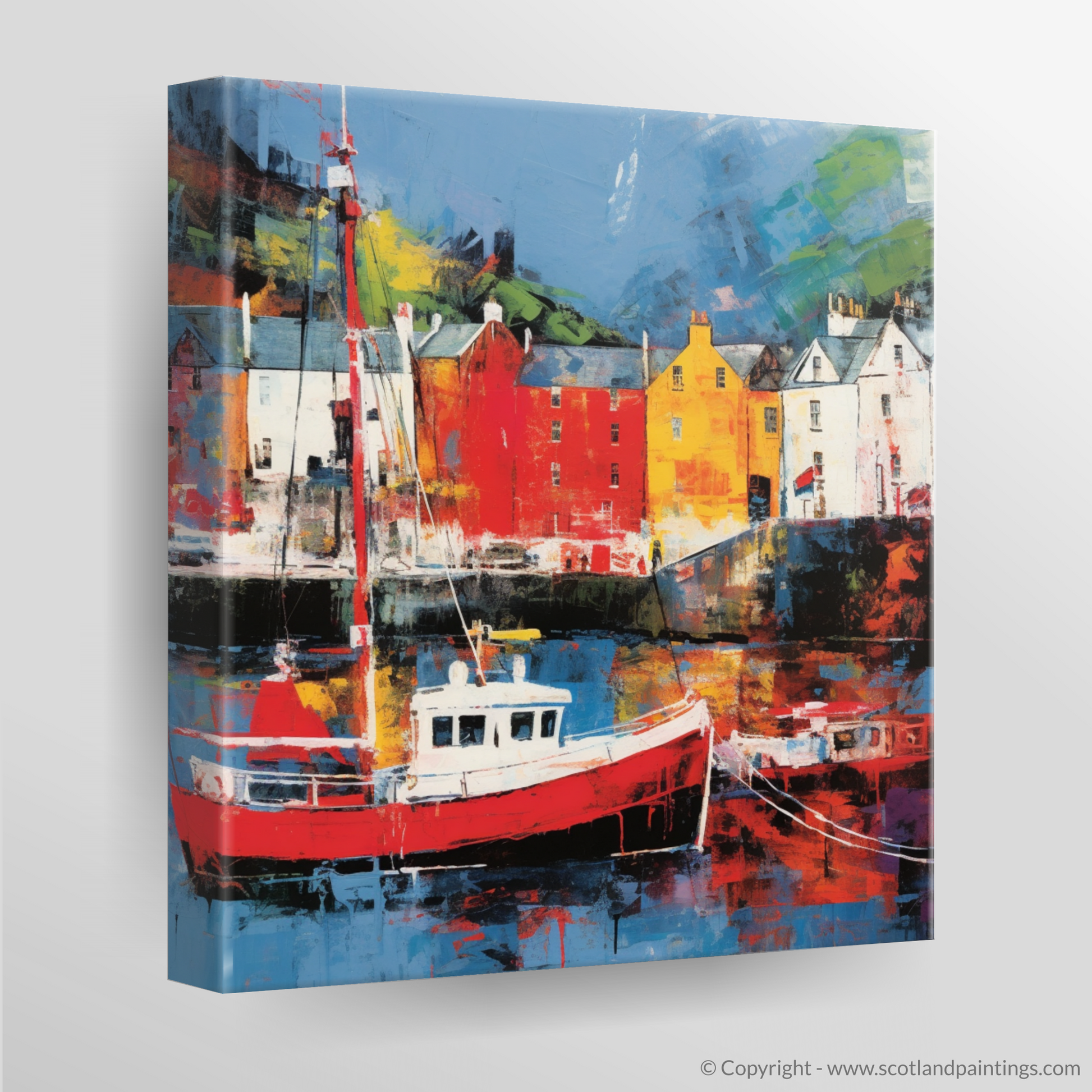 Immerse yourself in the vibrancy and vitality of the Scottish seaside with this striking piece that encapsulates the essence of Portree Harbour, a gem nestled on the Isle of Skye. Bold, saturated hues breathe life into the quaint architecture hugging the shoreline, with a vivid palette that captures the whimsical allure of this beloved maritime retreat.