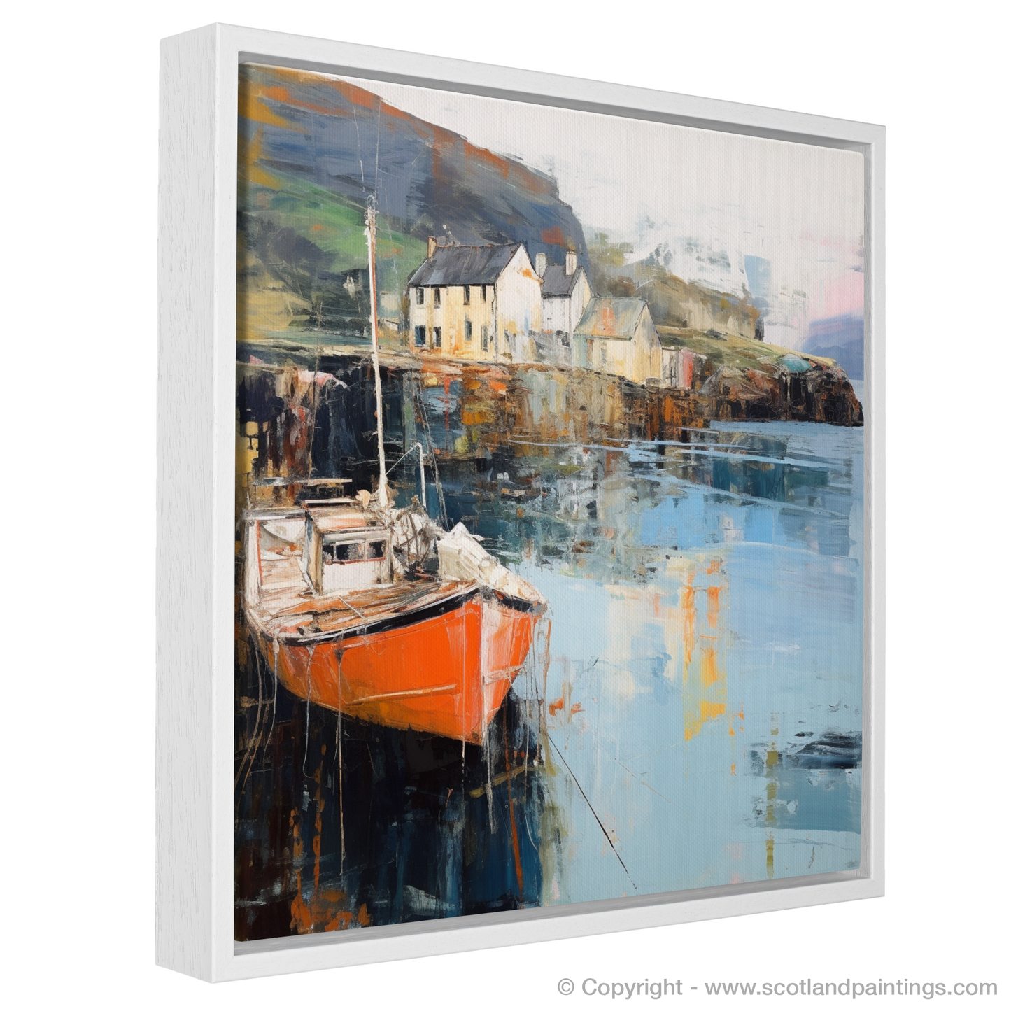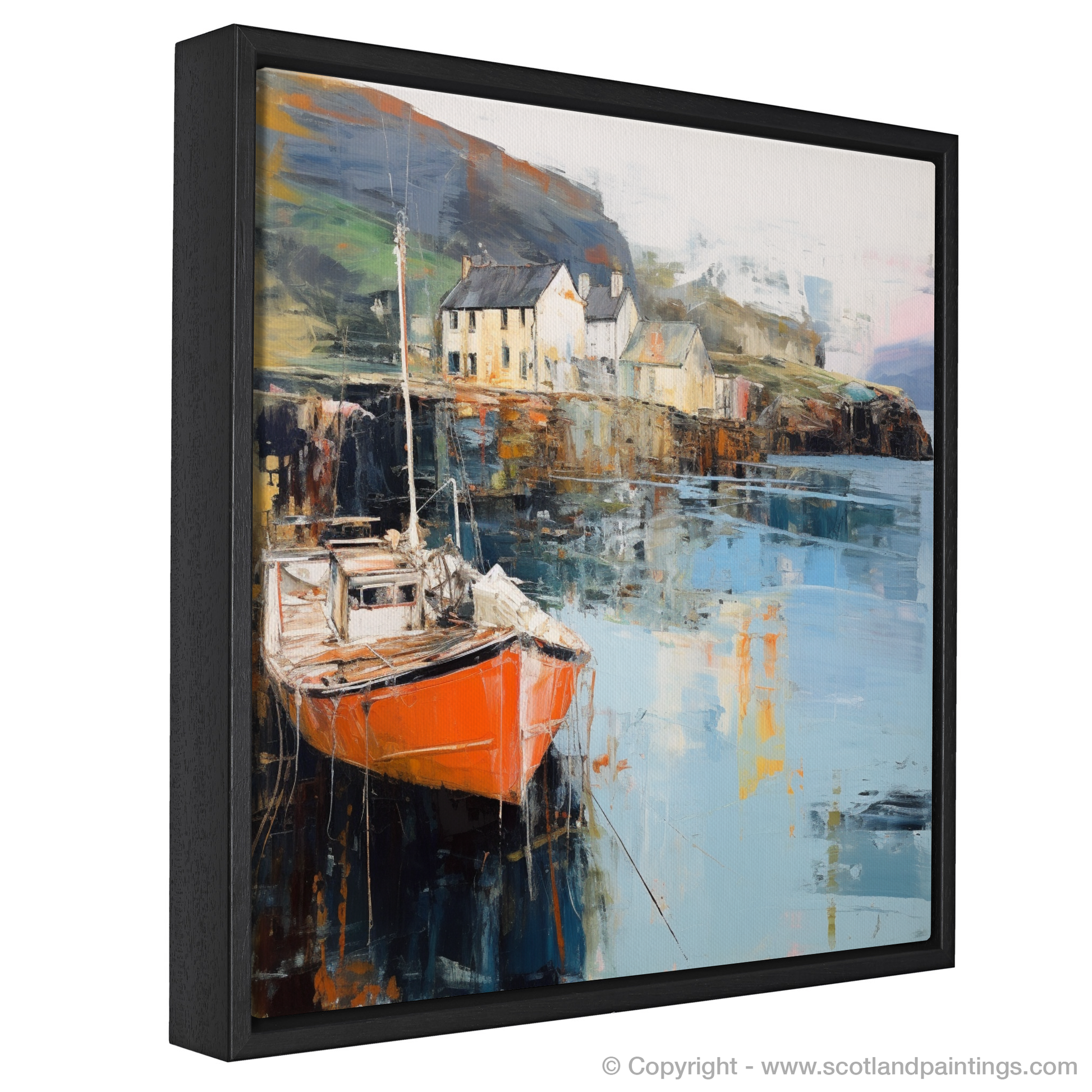 A vividly painted boat, steeped in hues of fiery orange and sombre reds, draws the eye as the focal point of the composition, audaciously contrasting with the cool, reflective water. Hints of muted yellows and soft whites emerge to signify the quaint harbourside buildings, their forms distilled to elemental shapes that dance between figuration and abstraction. The brooding hills in the background are rendered with a less defined touch, allowing them to recede into the misty highland air, suggestive of the enigmatic charm of Skye.