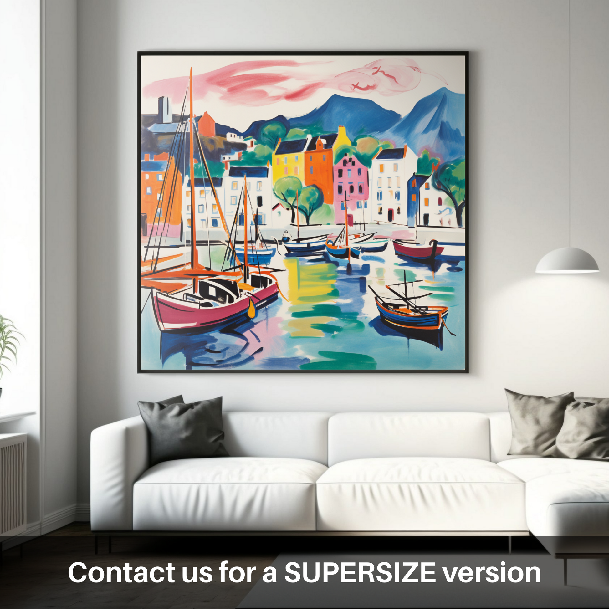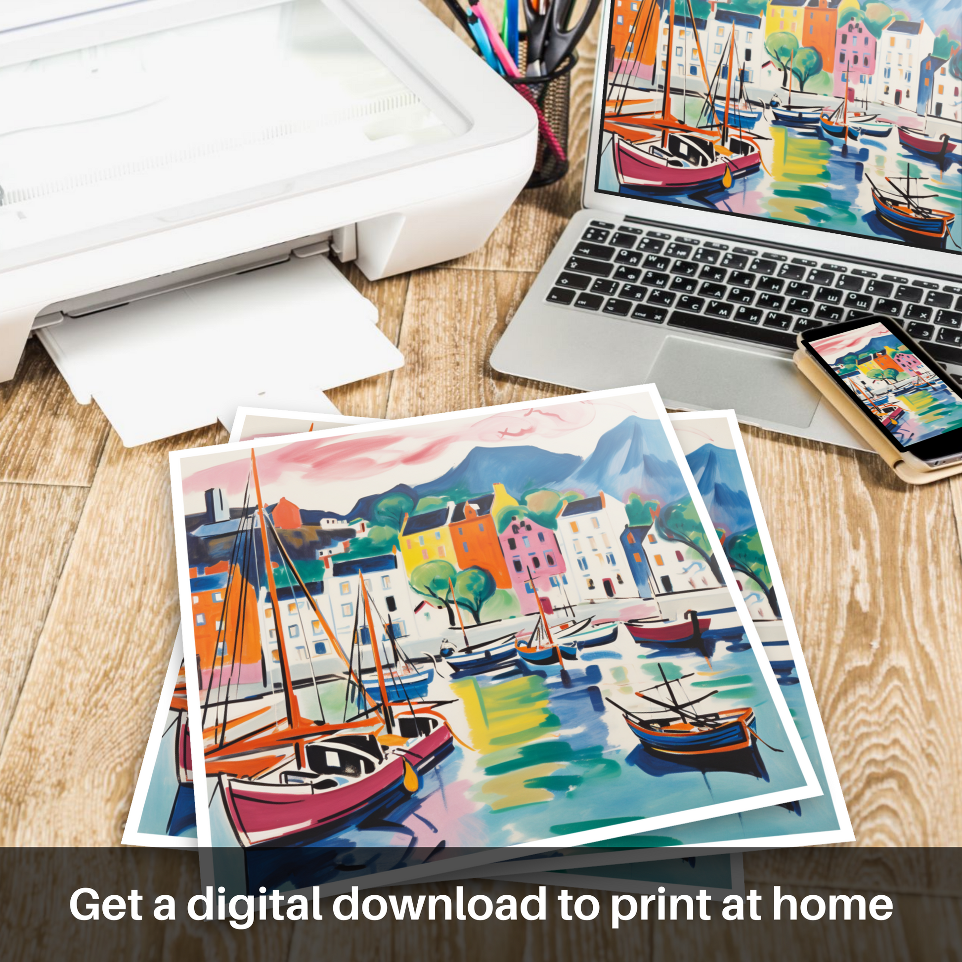 This print is a must-have addition to the 'Scottish Harbours' collection, promising to infuse any space with the life and energy of the Scottish coast, as seen through an exuberantly fauvist lens. Whether displayed in a coastal cottage or an urban abode, it invites viewers to immerse themselves in the dynamic interplay of colour and to experience Portree Harbour in a refreshingly expressive light.