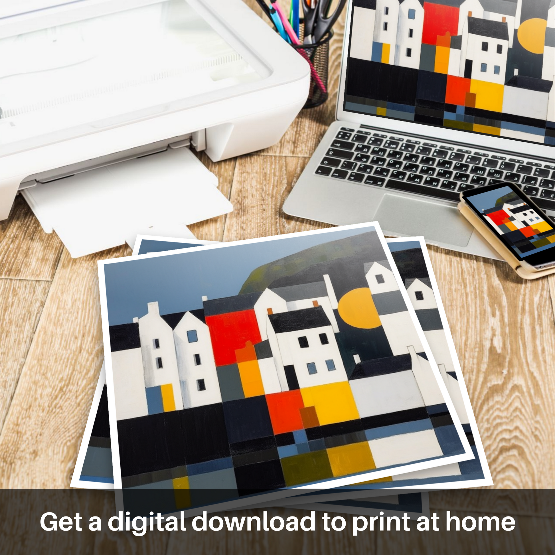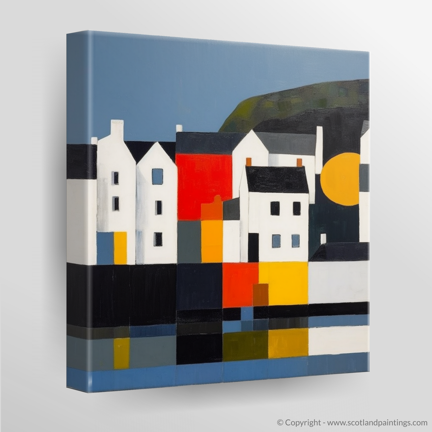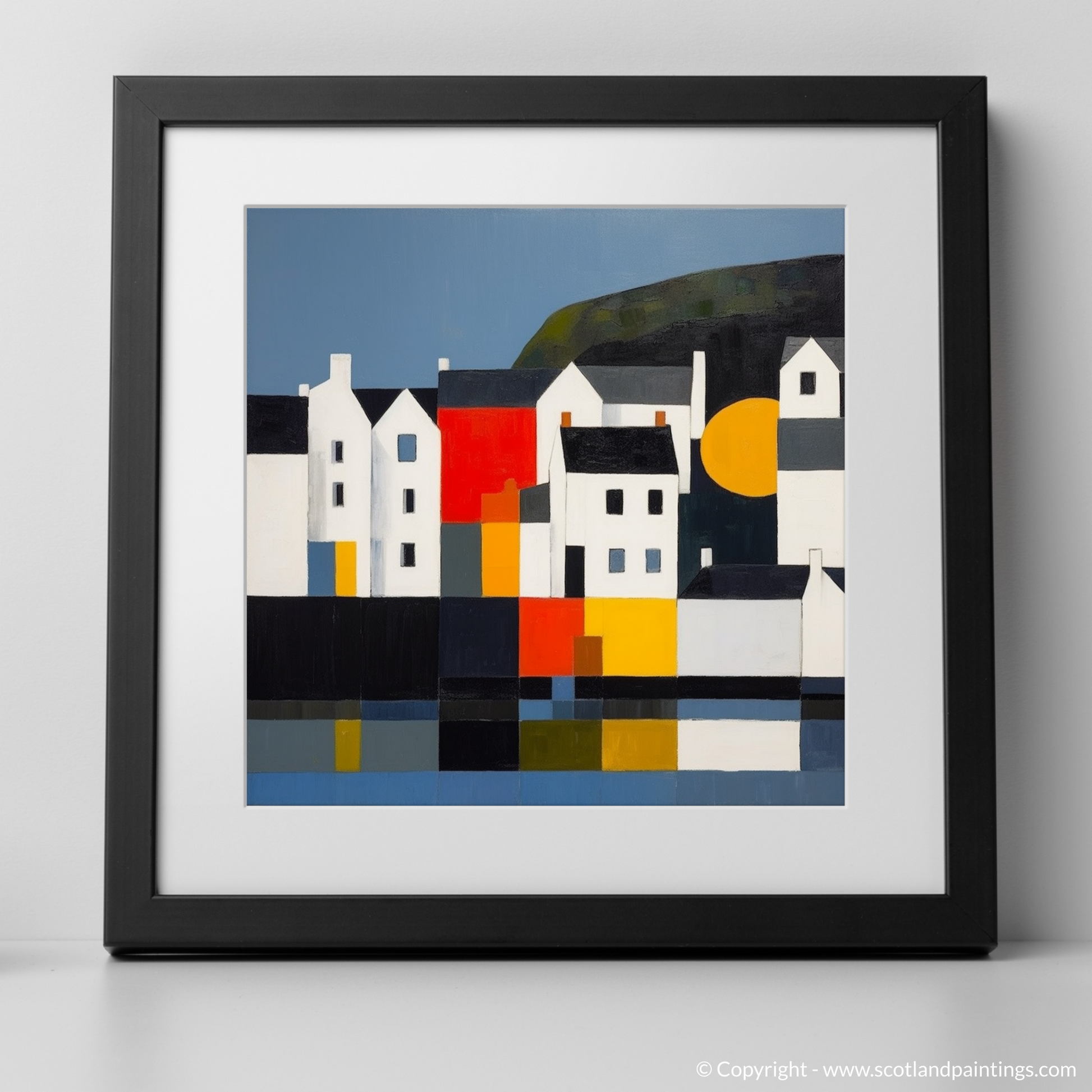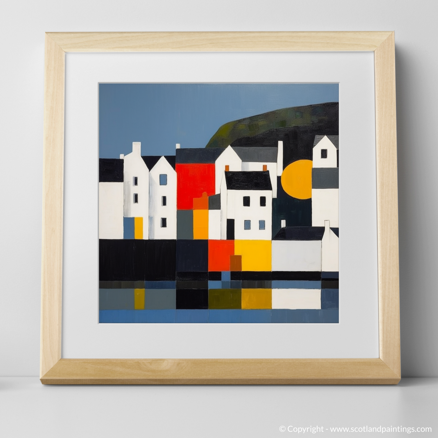 This print showcases a stylised array of buildings lining the waterfront, each portrayed as geometric forms and stripped of intricate detail to emphasise shape and colour over realism. Stark white structures stand adjacent to blocks of muted reds, warm yellows, and crisp blues, creating a harmonious and modern palette that reflects the unique character of the Scottish coast.