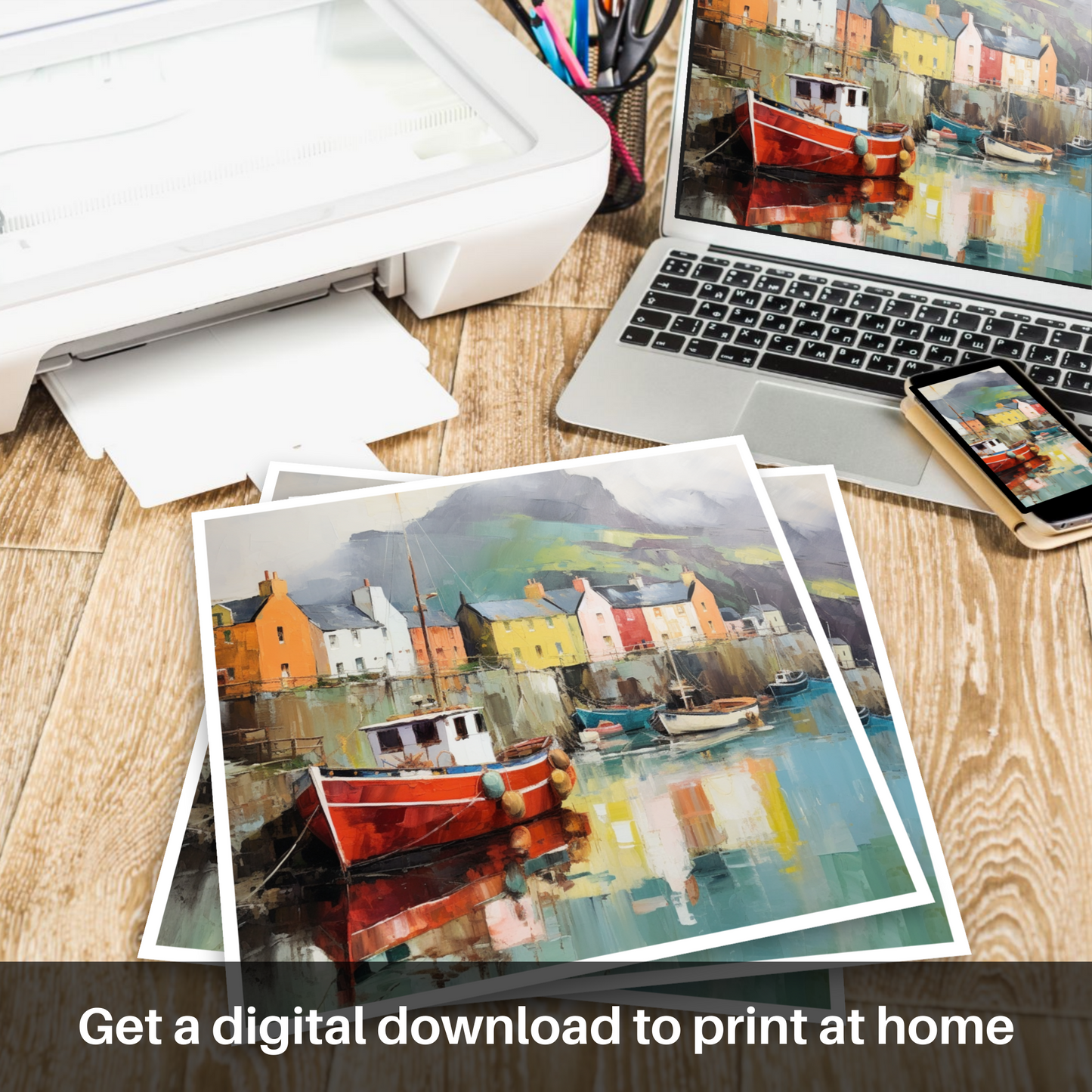 Step into a dreamscape where the whimsical essence of Portree Harbour intertwines with the fantastical. This surreal rendition captivates the observer with its playfully distorted sense of reality, where the tranquil waters reflect a scene both familiar and otherworldly. The vibrancy of life and colour seems to be caught in a dance, as the print boasts a palette of rich hues, bathing the idyllic Scottish harbour in an ethereal light.