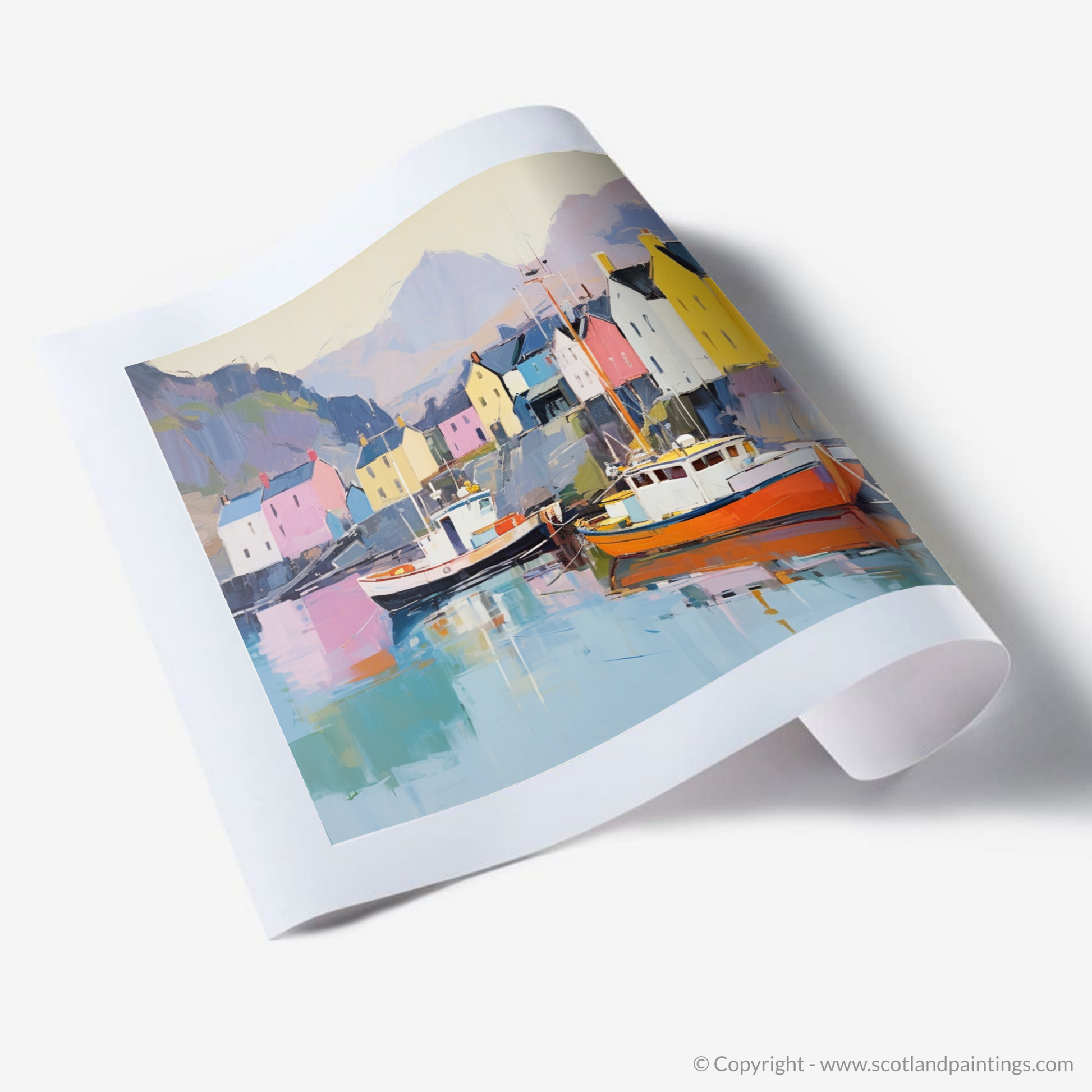 Warm oranges and deep reds of the nearest vessels contrast sharply with the cool blues and purples that hint at the Scottish chill. A shore lined with quaint houses in shades of pink, yellow, and blue, sporting fine details on their facades, adds a charming touch of life and vibrancy to the scene. The softened edges and large areas of unbroken colour create an almost ethereal atmosphere, inviting the viewer to feel the quiet and soothing ambience of a remote maritime landscape.