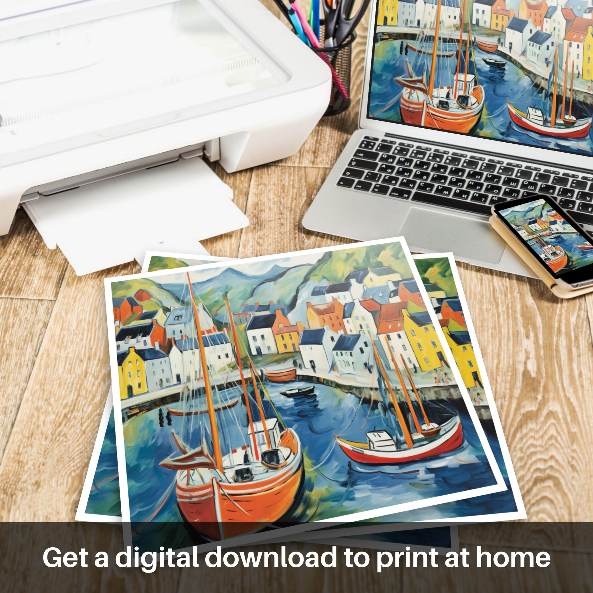 Each stroke of this piece communicates not just a location, but the very spirit of the place – a haven of peace and activity, with the pleasantries of village life set against nature's grand theatre. This print invites viewers to lose themselves in a splash of colour and emotion, celebrating the magnetic draw of Scottish Harbours and the raw beauty they magnificently convey.