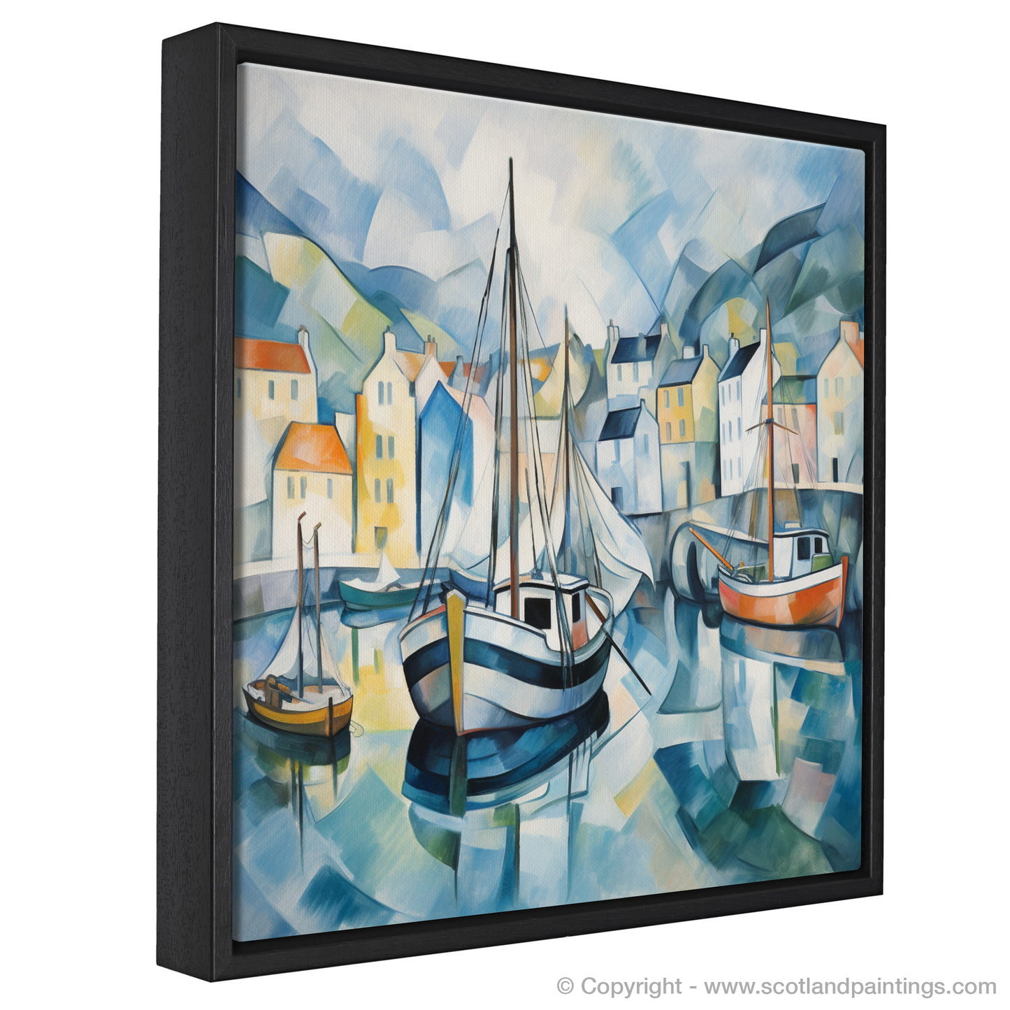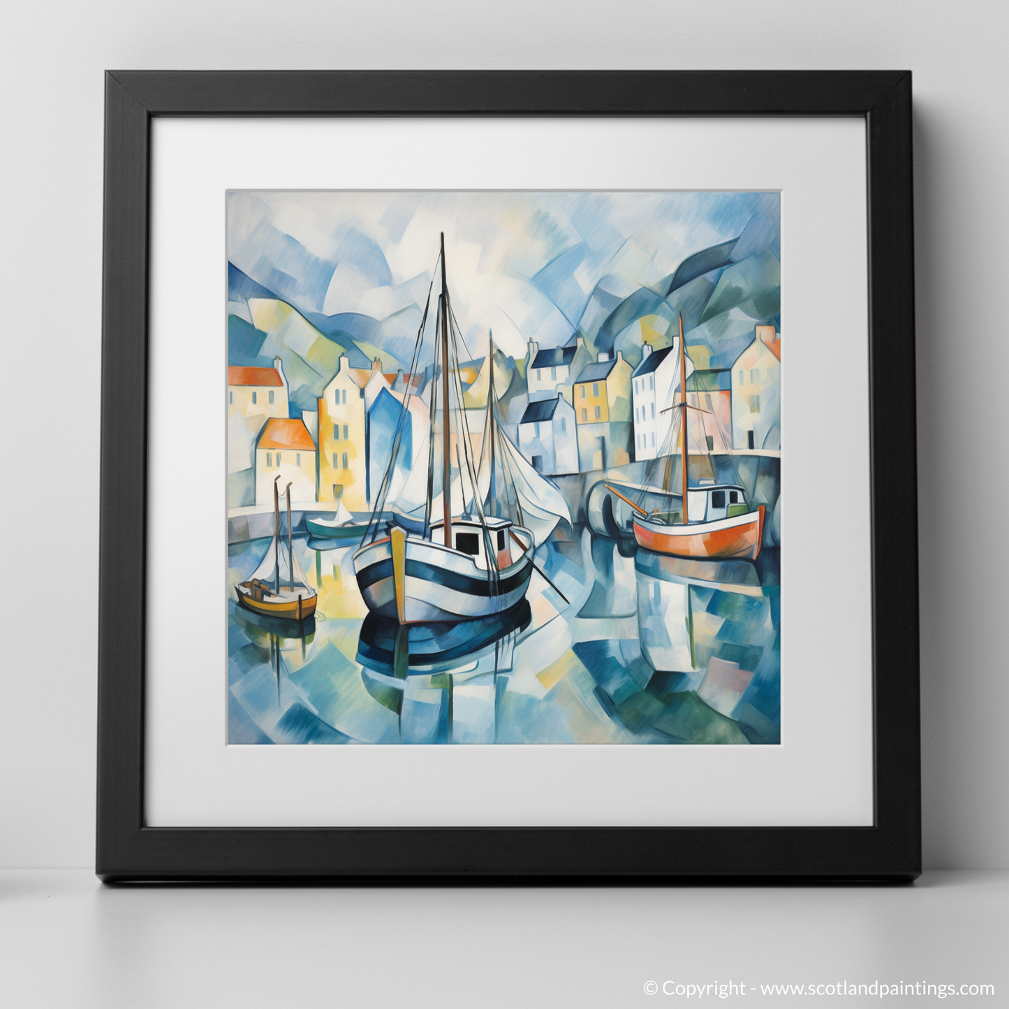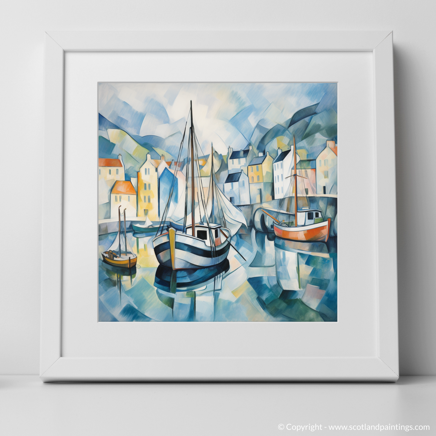 Behind these central figures, a patchwork of houses rises up. Their facades, a kaleidoscope of pastel yellows, soft oranges, and creamy whites, twist and turn under the cubist lens, creating a dream-like vision of this beloved Scottish locale. Gently rolling hills, reduced to curving swaths of blue and green, cradle the harbour in a protective embrace, their subdued tones complementing the vibrant harbour life.