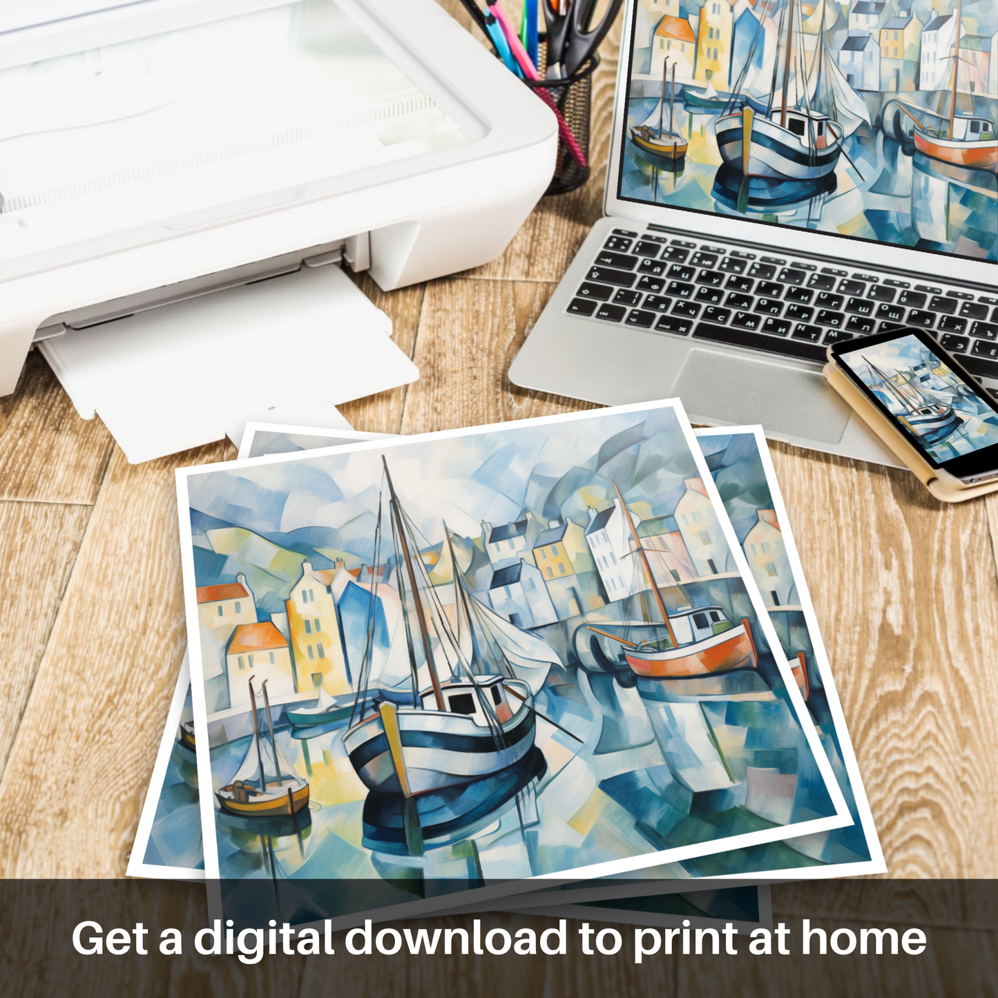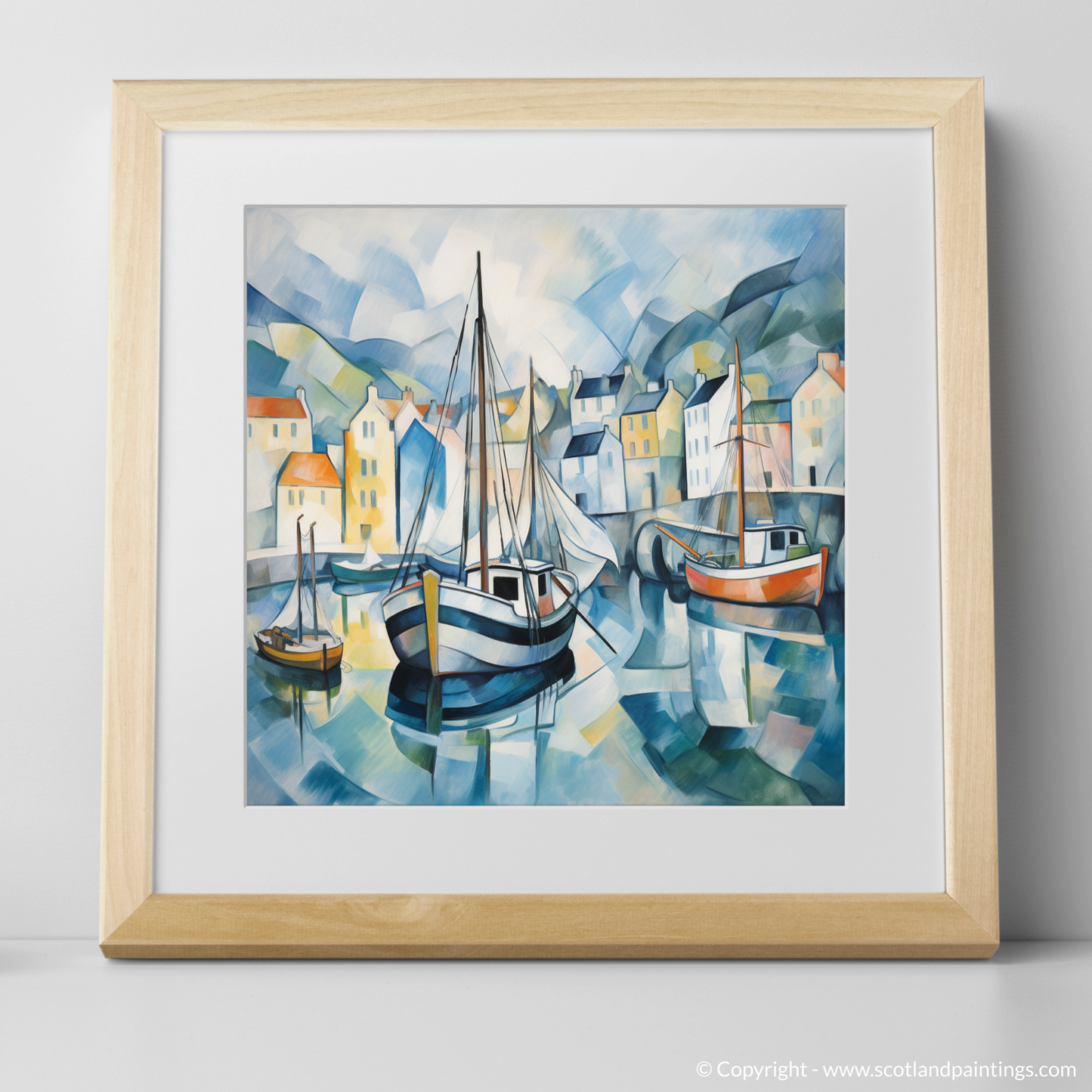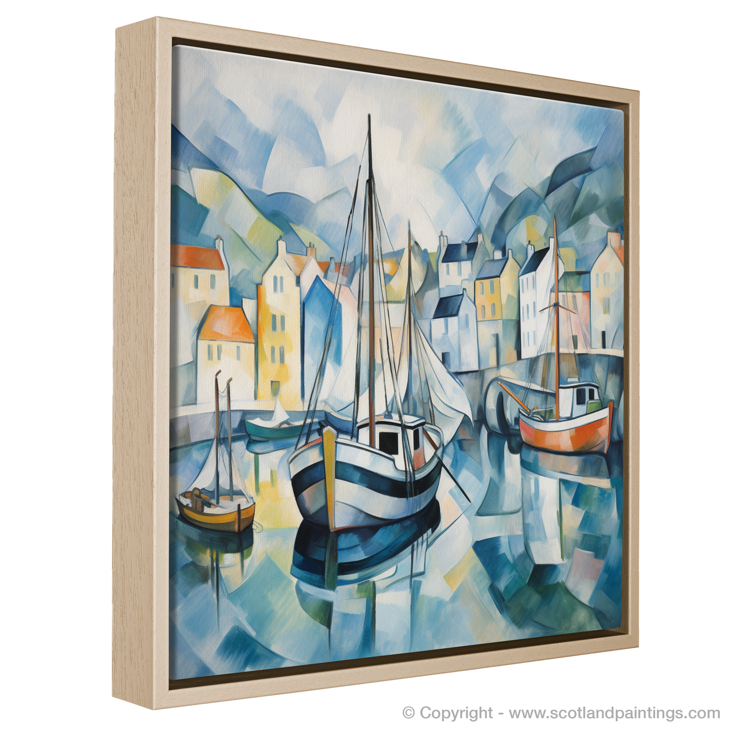 Behind these central figures, a patchwork of houses rises up. Their facades, a kaleidoscope of pastel yellows, soft oranges, and creamy whites, twist and turn under the cubist lens, creating a dream-like vision of this beloved Scottish locale. Gently rolling hills, reduced to curving swaths of blue and green, cradle the harbour in a protective embrace, their subdued tones complementing the vibrant harbour life.