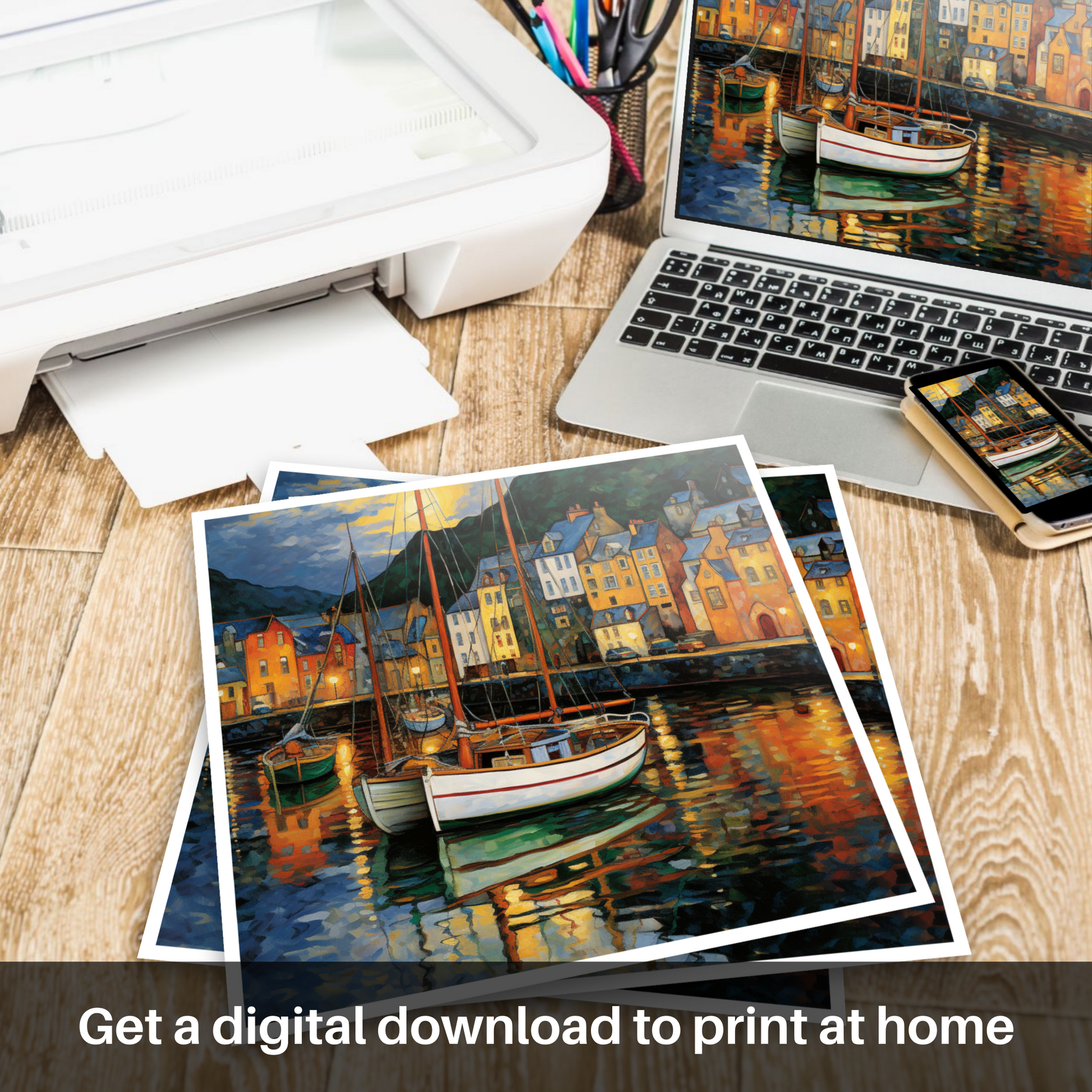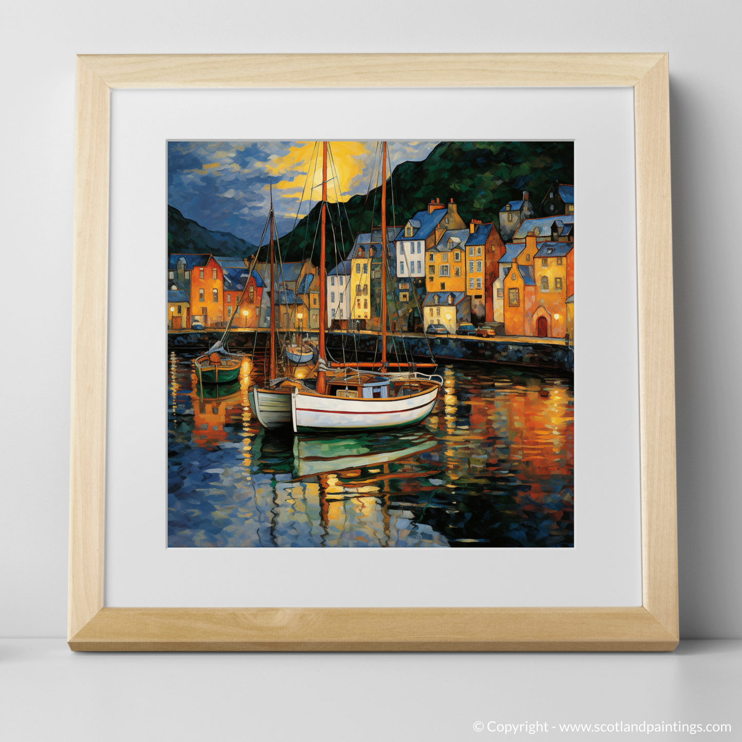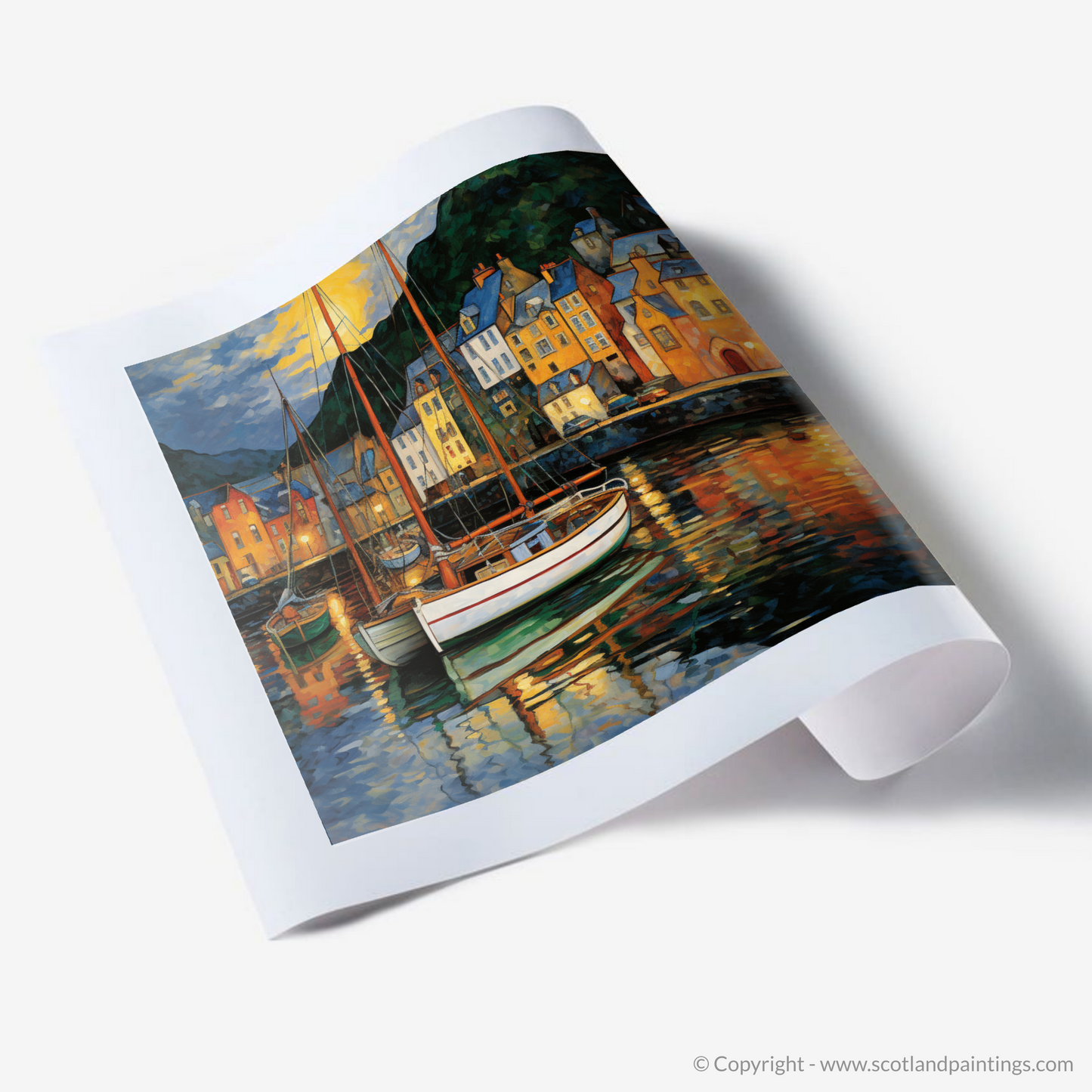 The undulating hills that cradle the harbour add a dramatic backdrop to the scene, their dark silhouettes setting the stage for the natural beauty synonymous with the Scottish Highlands. The print beckons its admirers to lose themselves in a moment suspended between day and night, where the warmth of a small community meets the grandeur of nature.