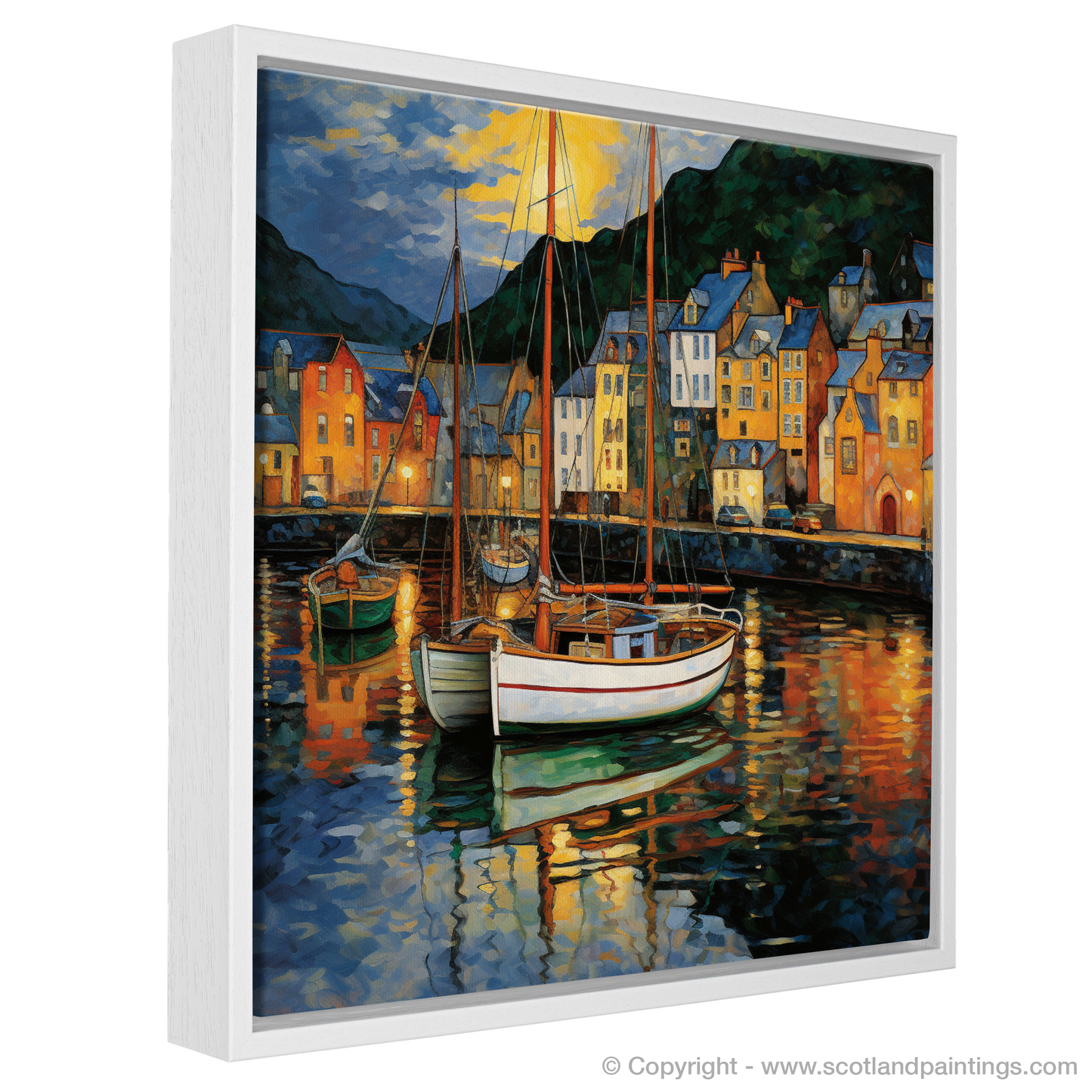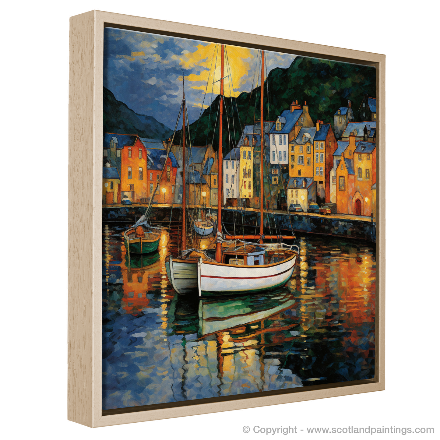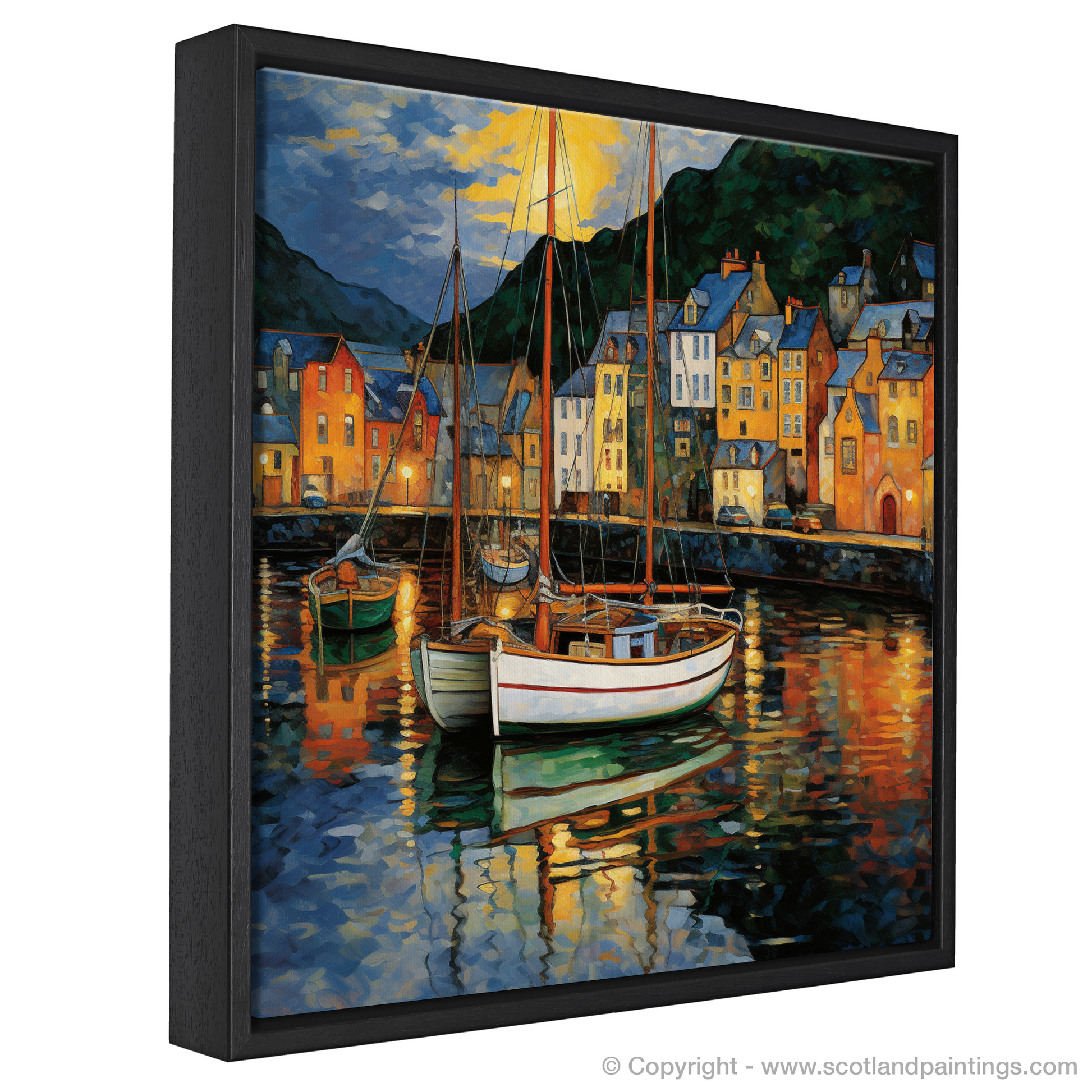 The undulating hills that cradle the harbour add a dramatic backdrop to the scene, their dark silhouettes setting the stage for the natural beauty synonymous with the Scottish Highlands. The print beckons its admirers to lose themselves in a moment suspended between day and night, where the warmth of a small community meets the grandeur of nature.
