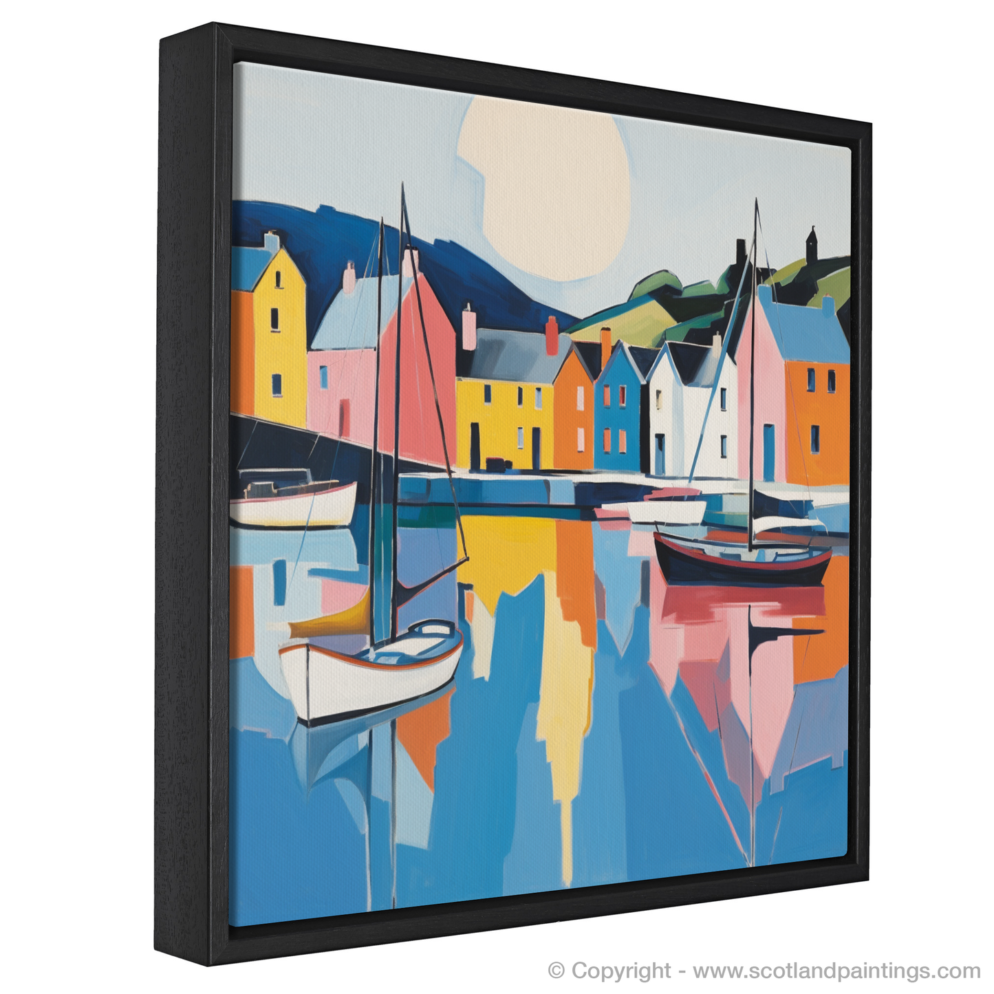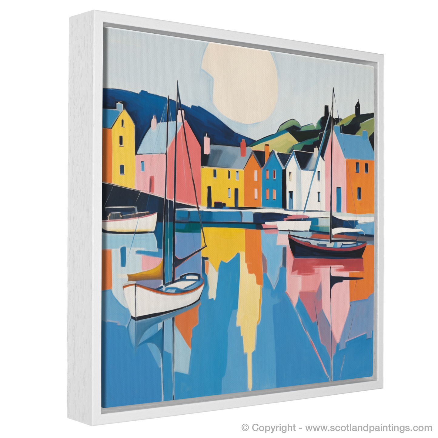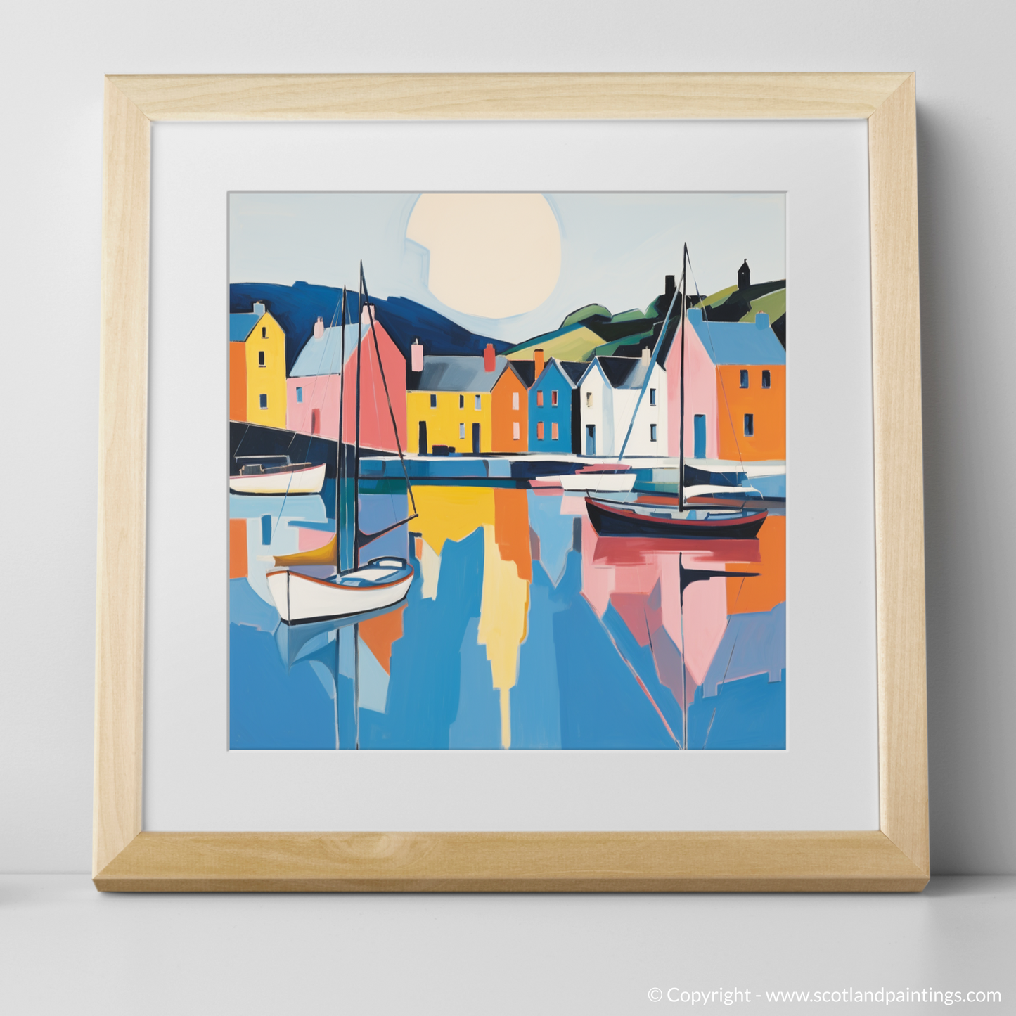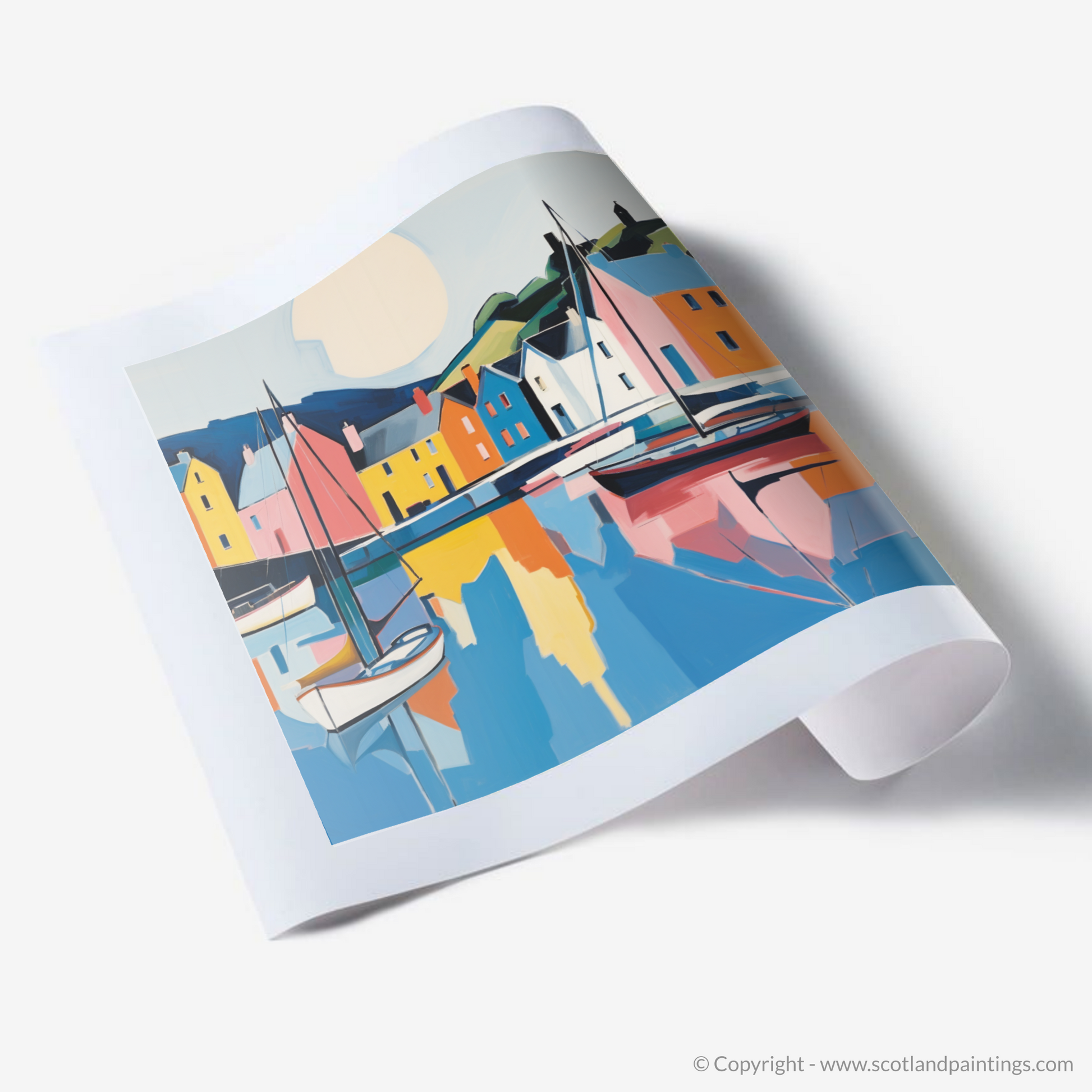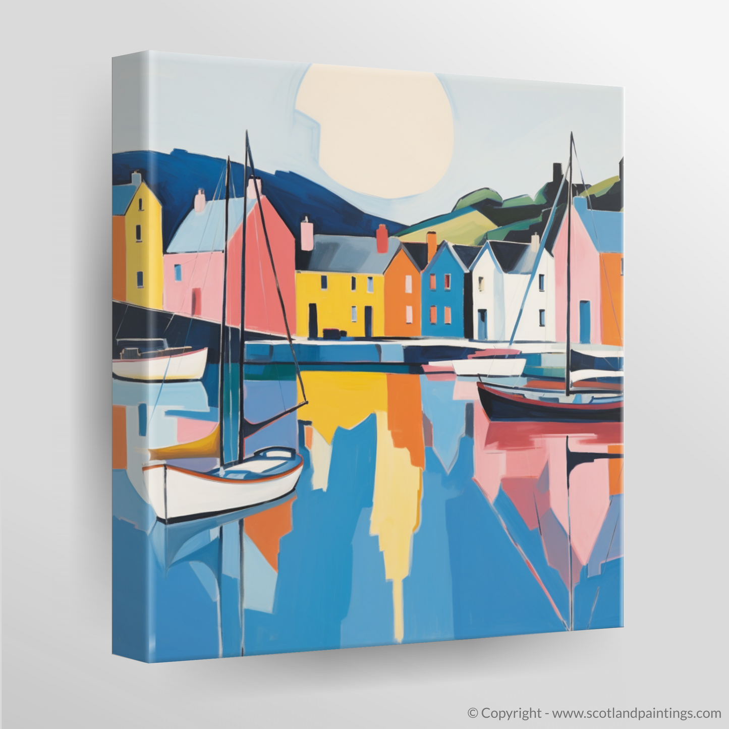Sail into the serene beauty of Scotland's shores with this vibrant print, capturing the quintessence of Portree Harbour on the Isle of Skye. A tranquil mosaic of colour stretches across the canvas, where minimalism meets the majesty of the coastal scape. Bold blocks of primary hues evoke the idyllic painted houses that stand sentinel along the water's edge, while gentle pastels reflect the harbour's calm.