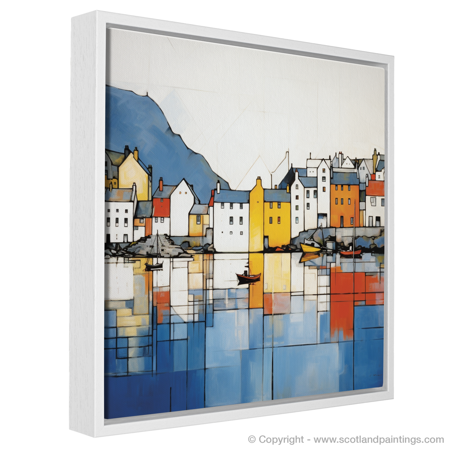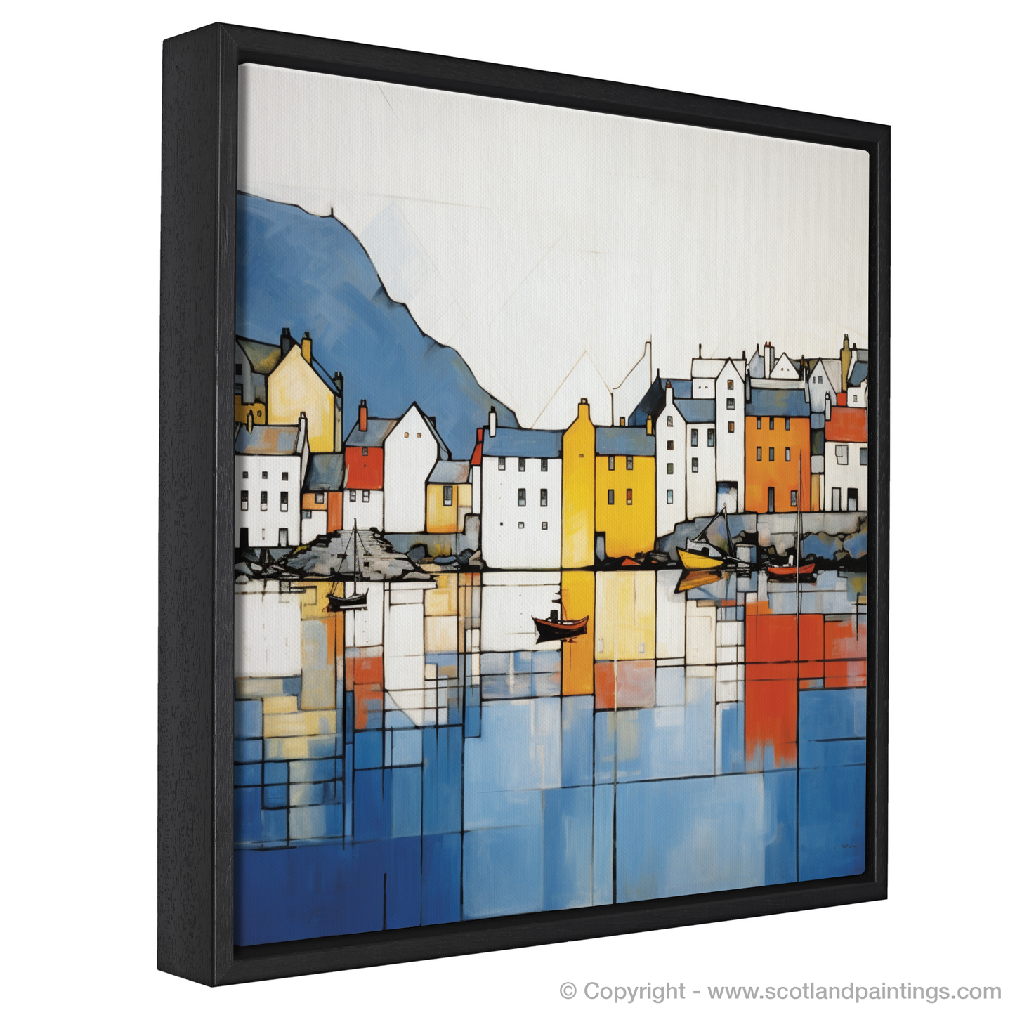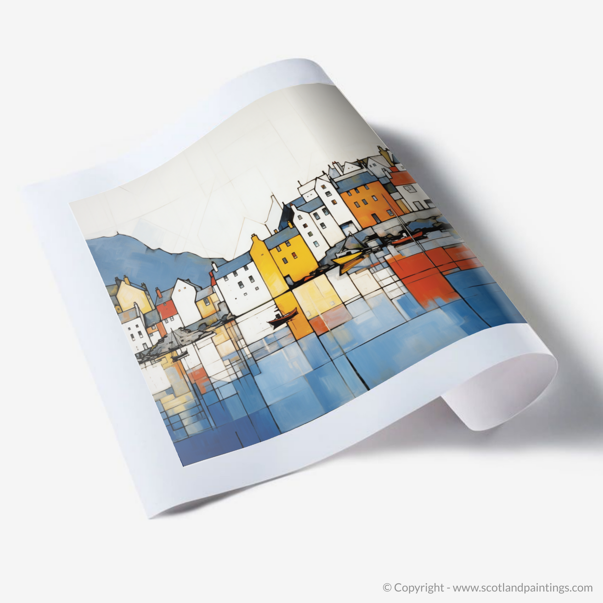 Capturing the essense of a vibrant harbour town, this striking piece brings the serene beauty of the Isle of Skye's Portree Harbour to your space. Employing a compelling abstract approach, the image deconstructs the scenic waterfront into a tapestry of bold colours and geometric forms. Squares and rectangles dance in a harmonious balance, reflecting the ebb and flow of maritime life.