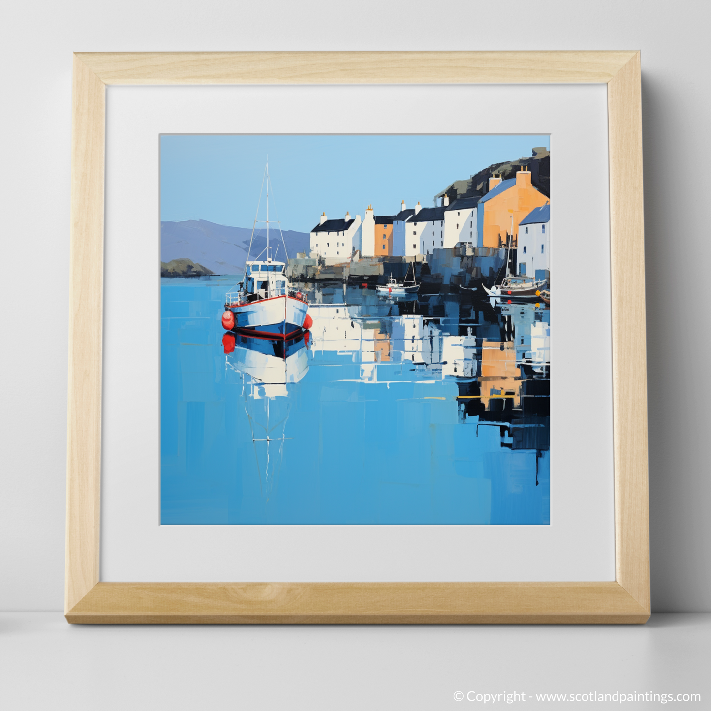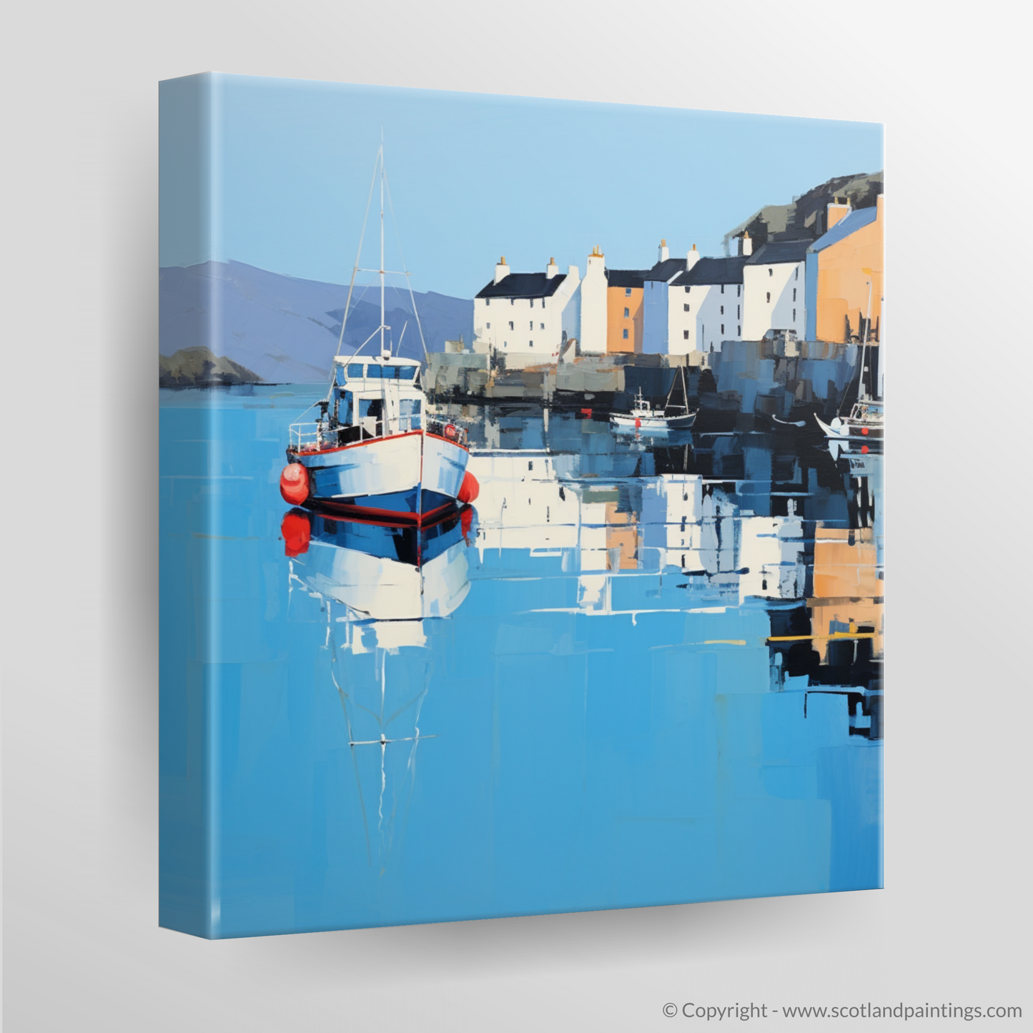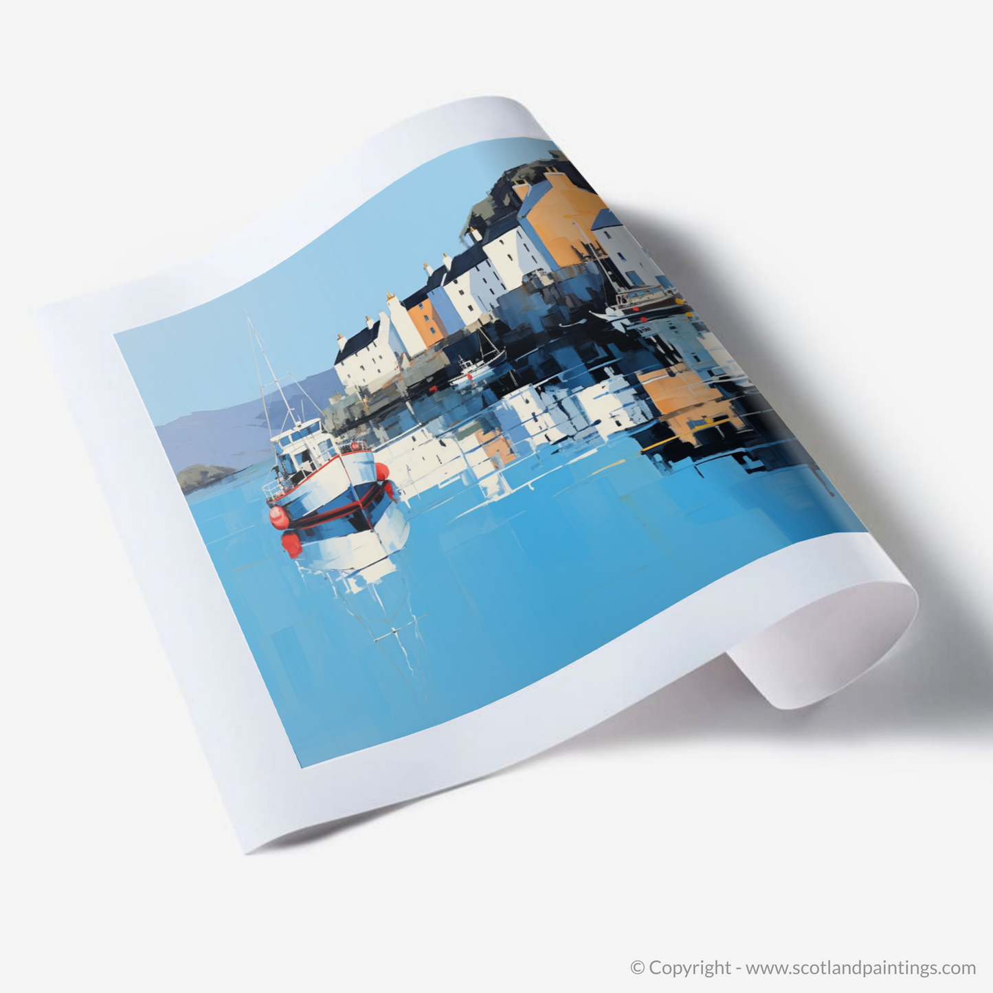 Immerse yourself in the tranquil beauty of Scotland's coastal charm with this evocative print, encapsulating the serene essence of Portree Harbour, Isle of Skye. Through an alluring minimalist approach, the artwork masterfully distills the picturesque scene to its most fundamental elements, inviting contemplation and serene reflection.