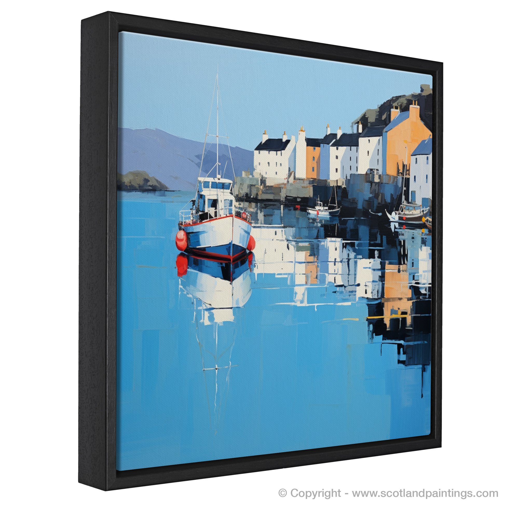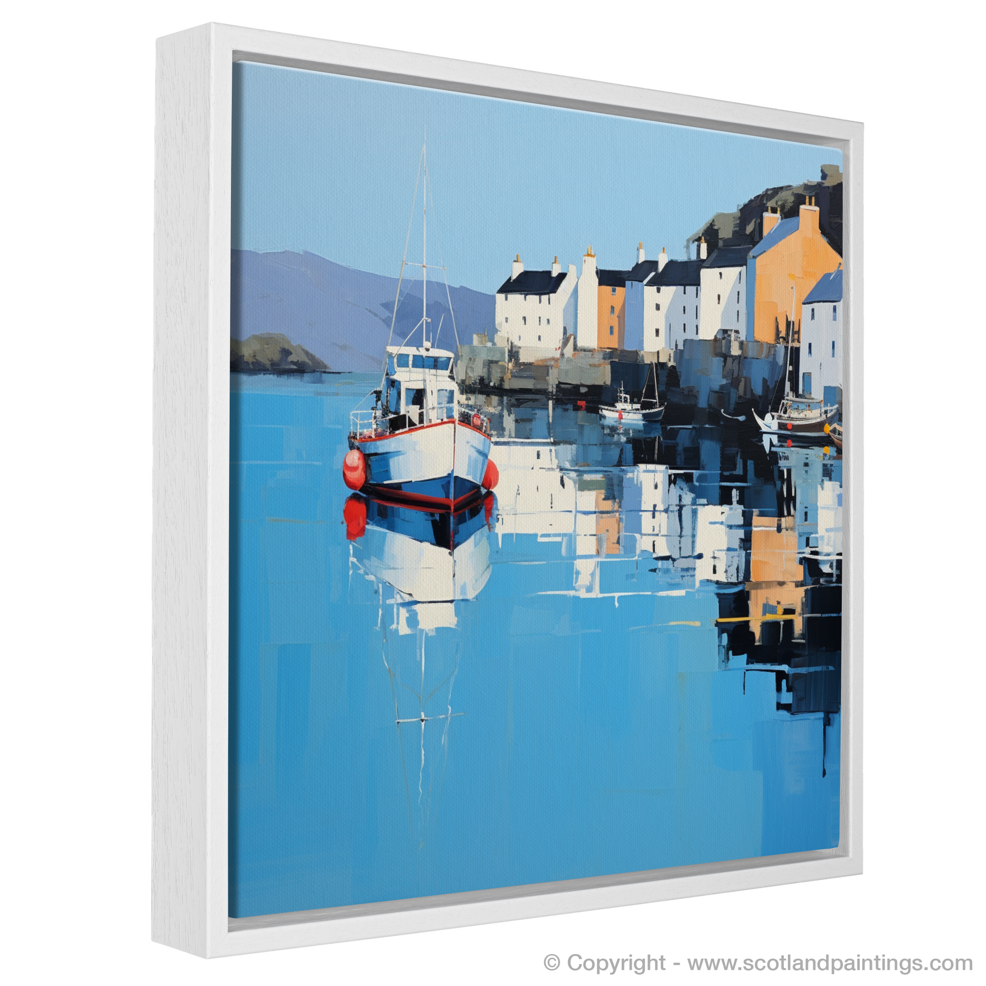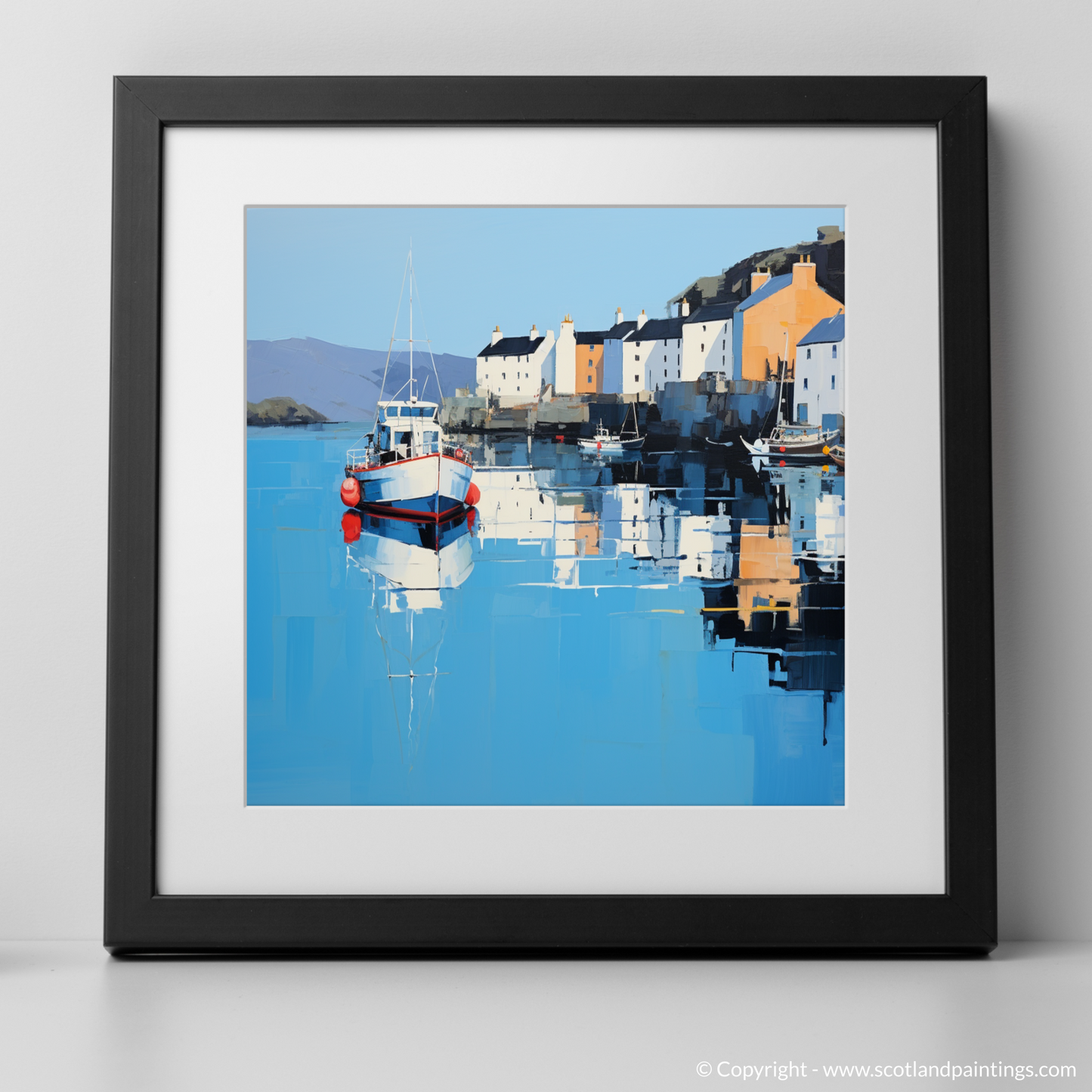 Immerse yourself in the tranquil beauty of Scotland's coastal charm with this evocative print, encapsulating the serene essence of Portree Harbour, Isle of Skye. Through an alluring minimalist approach, the artwork masterfully distills the picturesque scene to its most fundamental elements, inviting contemplation and serene reflection.