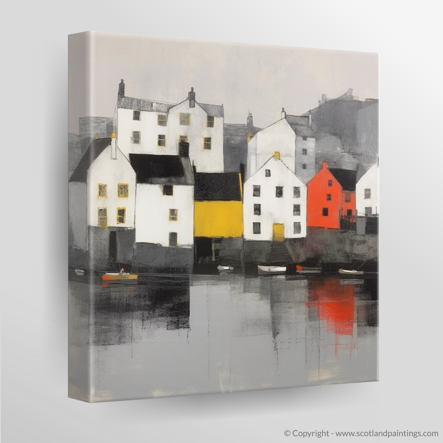 A palette dominated by soothing greys, stark whites, and the subtlest hints of blue, breathes life into a row of quaint harbour buildings. The clarity of form and superb balance of this minimalist composition imbue a sense of peaceful isolation and distinguished simplicity. The viewer's eye is drawn to the bold splashes of yellow and red, gracefully anchoring the centre of the artwork, reflecting the unique character of this coastal gem.